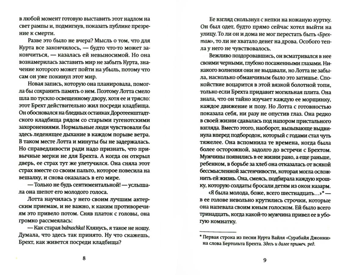 В середине 1920-х годов актриса Лотта Ленья (настоящее имя - Каролина Вильгельмина Шарлотта Бламауэр) встречает будущего мужа, композитора Курта Вайля, под руководством которого шлифует свое мастерство и в 1928-м исполняет роль пиратки Дженни в «Трехгрошовой опере» Бертольта Брехта, что становится отправной точкой в ее артистической карьере. Опираясь на документальный и эпистолярный материал, Ева Найс дает срез яркой и многообразной культурной жизни Германии накануне Второй мировой войны. Автор тонко и эмоционально рассказывает историю Лотты Ленья, которая была связана со многими известными людьми театрального и музыкального мира своего времени и покоряла современников особенным по тембру и выразительности голосом. Ева Найс родилась в 1977 году, имеет степень магистра литературы и бакалавра психологии. В своем творчестве она удачно балансирует между вымыслом и реальностью.| Издательство | Изд. Ивана Лимбаха |