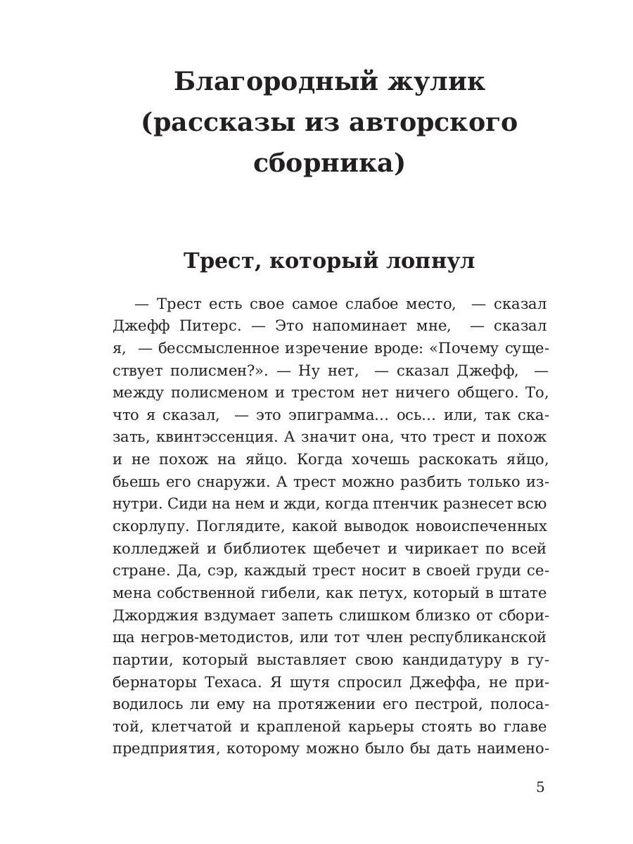 Один из самых известных юмористов в мировой литературе, О. Генри создал уникальную панораму американской жизни на рубеже XIX-XX веков, в гротескных ситуациях передал контрасты и парадоксы своей эпохи, открывшей простор для людей с деловой хваткой, которых игра случая то возносит на вершину успеха, но низвергает на самое дно жизни. Включены следующие рассказы из сборника «Благородный жулик» в переводе К. Чуковского: «Трест, который лопнул», «Джефф Питере как персональный магнит», «Развлечения современной деревни», «Кафедра филантроматематики», «Рука, которая терзает весь мир», «Супружество как точная наука», «Стриженный волк» и другие.| Издательство | Т8 RUGRAM |
