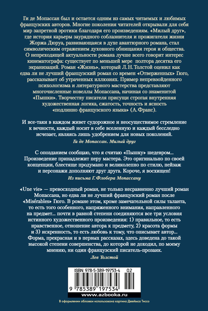 Ги де Мопассан был и остается одним из самых читаемых и любимых французских авторов. Многие поколения читателей открывали для себя мир запретной эротики благодаря его произведениям. "Милый друг", где история карьеры заурядного соблазнителя и прожигателя жизни Жоржа Дюруа, развивающаяся в духе авантюрного романа, стал символическим отражением духовного обнищания героя и общества. О непреходящей актуальности романа лучше всего говорит интерес кинематографа: существует по меньшей мере полтора десятка его экранизаций. Роман "Жизнь", который Л. Н. Толстой оценил как "едва ли не лучший французский роман со времен "Отверженных" Гюго", рассказывает об утраченных иллюзиях. Пример непревзойденного психологизма и литературного мастерства представляют многочисленные новеллы Мопассана, начиная со знаменитой "Пышки". Творчеству писателя присущи строгая внутренняя художественная логика, сжатость, точность и ясность "подлинно французского языка" (А. Франс).| Издательство | Издательство АЗБУКА ООО |