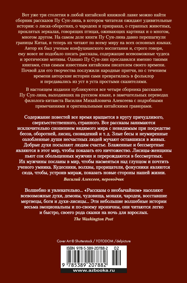 Вот уже три столетия в любой китайской книжной лавке можно найти сборник рассказов Пу Сун-лина, в котором читателя ожидают удивительные истории: о лисах-оборотнях, о чародеях и призраках, о странных животных, проклятых зеркалах, говорящих птицах, оживающих картинах и о многом, многом другом. На самом деле книги Пу Сун-лина давно перешагнули границы Китая, и теперь их читают по всему миру на всех основных языках. Автор их был ученым конфуцианского воспитания и, строго говоря, ему вовсе не подобало писать рассказы, содержащие всевозможные чудеса и эротические мотивы. Однако Пу Сун-лин прославился именно такими книгами, став самым известным китайским писателем своего времени. Почвой для его творчества послужили народные притчи, но с течением времени авторские истории сами превратились в фольклор и передавались из уст в уста простыми сказителями. В настоящем издании публикуются все четыре сборника рассказов Пу Сун-лина, выходивших на русском языке, в замечательных переводах филолога-китаиста Василия Михайловича Алексеева с подробными примечаниями и оригинальными китайскими гравюрами.| Издательство | Азбука-Аттикус Издат.группа ООО |