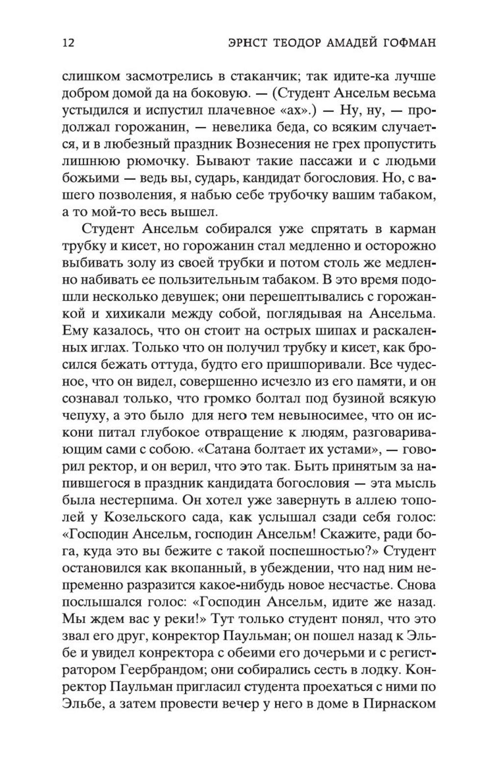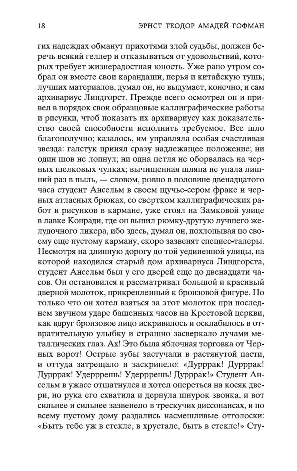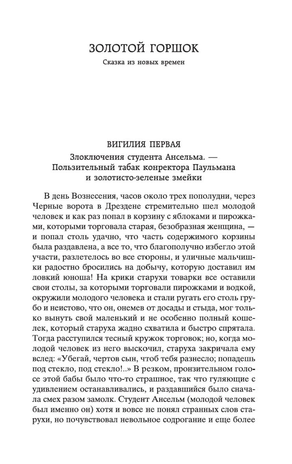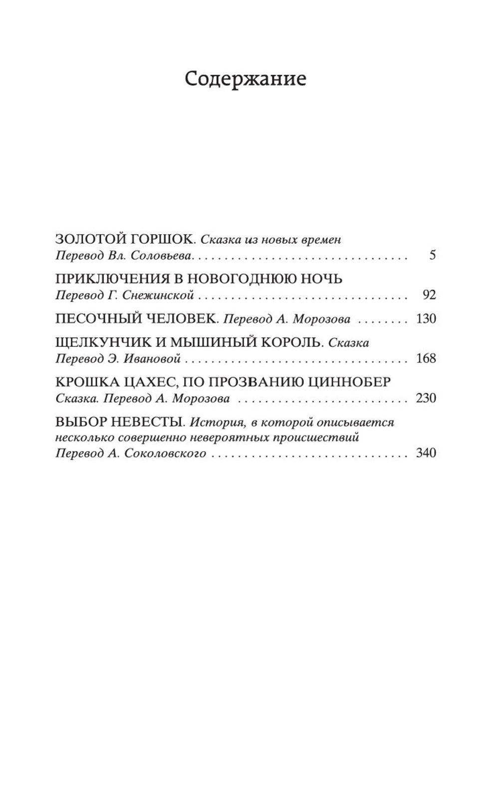 В сборник произведений знаменитого немецкого прозаика Эрнста Теодора Амадея Гофмана вошли его самые известные сказки («Золотой горшок», «Щелкунчик и мышиный король», «Крошка Цахес, по прозванию Циннобер») и новеллы («Приключения в Новогоднюю ночь», «Песочный человек», «Выбор невесты»), которые стали своего рода визитными карточками писателя и со временем были признаны шедеврами европейской романтической прозы. За прихотливой чередой странных, диковинных персонажей, за столкновениями страстей, за невероятными превратностями судеб незримо, а порой и явно присутствует Автор - оригинальный мифолог-мистик, певец «стихийных духов» и творец «совмещенных реальностей», под пером которого Дрезден XIX столетия может обернуться утопической Атлантидой, а украшенная к Рождеству детская комната - дивной волшебной страной; художник-визионер, одержимый кошмарными наваждениями, странными иллюзиями, зловещими подменами и головокружительными фантасмагориями; язвительный сатирик, зорко подмечающий социальные и нравственные изъяны своей эпохи; лукавый пародист-пересмешник, артистично и самозабвенно «играющий в литературу» и создающий виртуозные отражения Жизни и Искусства.