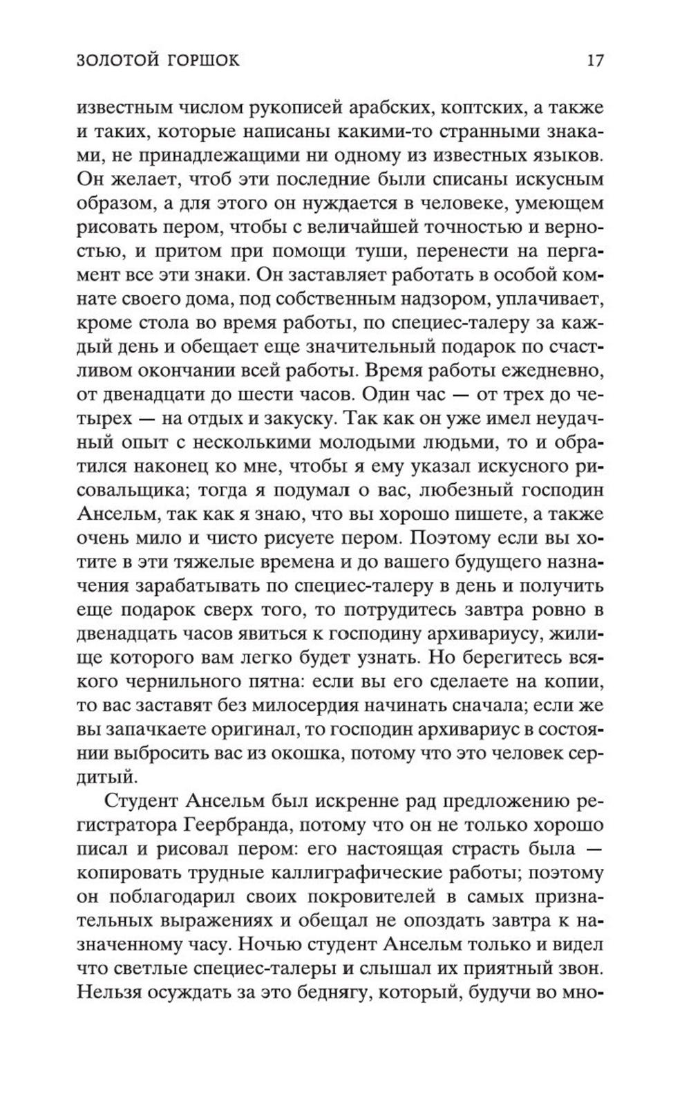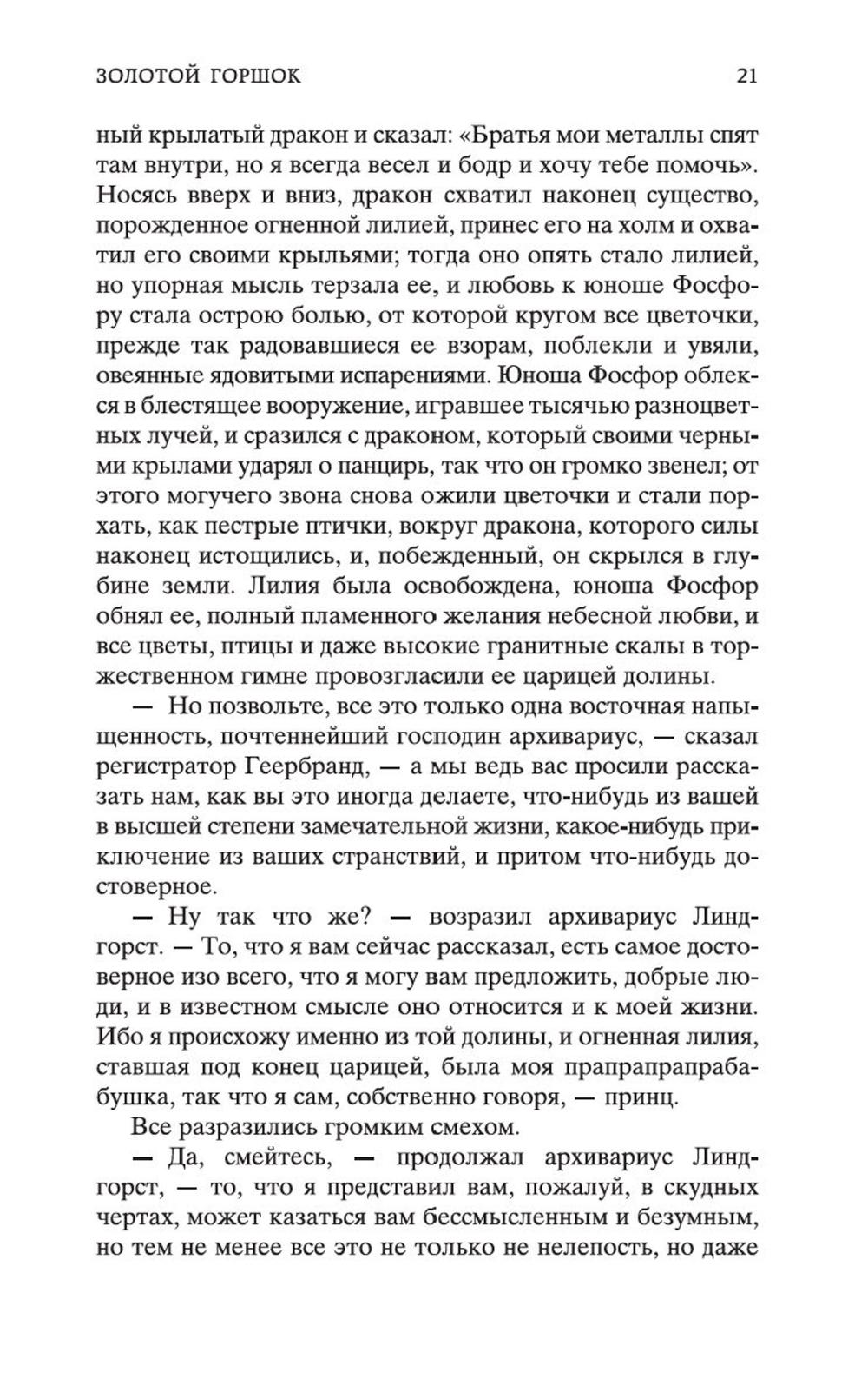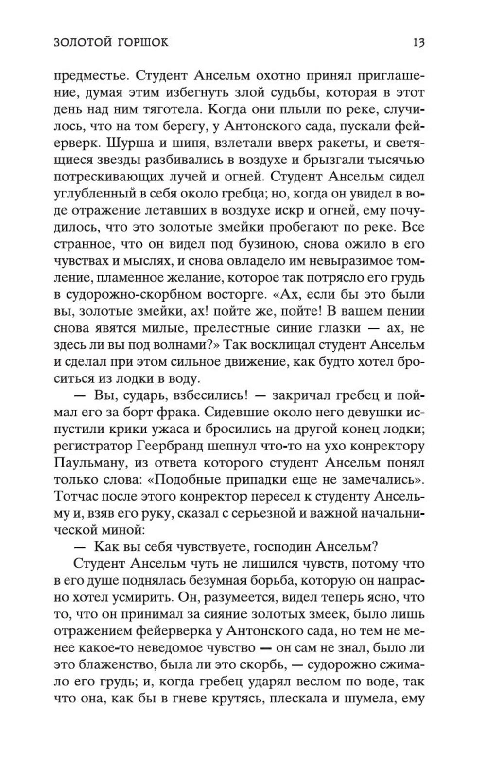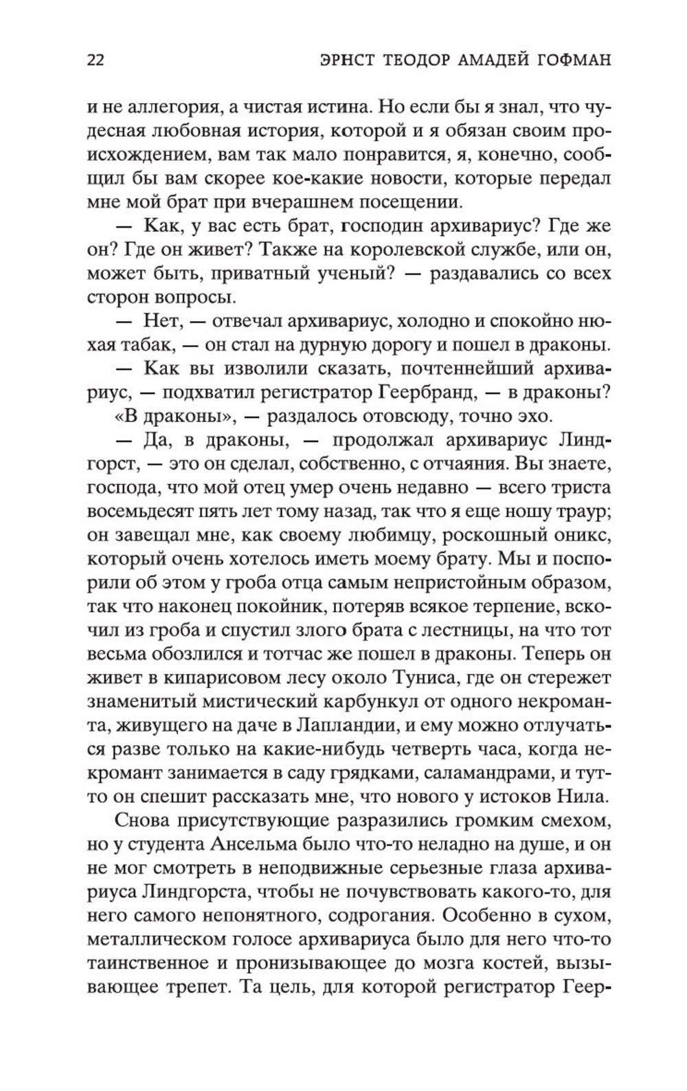 В сборник произведений знаменитого немецкого прозаика Эрнста Теодора Амадея Гофмана вошли его самые известные сказки («Золотой горшок», «Щелкунчик и мышиный король», «Крошка Цахес, по прозванию Циннобер») и новеллы («Приключения в Новогоднюю ночь», «Песочный человек», «Выбор невесты»), которые стали своего рода визитными карточками писателя и со временем были признаны шедеврами европейской романтической прозы. За прихотливой чередой странных, диковинных персонажей, за столкновениями страстей, за невероятными превратностями судеб незримо, а порой и явно присутствует Автор - оригинальный мифолог-мистик, певец «стихийных духов» и творец «совмещенных реальностей», под пером которого Дрезден XIX столетия может обернуться утопической Атлантидой, а украшенная к Рождеству детская комната - дивной волшебной страной; художник-визионер, одержимый кошмарными наваждениями, странными иллюзиями, зловещими подменами и головокружительными фантасмагориями; язвительный сатирик, зорко подмечающий социальные и нравственные изъяны своей эпохи; лукавый пародист-пересмешник, артистично и самозабвенно «играющий в литературу» и создающий виртуозные отражения Жизни и Искусства.