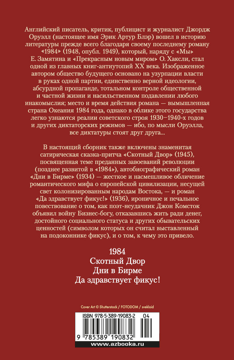 Английский писатель, критик, публицист и журналист Джордж Оруэлл (настоящее имя Эрик Артур Блэр) вошел в историю литературы прежде всего благодаря своему последнему роману "1984" (1948, опубл. 1949), который стал одной из главных книг-антиутопий ХХ века. Изображенное автором общество будущего основано на тотальной несвободе личности, пропаганде и открытом насилии - победивших, согласно горькому и грозному предсказанию автора, в вымышленном государстве Океания к 1984 году; однако в его облике легко узнаются реалии советского строя 1930-1940-х годов и других диктаторских режимов - ибо, по Оруэллу, все диктатуры стоят друг друга… В настоящий сборник также включены знаменитая сатирическая сказка-притча "Скотный Двор" (1945), посвященная теме преданных завоеваний революции (позднее развитой в "1984"), автобиографический роман "Дни в Бирме" (1934) - жесткое и насмешливое обличение романтического мифа о европейской цивилизации, несущей свет колонизированным народам Востока, - и роман "Да здравствует фикус!" (1936), ироничное и печальное повествование о том, как поэт-неудачник Джон Комсток объявил войну Бизнес-богу, отказавшись жить ради денег, достойного социального статуса и других обывательских ценностей (символом которых он считал выставленный на подоконнике фикус), - и о том, к чему это привело.| Издательство | Азбука-Аттикус Издат.группа ООО |