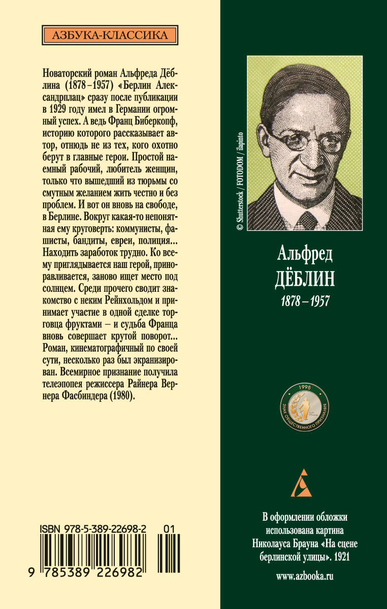 Новаторский роман Альфреда Дёблина (1878-1957) "Берлин Александрплац" сразу после публикации в 1929 году имел в Германии огромный успех. А ведь Франц Биберкопф, историю которого рассказывает автор, отнюдь не из тех, кого охотно берут в главные герои. Простой наемный рабочий, любитель женщин, только что вышедший из тюрьмы со смутным желанием жить честно и без проблем. И вот он вновь на свободе, в Берлине. Вокруг какая-то непонятная ему круговерть: коммунисты, фашисты, бандиты, евреи, полиция… Находить заработок трудно. Ко всему приглядывается наш герой, приноравливается, заново ищет место под солнцем. Среди прочего сводит знакомство с неким Рейнхольдом и принимает участие в одной сделке торговца фруктами - и судьба Франца вновь совершает крутой поворот... Роман, кинематографичный по своей сути, несколько раз был экранизирован. Всемирное признание получила телеэпопея режиссера Райнера Вернера Фасбиндера (1980).| Издательство | Азбука-Аттикус Издат.группа ООО |