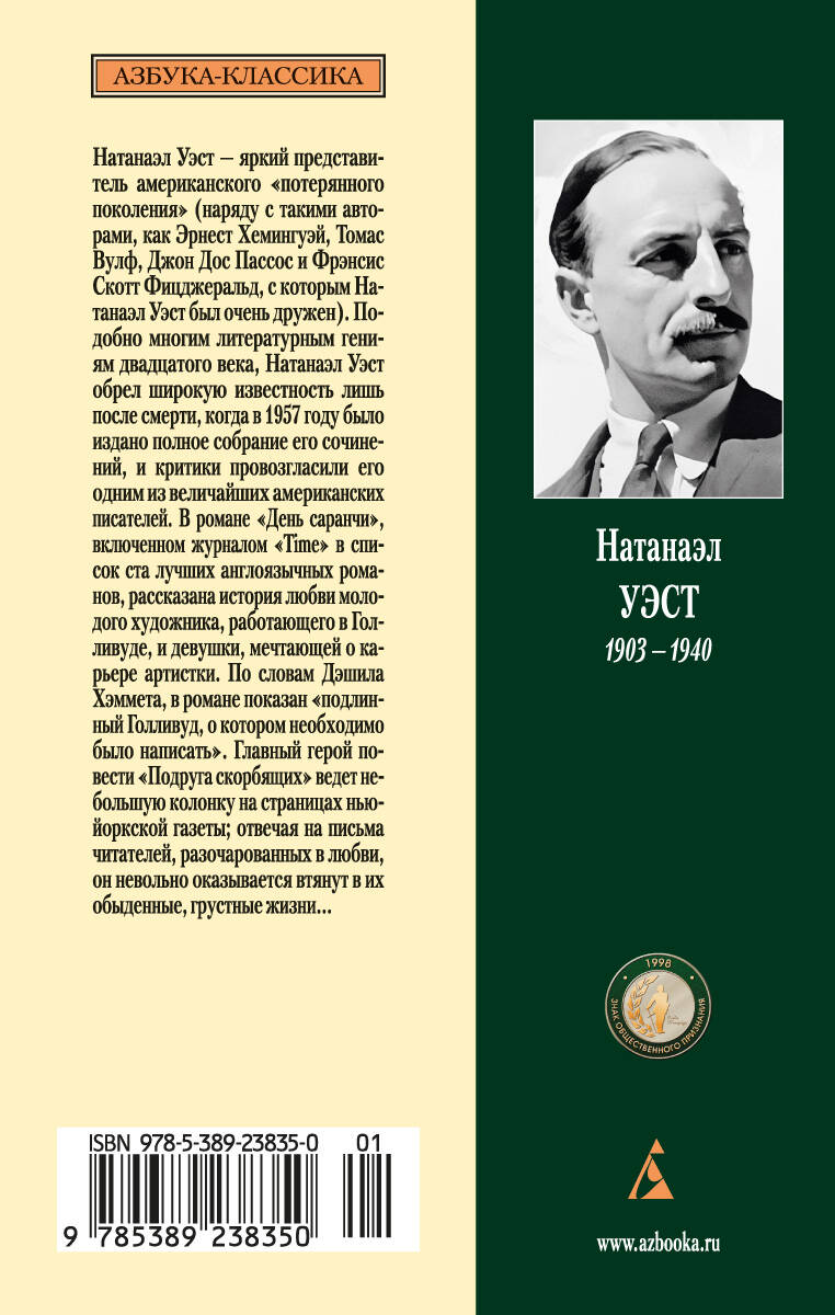 Натанаэл Уэст - яркий представитель американского "потерянного поколения" (наряду с такими авторами, как Эрнест Хемингуэй, Томас Вулф, Джон Дос Пассос и Фрэнсис Скотт Фицджеральд, с которым Натанаэл Уэст был очень дружен). Подобно многим литературным гениям двадцатого века, Натанаэл Уэст обрел широкую известность лишь после смерти, когда в 1957 году было издано полное собрание его сочинений, и критики провозгласили его одним из величайших американских писателей. В романе "День саранчи", включенном журналом "Time" в список ста лучших англоязычных романов, рассказана история любви молодого художника, работающего в Голливуде, и девушки, мечтающей о карьере артистки. По словам Дэшила Хэммета, в романе показан "подлинный Голливуд, о котором необходимо было написать". Главный герой повести "Подруга скорбящих" ведет небольшую колонку на страницах нью-йоркской газеты; отвечая на письма читателей, разочарованных в любви, он невольно оказывается втянут в их обыденные, грустные жизни...| Издательство | Азбука-Аттикус Издат.группа ООО |
