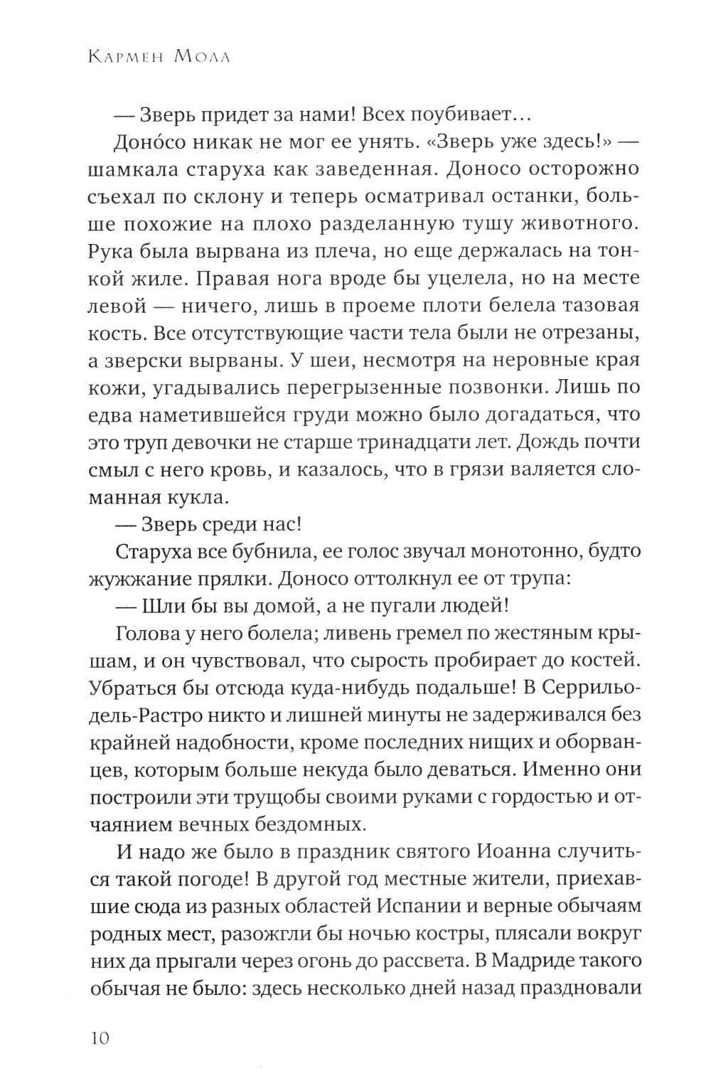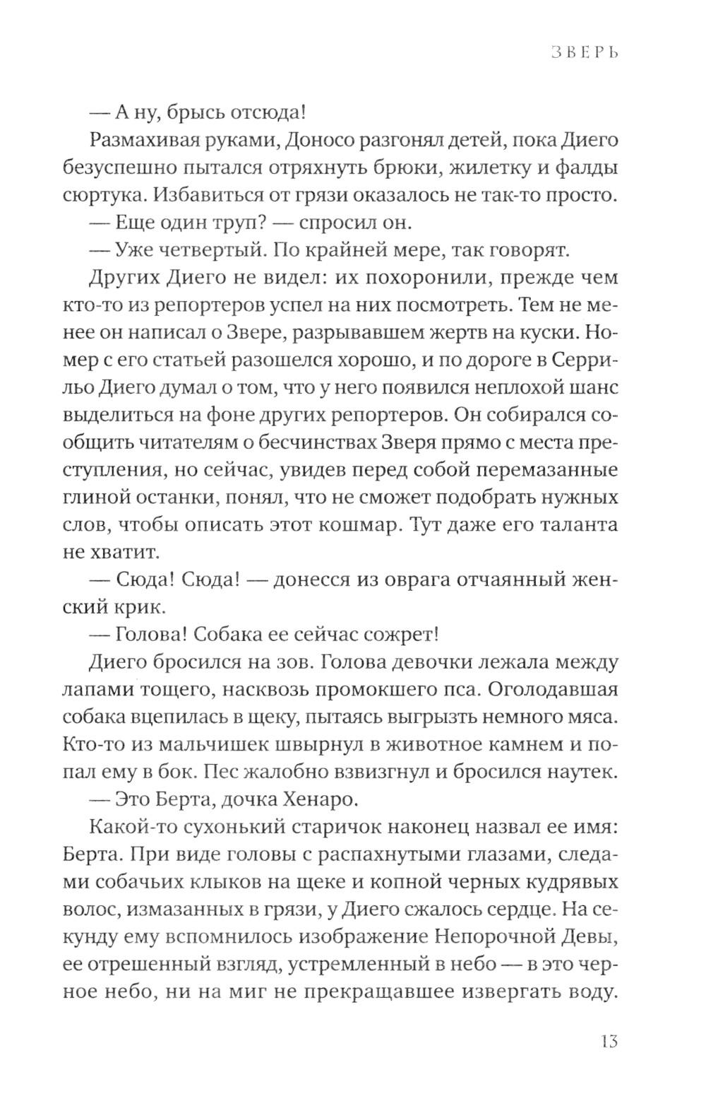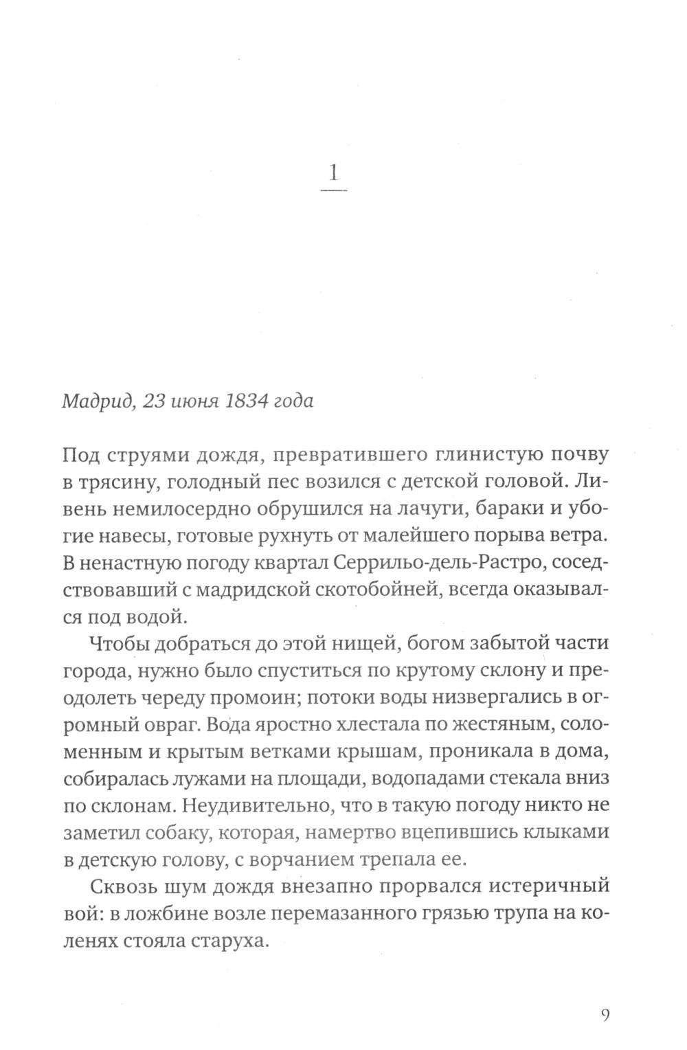 1834 год. Мадрид во власти эпидемии холеры, уносящей ежедневно десятки жизней. Больницы и приюты переполнены, умерших уже перестали считать. Но не только смертоносная болезнь держит в страхе жителей города: в бедных кварталах все чаще стали находить растерзанные тела ранее пропавших людей. Все считают, что эти чудовищно жестокие убийства совершает огромное животное, которое стали называть Зверем. Когда исчезает одиннадцатилетняя Клара, ее старшая сестра Лусия, не задумываясь об опасности, бросается на поиски. К ней присоединяются ведущий собственное расследование убийств репортер Диего, его старый приятель полицейский Доносо и необычный монах, владеющий боевыми искусствами, - брат Браулио. В этих поисках они попадут в закрытый мир тайных обществ, жутких ритуальных обрядов и политических интриг, не раз подвергнутся смертельной опасности и найдут таинственный перстень-печатку со скрещенными молотками, ради обладания которым многие готовы убить.| Издательство | Синдбад |