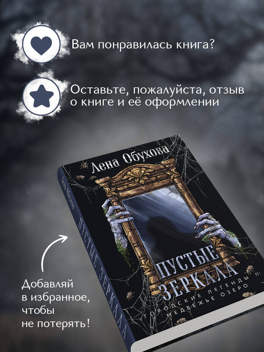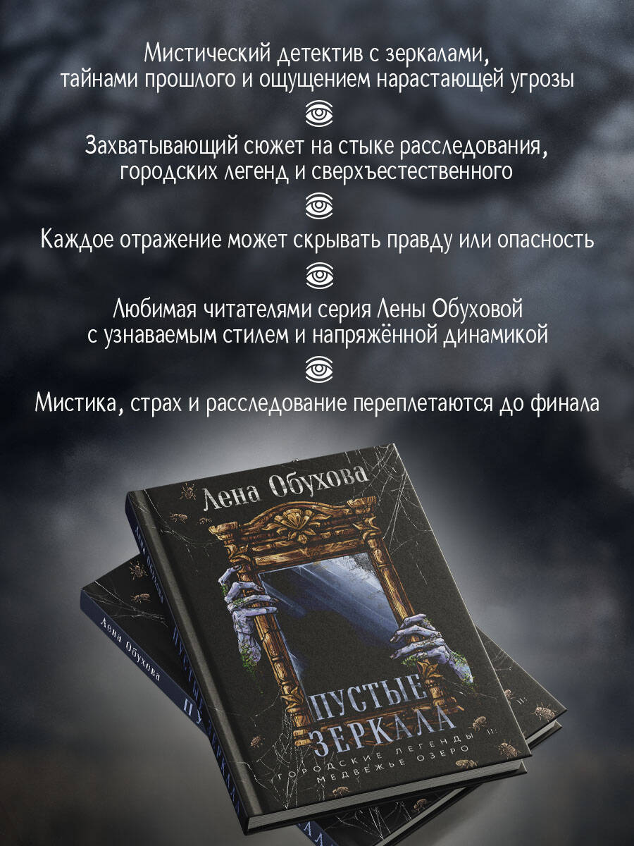 «Пустые зеркала» - новинка популярной российской писательницы Лены Обуховой, вошедшая в мистический цикл «Городские легенды II: Медвежье озеро». Захватывающая история с неожиданной развязкой в духе «Сверхъестественного». В гостинице Влада и Юли Федоровых снова происходит трагедия: найден труп пропавшего блогера. Странное убийство больше напоминает пугающий ритуал. Похоже, на Медвежьем озере вновь ожила городская легенда, и разбираться в ней снова придется уже знакомым героям...