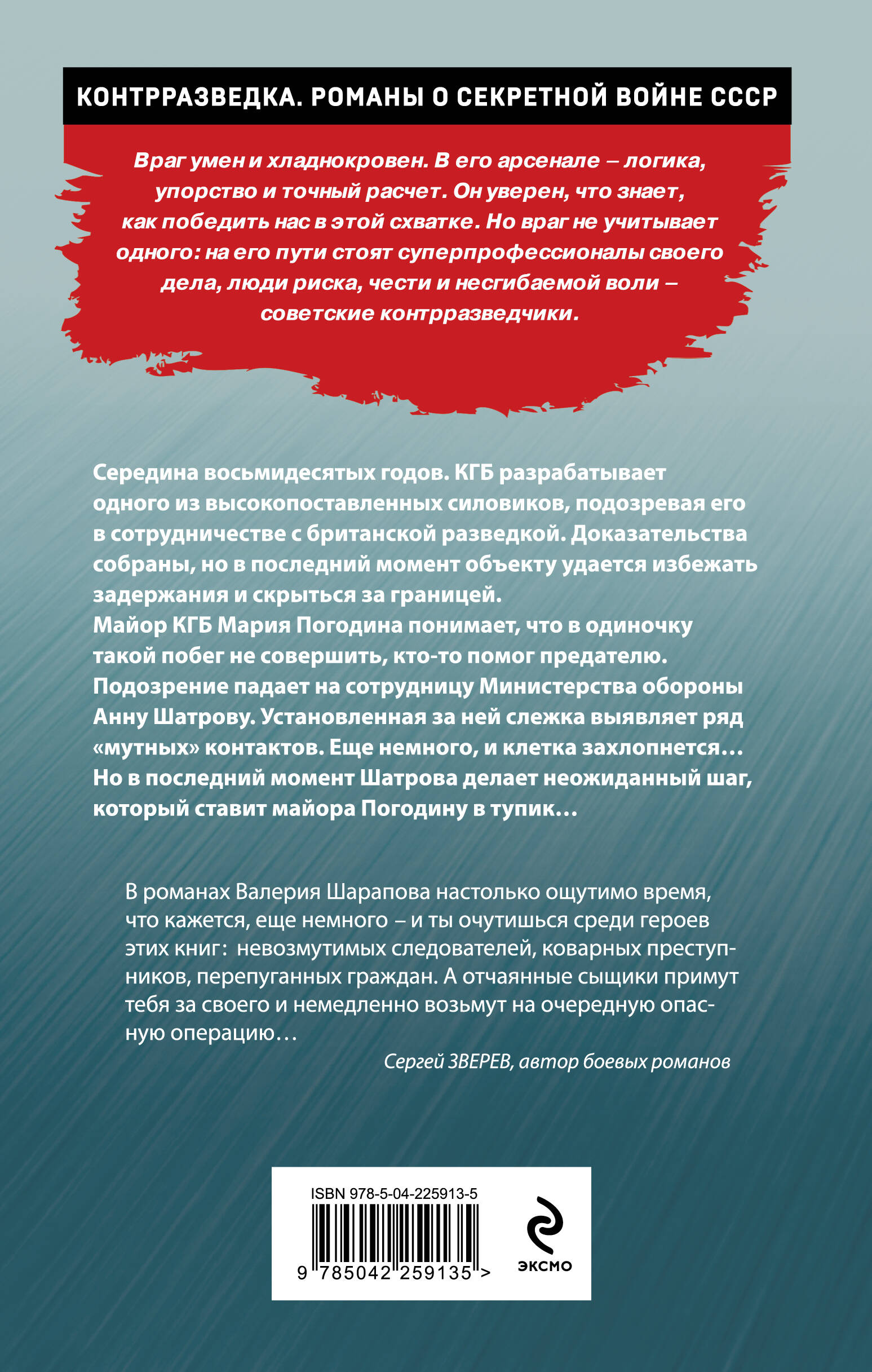 Середина восьмидесятых годов. КГБ разрабатывает одного из высокопоставленных силовиков, подозревая его в сотрудничестве с британской разведкой. Доказательства собраны, но в последний момент объекту удается избежать задержания и скрыться за границей. Майор КГБ Мария Погодина понимает, что в одиночку такой побег не совершить, кто-то помог предателю. Подозрение падает на сотрудницу Министерства обороны Анну Шатрову. Установленная за ней слежка выявляет ряд «мутных» контактов. Еще немного, и клетка захлопнется… Но в последний момент Шатрова делает неожиданный шаг, который ставит майора Погодину в тупик… Враг умен и хладнокровен. В его арсенале - логика, упорство и точный расчет. Он уверен, что знает, как победить нас в этой схватке. Но враг не учитывает одного: на его пути стоят суперпрофессионалы своего дела, люди риска, чести и несгибаемой воли - советские контрразведчики. «В романах Валерия Шарапова настолько ощутимо время, что кажется, еще немного, и ты очутишься среди героев этих книг - невозмутимых следователей, коварных преступников, перепуганных граждан. А отчаянные сыщики примут тебя за своего и немедленно возьмут на очередную опасную операцию…» - Сергей ЗВЕРЕВ, автор боевых романов| Издательство | ООО "Издательство "Эксмо" |