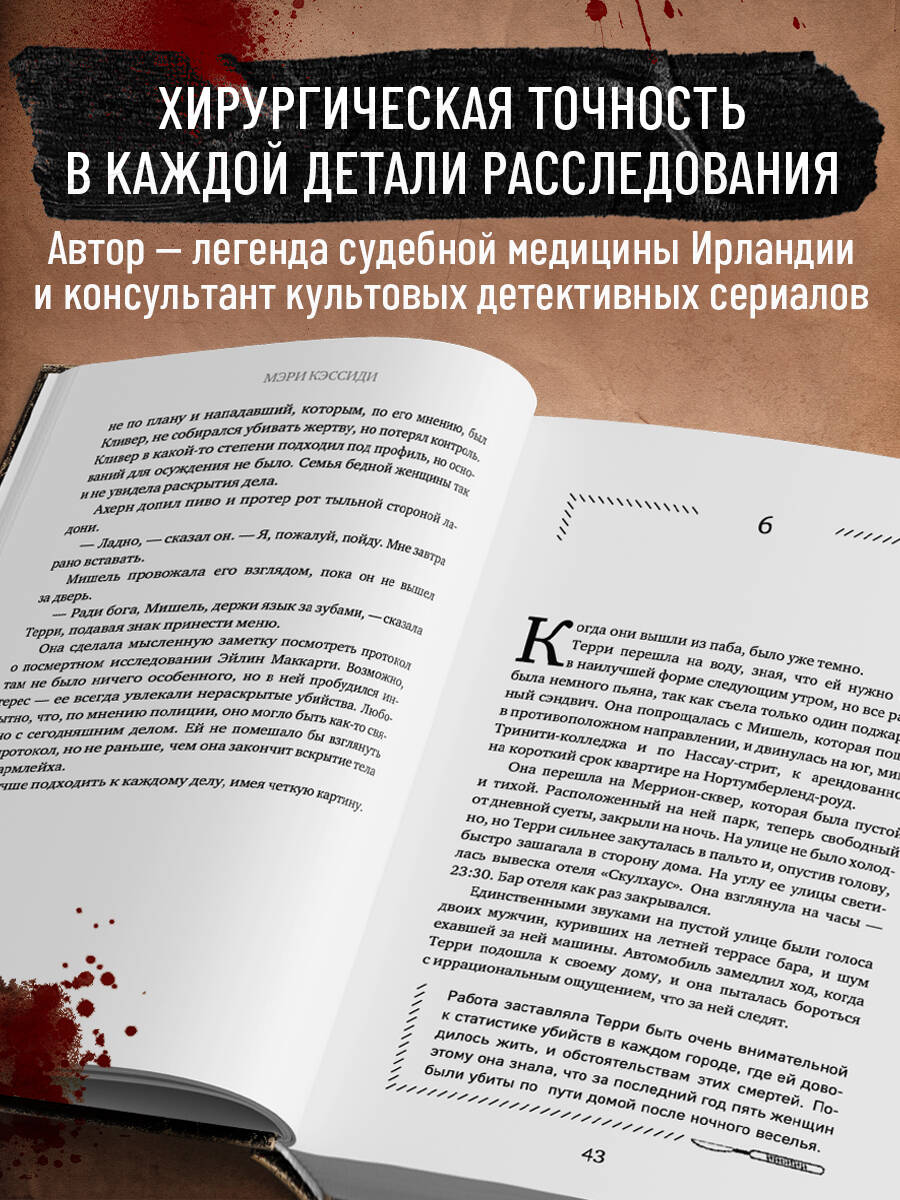 Перед вами захватывающий судебный триллер от Мэри Кэссиди - бывшего судмедэксперта с 30-летним опытом, имевшей дело с сотнями убийств, и автора бестселлера «Место преступления - тело». Главная героиня романа Терри О'Брайен - талантливый судмедэксперт, она недавно переехала из Шотландии в Дублин, где работает в морге и сотрудничает с ирландской полицией. Однажды на секционном столе Терри оказывается тело Рейчел Рис - известной ведущей криминального подкаста о нераскрытых преступлениях, убитой при загадочных обстоятельствах. Убийца практически не оставил следов, и полиция выдвигает удобного для них подозреваемого. Но опытный взгляд Терри раскрывает иную картину, она находит взаимосвязь с серией старых нераскрытых убийств и начинает вести собственное тайное расследование. Погружаясь в темные тайны прошлого, она все ближе подходит к разгадке, но даже не подозревает, что серийный убийца уже наметил ее своей следующей жертвой… Хотите раскрыть правду вместе с Терри? Тогда приготовьтесь отправиться в опасное путешествие, полное загадок, напряженных моментов и запутанных человеческих отношений, которое не отпустит вас до последней страницы!