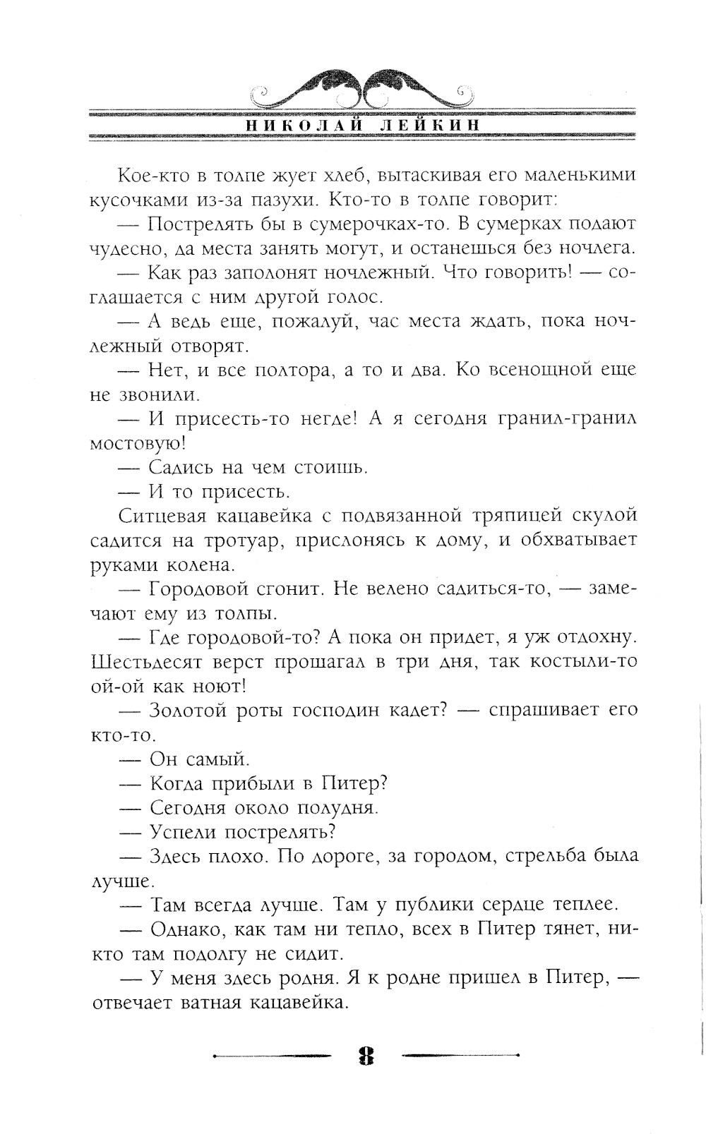 В эту книгу Николая Александровича Лейкина вошли сборник рассказов «Голь перекатная» и повесть «Кусок хлеба». «Голь перекатная» во многом напоминает раздел о Хитровке признанного шедевра Владимира Алексеевича Гиляровского «Москва и москвичи», только дело происходит в Санкт-Петербурге. Автор без прикрас показывает жизнь опустившихся на социальное дно людей, ютящихся по углам, по чердакам и в подвалах, живо изображая невыносимые условия существования и повальное пьянство. «Кусок хлеба» продолжает затронутую в сборнике тему, давая возможность взглянуть на жизнь страдающих от неурожаев в деревнях и от отсутствия рабочих мест в городах людей, в итоге обреченных либо на нищенское существование, либо на сомнительные способы заработка. Автор в очередной раз демонстрирует прекрасное владение словом и, несмотря на общий тон сборника, как и всегда оживляет происходящее своими меткими наблюдениями.| Издательство | Центрполиграф |