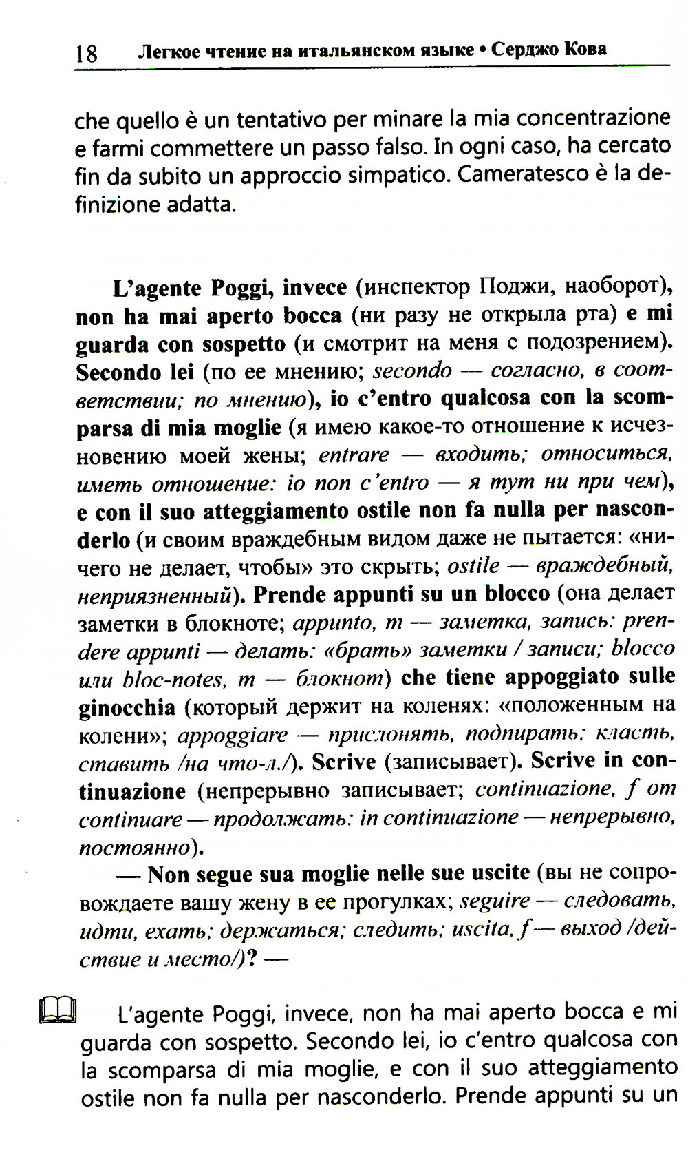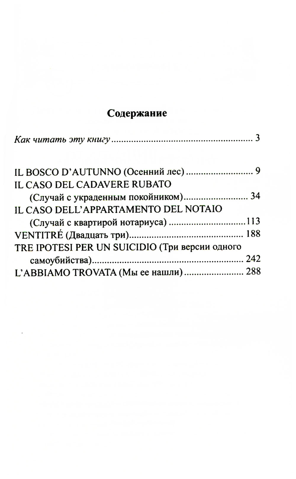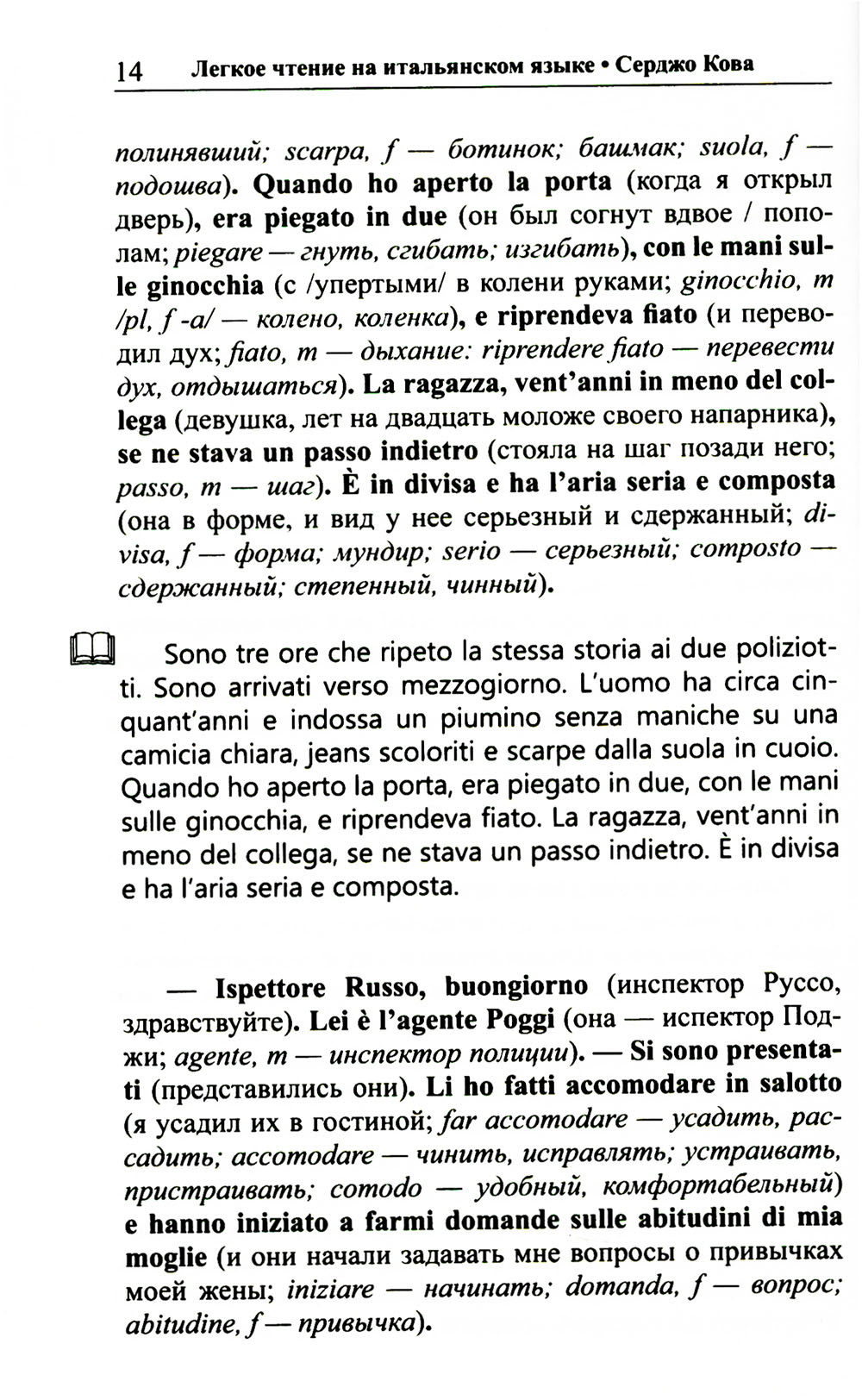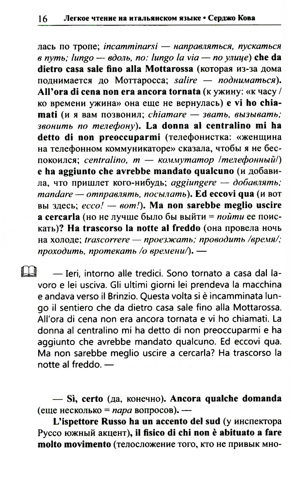 В книгу вошли избранные рассказы одного из признанных мастеров итальянского детектива Серджо Кова, в том числе несколько случаев из практики любимого героя писателя, подполковника Ареса Бельмонте. Простой современный язык, динамичный стиль изложения, обилие диалогов позволяют рекомендовать данный сборник на самых ранних этапах овладения итальянским языком. Рассказы адаптированы по методу Ильи Франка: снабжены дословным переводом на русский язык и необходимым лсксико-грамматическим комментарием (без упрощения текста оригинала). Уникальность метода заключается в том, что запоминание слов и выражений происходит за счет их повторяемости, без заучивания и необходимости использовать словарь. Кроме того, читатель привыкает к логике итальянского языка, начинает его «чувствовать». Пособие способствует эффективному освоению языка, может служить дополнением к учебной программе. Для широкого круга лиц, изучающих итальянский язык и интересующихся итальянской культурой.| Издательство | Восточная книга |