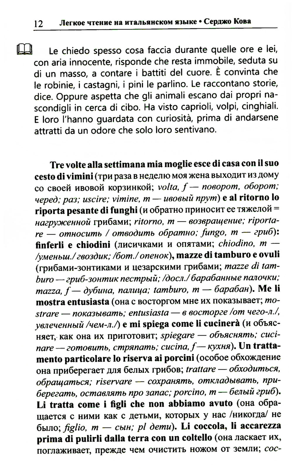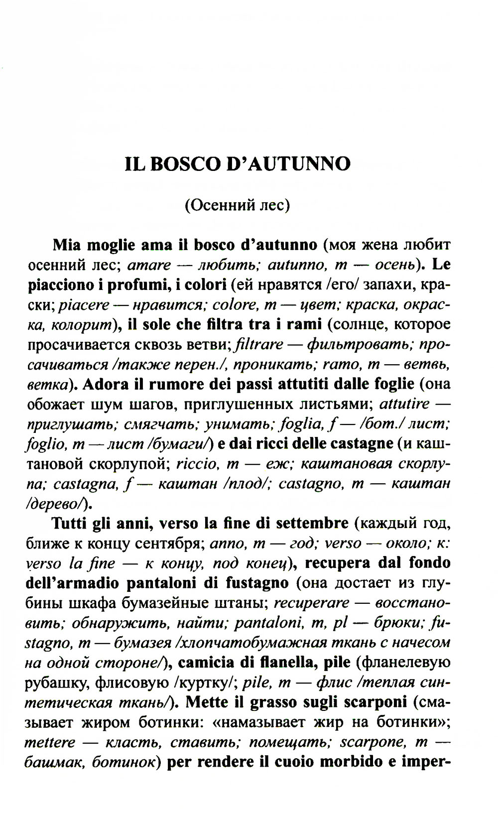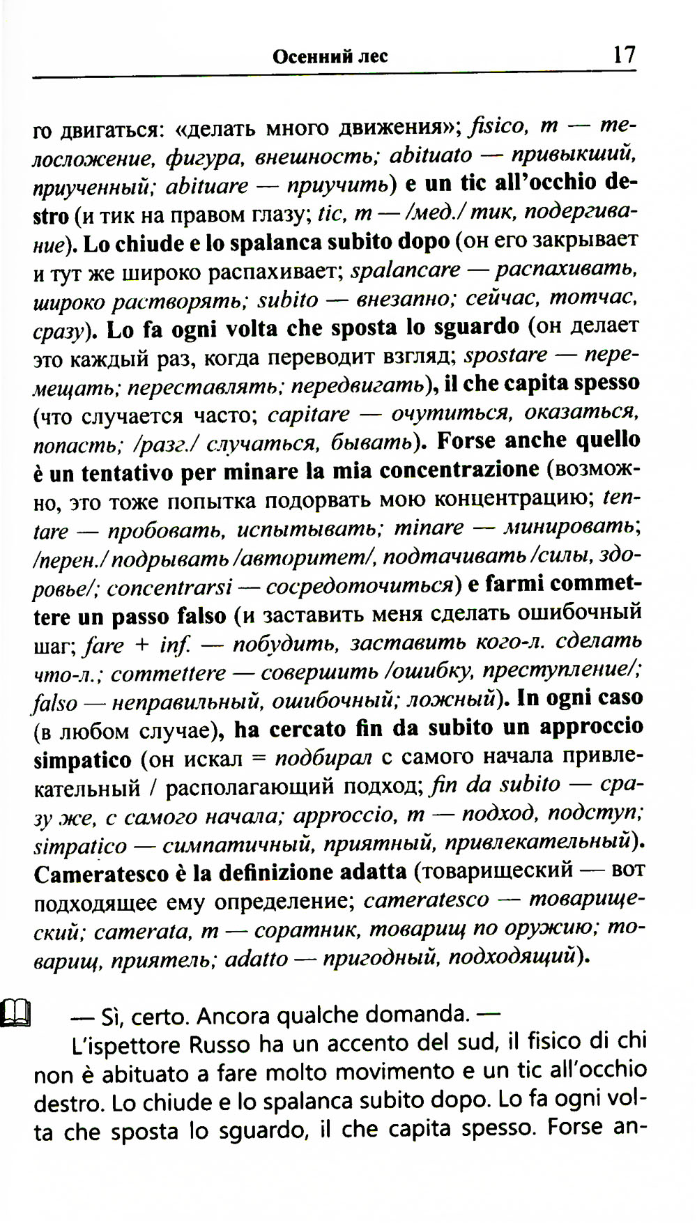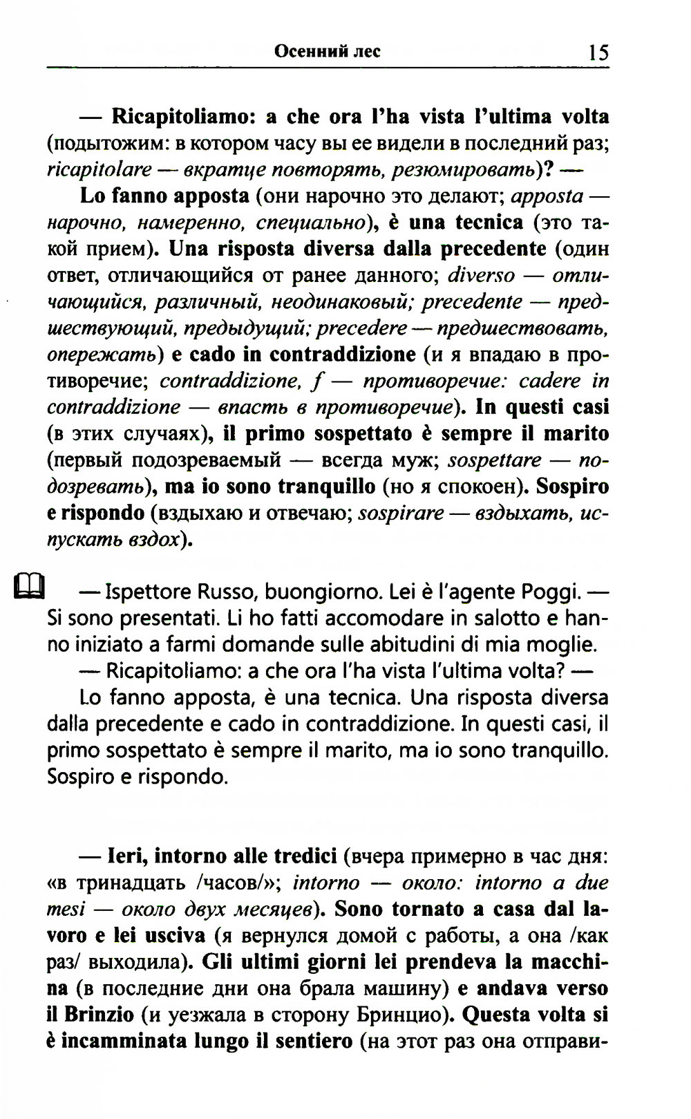 В книгу вошли избранные рассказы одного из признанных мастеров итальянского детектива Серджо Кова, в том числе несколько случаев из практики любимого героя писателя, подполковника Ареса Бельмонте. Простой современный язык, динамичный стиль изложения, обилие диалогов позволяют рекомендовать данный сборник на самых ранних этапах овладения итальянским языком. Рассказы адаптированы по методу Ильи Франка: снабжены дословным переводом на русский язык и необходимым лсксико-грамматическим комментарием (без упрощения текста оригинала). Уникальность метода заключается в том, что запоминание слов и выражений происходит за счет их повторяемости, без заучивания и необходимости использовать словарь. Кроме того, читатель привыкает к логике итальянского языка, начинает его «чувствовать». Пособие способствует эффективному освоению языка, может служить дополнением к учебной программе. Для широкого круга лиц, изучающих итальянский язык и интересующихся итальянской культурой.| Издательство | Восточная книга |