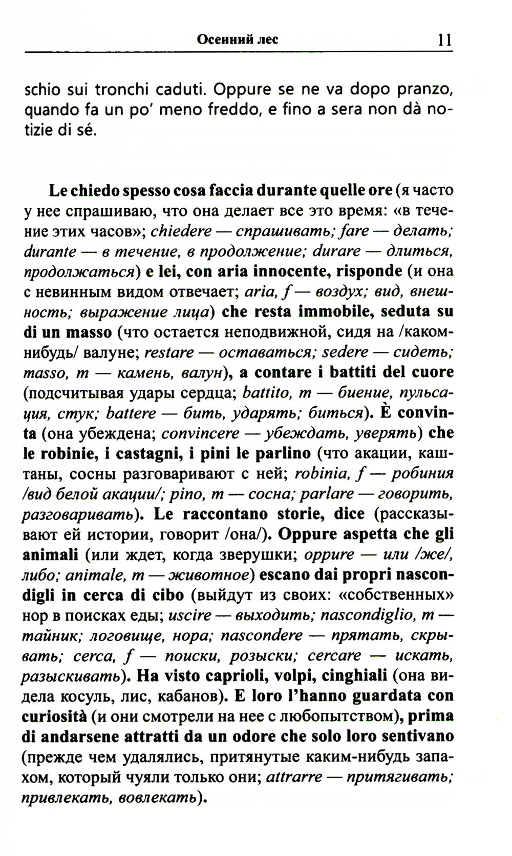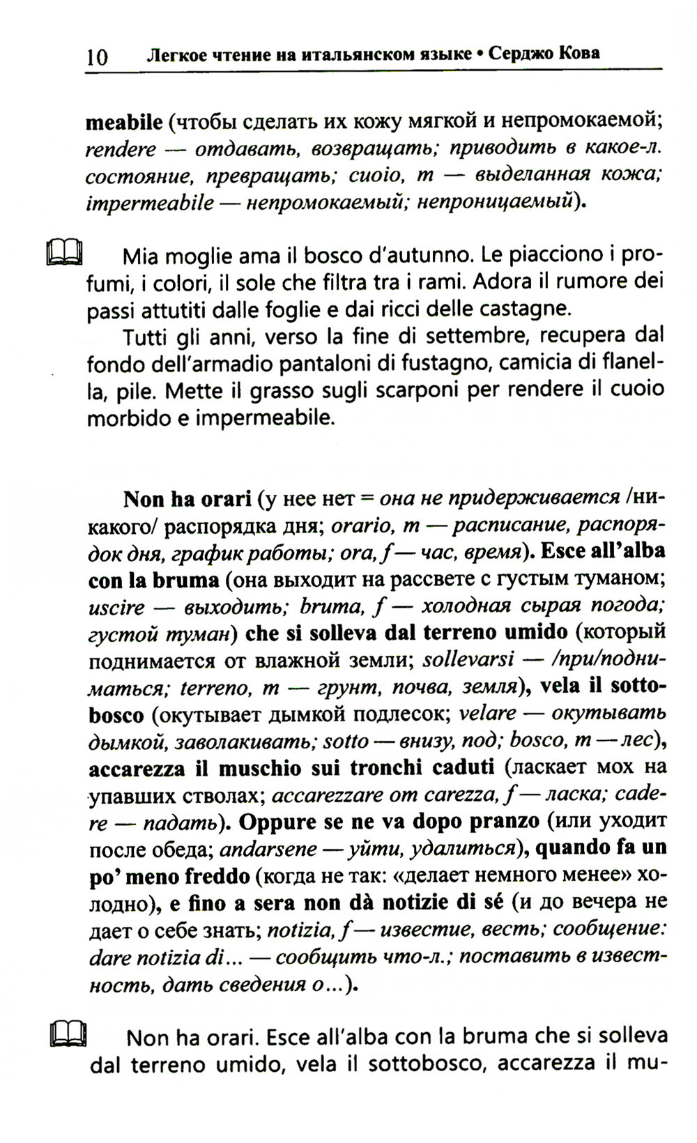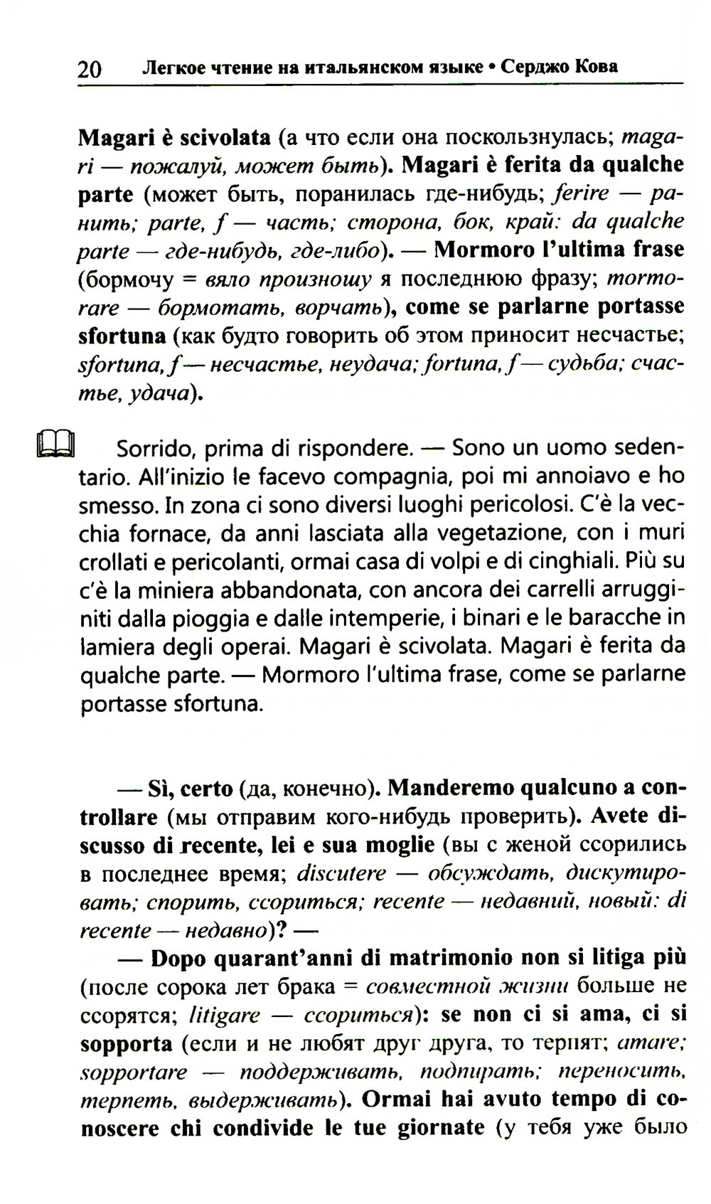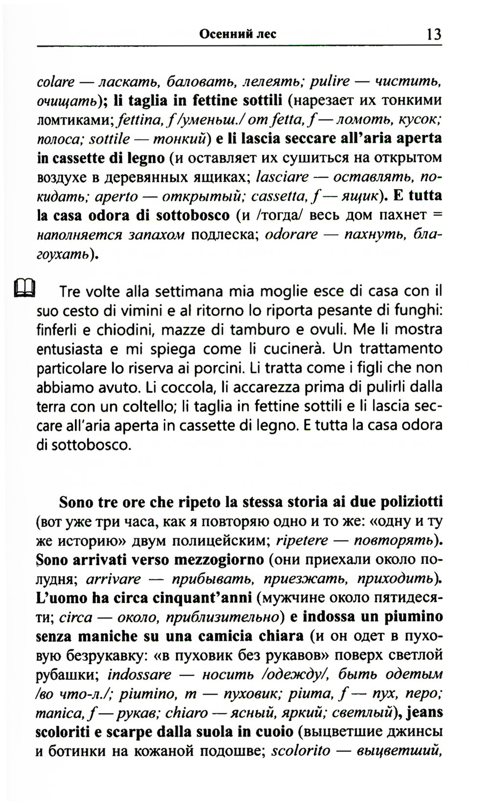 В книгу вошли избранные рассказы одного из признанных мастеров итальянского детектива Серджо Кова, в том числе несколько случаев из практики любимого героя писателя, подполковника Ареса Бельмонте. Простой современный язык, динамичный стиль изложения, обилие диалогов позволяют рекомендовать данный сборник на самых ранних этапах овладения итальянским языком. Рассказы адаптированы по методу Ильи Франка: снабжены дословным переводом на русский язык и необходимым лсксико-грамматическим комментарием (без упрощения текста оригинала). Уникальность метода заключается в том, что запоминание слов и выражений происходит за счет их повторяемости, без заучивания и необходимости использовать словарь. Кроме того, читатель привыкает к логике итальянского языка, начинает его «чувствовать». Пособие способствует эффективному освоению языка, может служить дополнением к учебной программе. Для широкого круга лиц, изучающих итальянский язык и интересующихся итальянской культурой.| Издательство | Восточная книга |