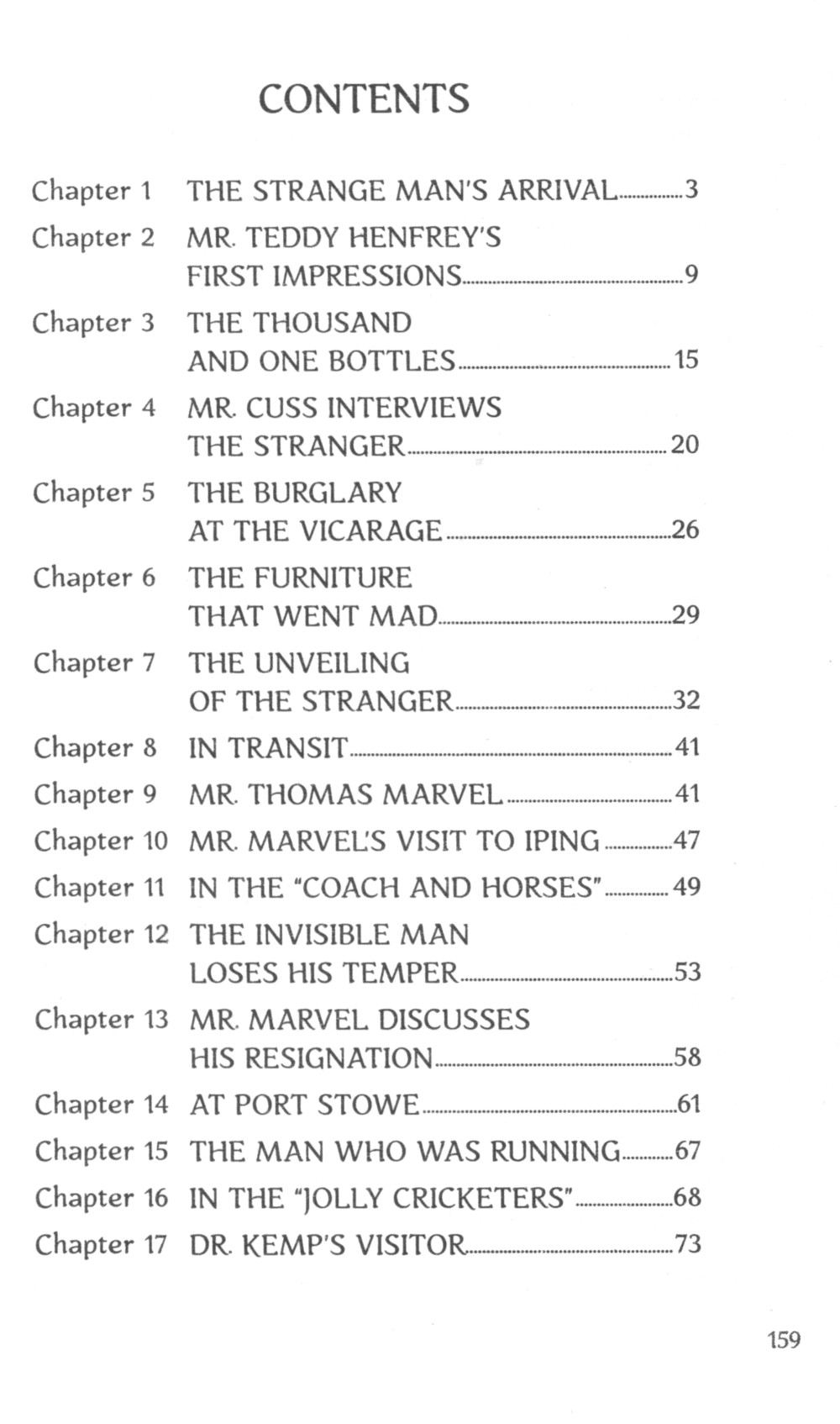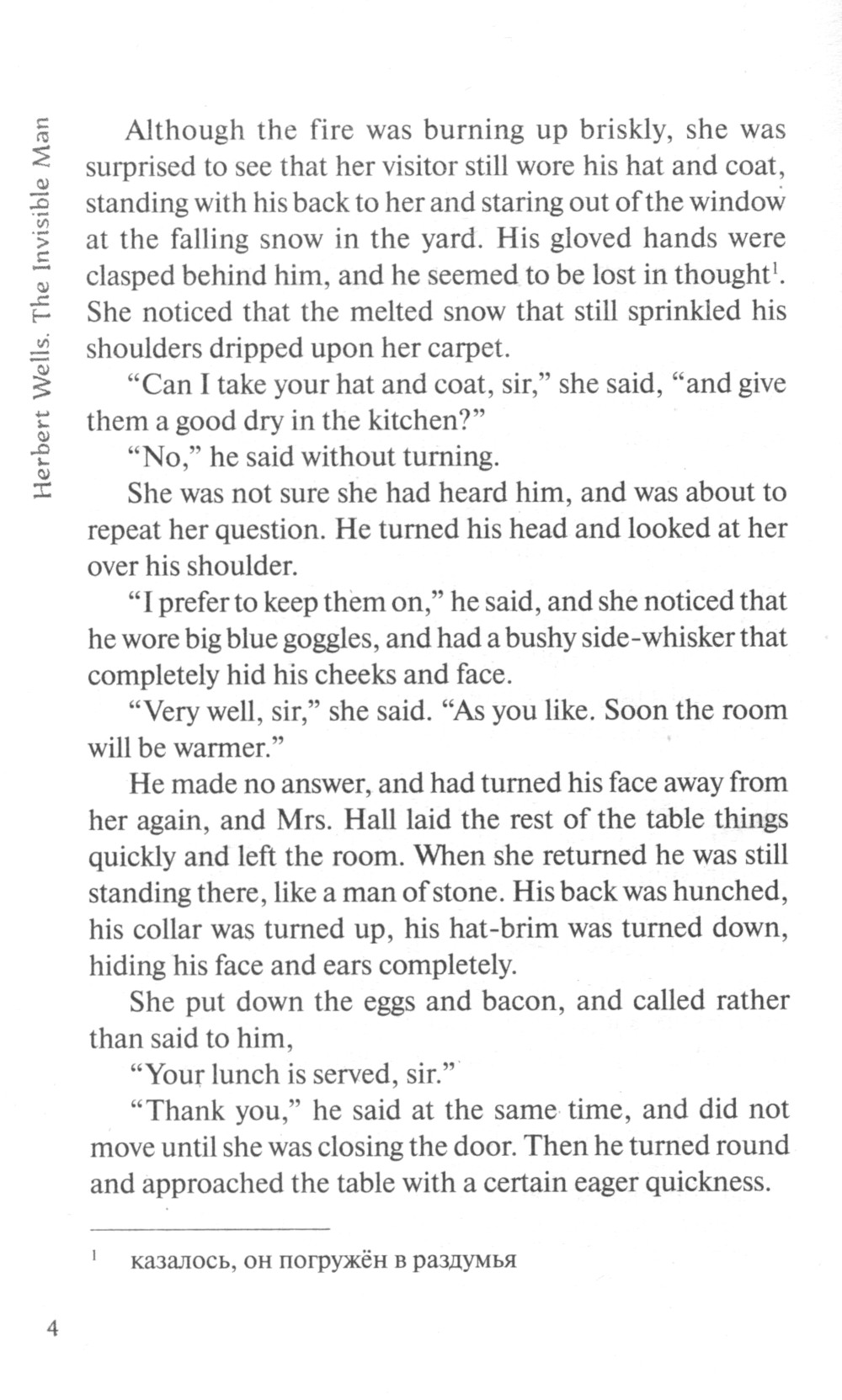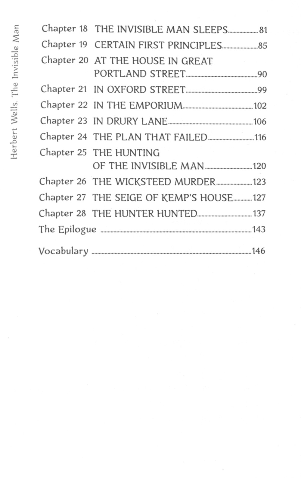 Совершив научное открытие, гениальный учёный Гриффин оказывается в западне: невидимость лишает его тепла человеческого общения, он вынужден голодать и скрывать новый облик, чтобы не стать шутом для простолюдинов. Попытка вернуть собственное лицо обнажает самые тёмные стороны натуры Гриффина: он начинает мечтать о богатстве, стремится к захвату власти и пытается совершить убийство. Но финал злодея-одиночки предсказуем: невидимость делает очевидными все пороки злого гения и приводит его к смерти. Текст сокращён и адаптирован. Уровень В1.