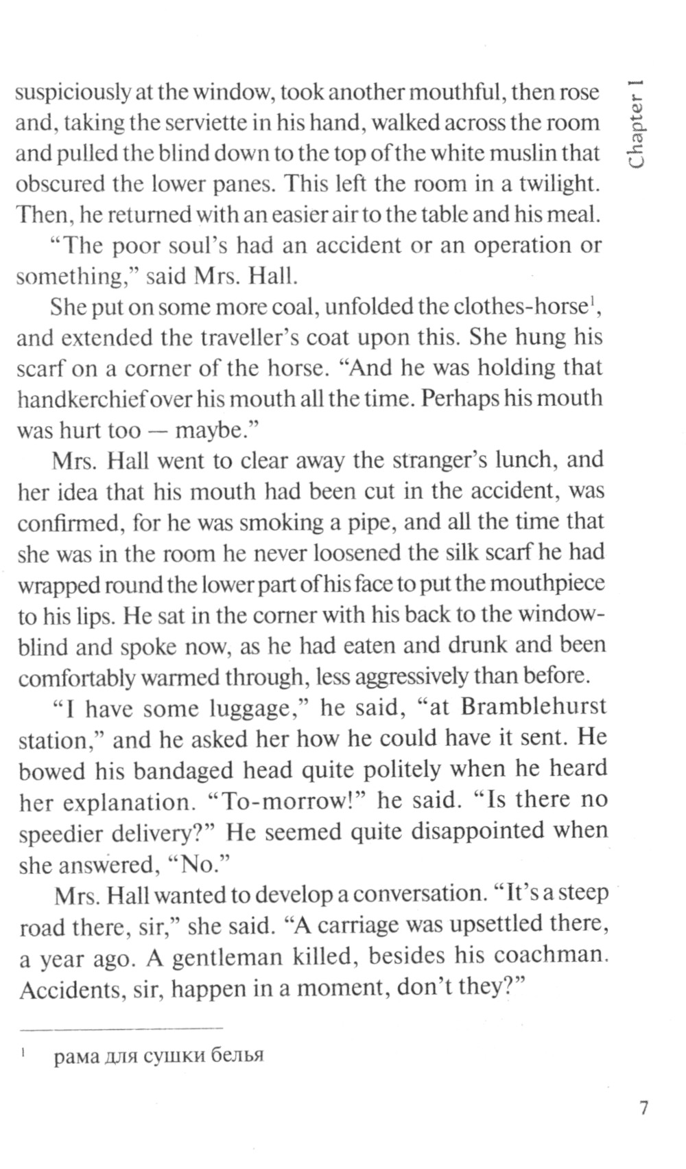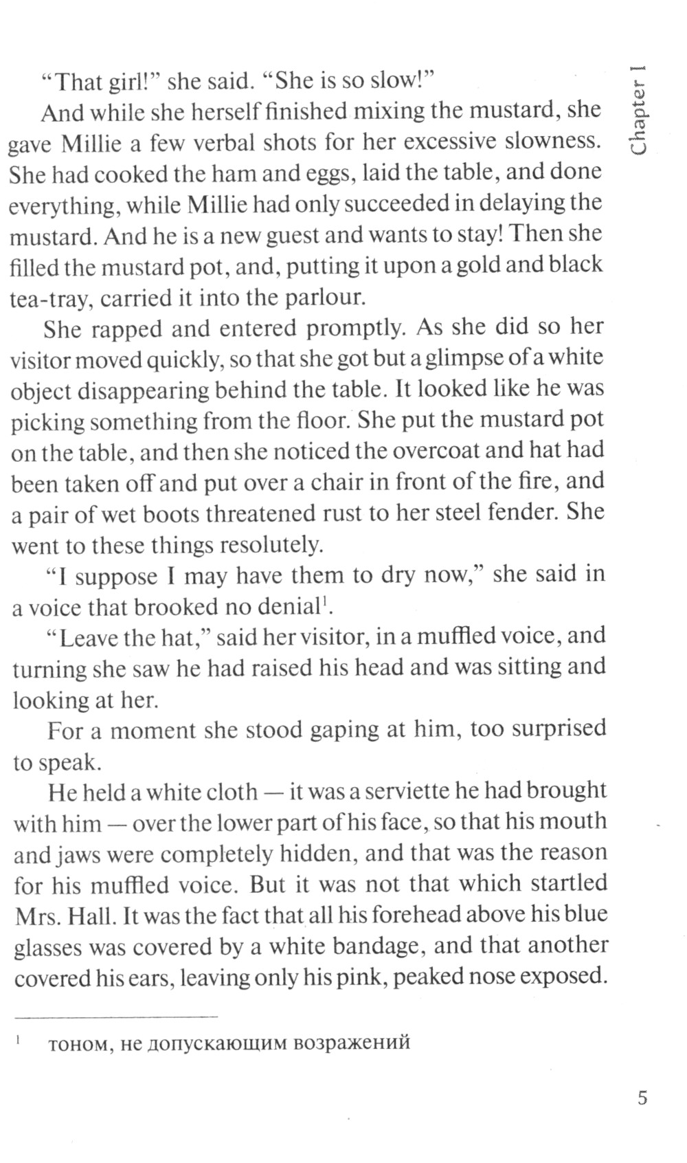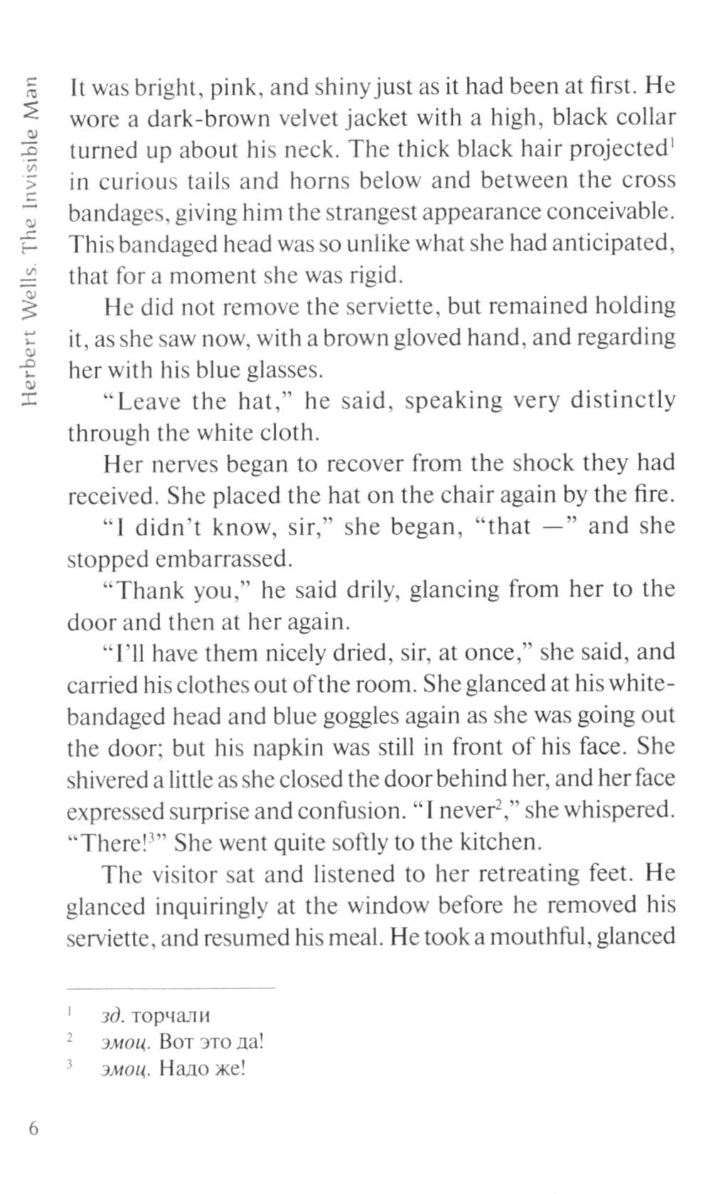 Совершив научное открытие, гениальный учёный Гриффин оказывается в западне: невидимость лишает его тепла человеческого общения, он вынужден голодать и скрывать новый облик, чтобы не стать шутом для простолюдинов. Попытка вернуть собственное лицо обнажает самые тёмные стороны натуры Гриффина: он начинает мечтать о богатстве, стремится к захвату власти и пытается совершить убийство. Но финал злодея-одиночки предсказуем: невидимость делает очевидными все пороки злого гения и приводит его к смерти. Текст сокращён и адаптирован. Уровень В1.