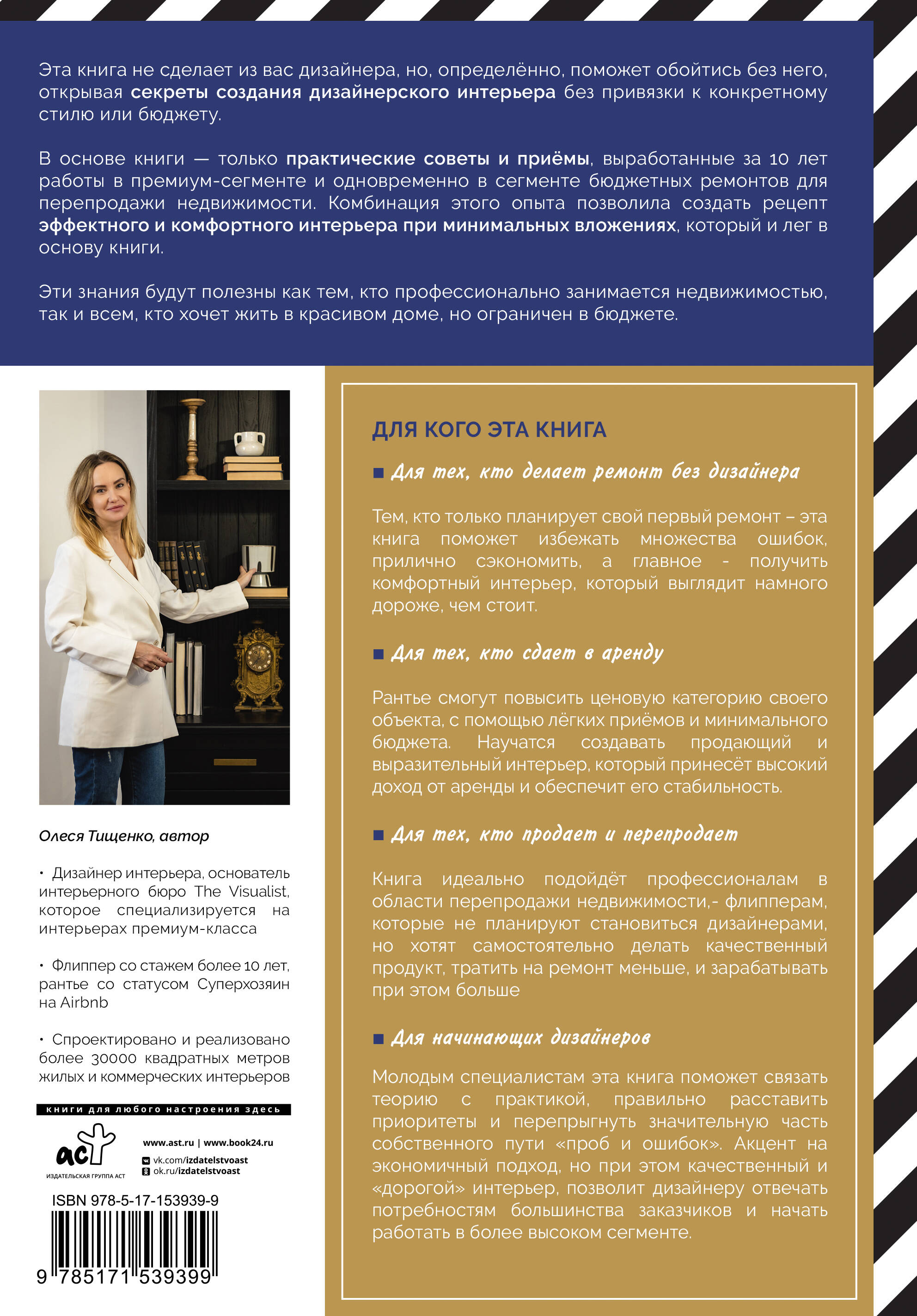 Книга «ИнтерьерЧик» - лучший помощник для тех, кто хочет создать дизайнерский интерьер без больших вложений. В ее основе - только практические советы и приемы, выработанные автором за годы работы в премиум-сегменте и, одновременно, в сегменте бюджетных ремонтов для перепродажи недвижимости. Комбинация этого опыта позволила Олесе Тищенко создать уникальный рецепт интерьера, который выглядит намного дороже, чем стоит.