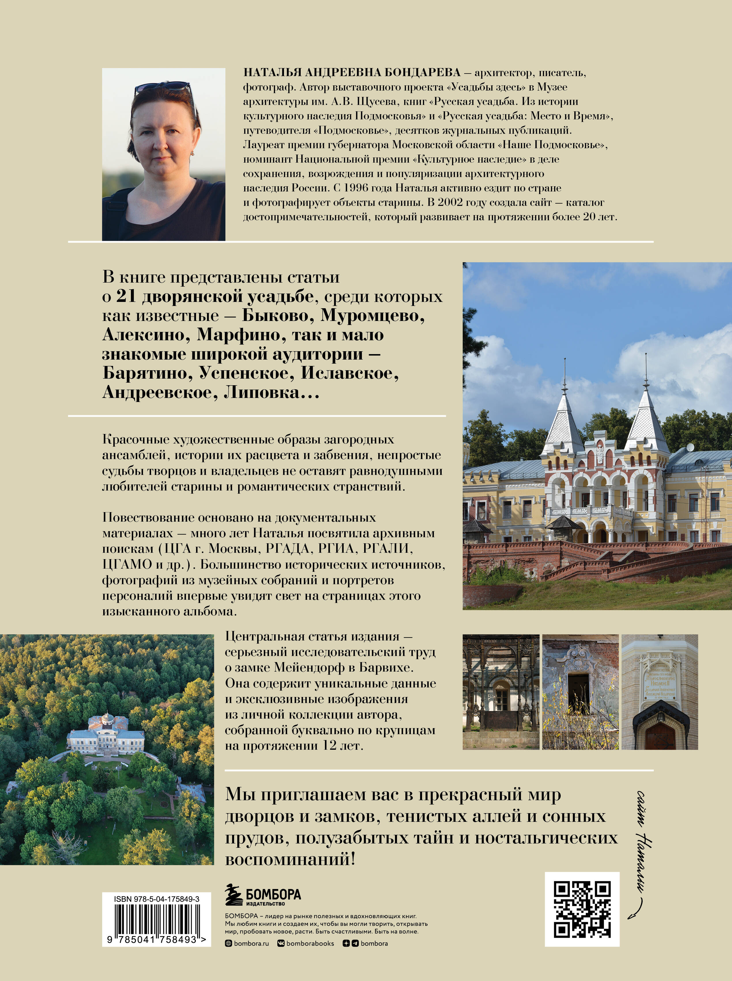 Наталья Бондарева - архитектор, фотограф и писатель. Лауреат премии Губернатора Московской области «Наше Подмосковье», а также номинант Национальной премии «Культурное наследие» за заслуги в деле сохранения, возрождения и популяризации архитектурного наследия России. Наталья путешествует с 1996 года. За это время ей удалось объездить не только все Подмосковье, но и соседние с ним области, и накопить бесценный материал о памятниках старины центральной России. Наталья ведет свой собственный блог и сайт, где делится уникальной информацией - nataturka.ru. Увидев, в каком плачевном состоянии находятся многие архитектурные и исторические памятники, как безвозвратно гибнет наше культурное наследие, Наталья решила рассказывать об этом тем, кому это не безразлично. Погрузитесь в захватывающее путешествие по истории и архитектурному наследию величественных усадеб, раскинувшихся на просторах России. На страницах книги Наталья Бондарева в деталях рассказывает о жизни знатных семейств, а также о влиянии культуры и искусства на формирование уникальных архитектурных ансамблей. Книга дает увлекательный обзор разнообразных стилей - от барокко до классицизма, от модерна до неоклассики. Роскошные парки, озера, павильоны и аллеи оживают перед глазами читателей благодаря ярким описаниям и архивным материалам. Вы найдете статьи о 21 дворянской усадьбе, среди которых как известные - Быково, Муромцево, Алексино, Марфино, так и мало знакомые широкой аудитории - Барятино, Успенское, Иславское, Андреевское, Липовка и т.д. В данном издании также впервые опубликована подробная информация про замок Майендорф (усадьба Подушкино). Загляните в окно прошлого - у вас есть возможность познакомиться с культурным наследием страны через призму ее архитектурных шедевров. Это богатое издание обязательно привлечет внимание как ценителей истории и искусства, так и всех тех, кто стремится погрузиться в увлекательный мир русских усадеб.| Издательство | ООО "Издательство "Эксмо" |