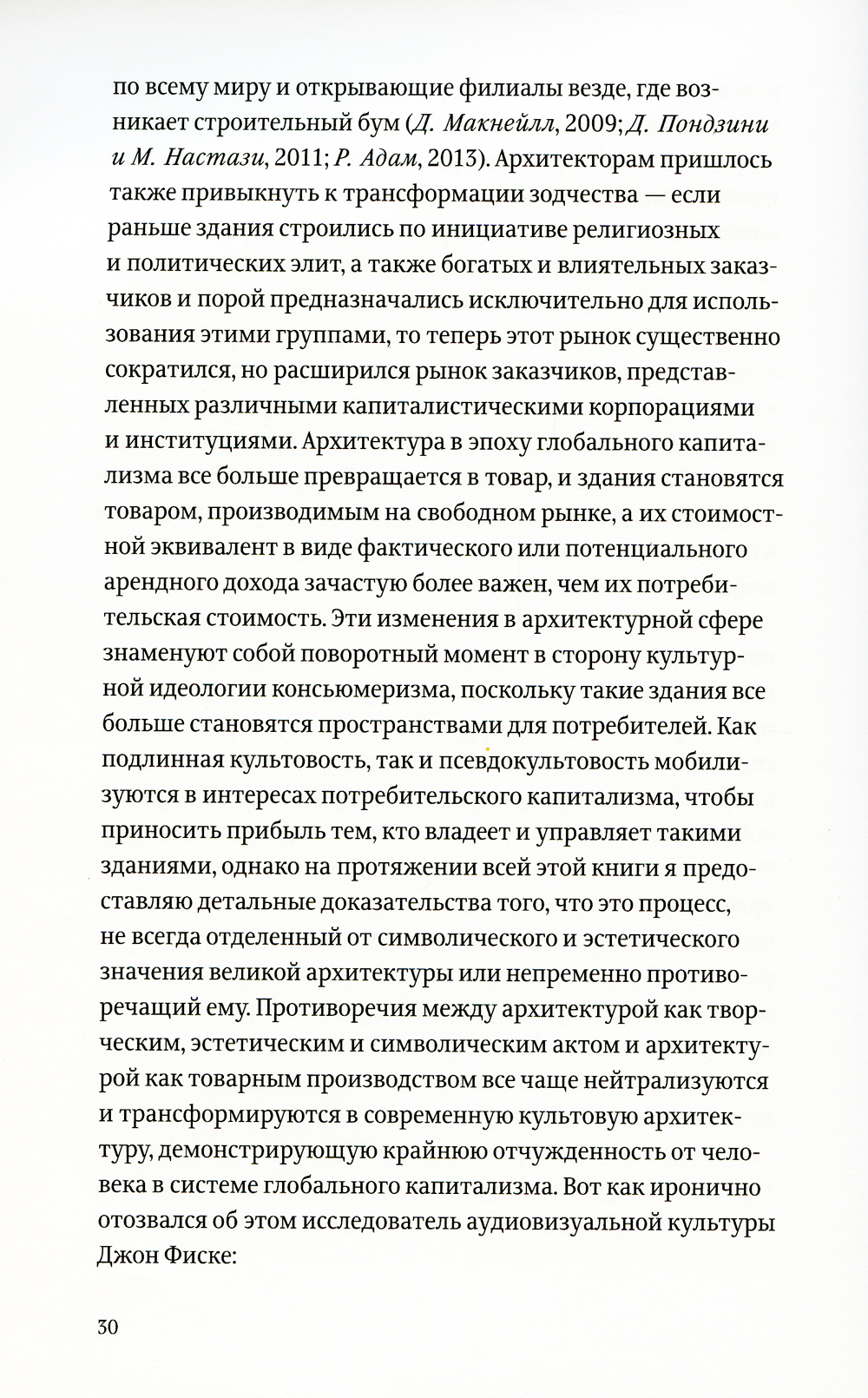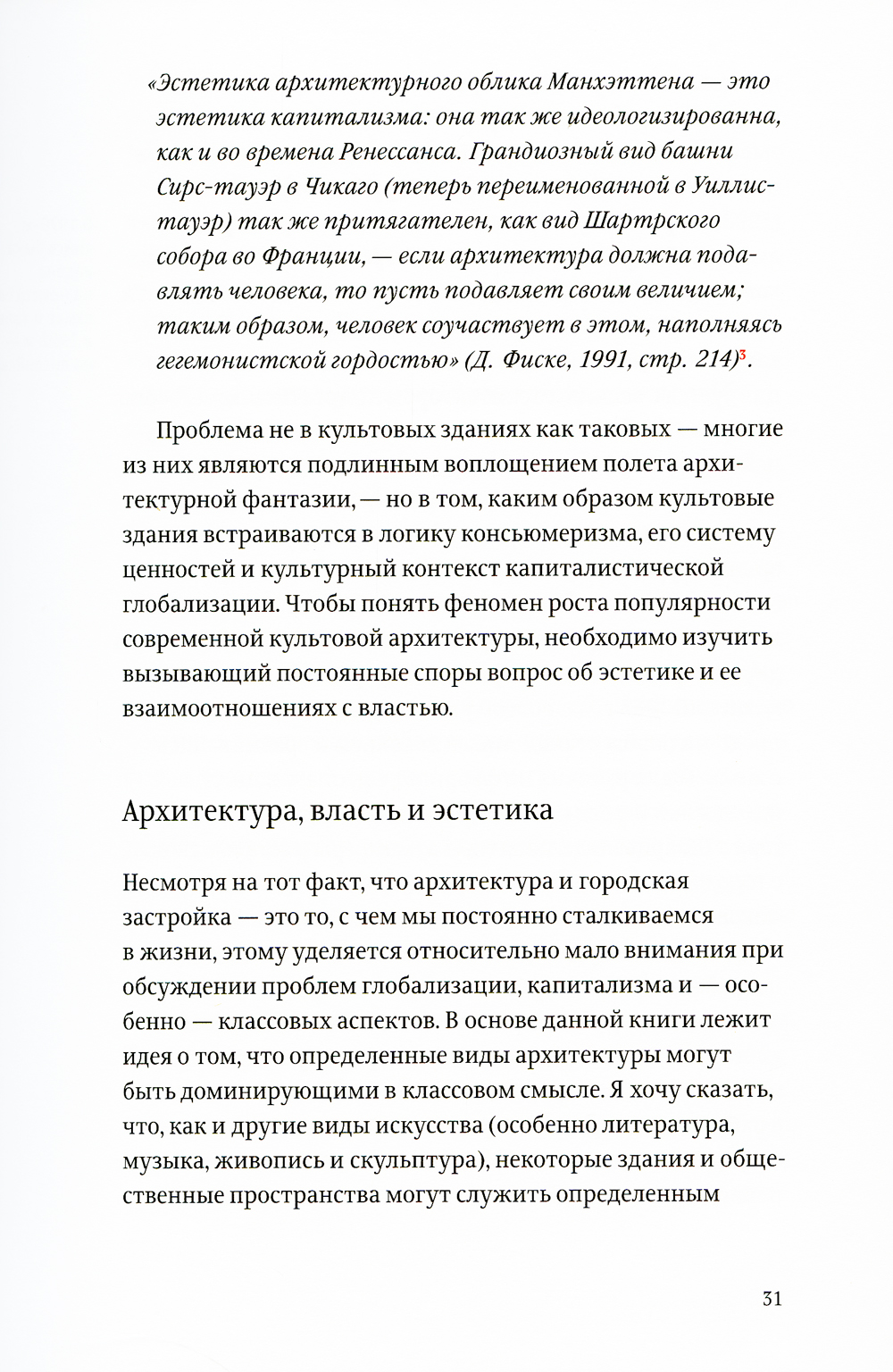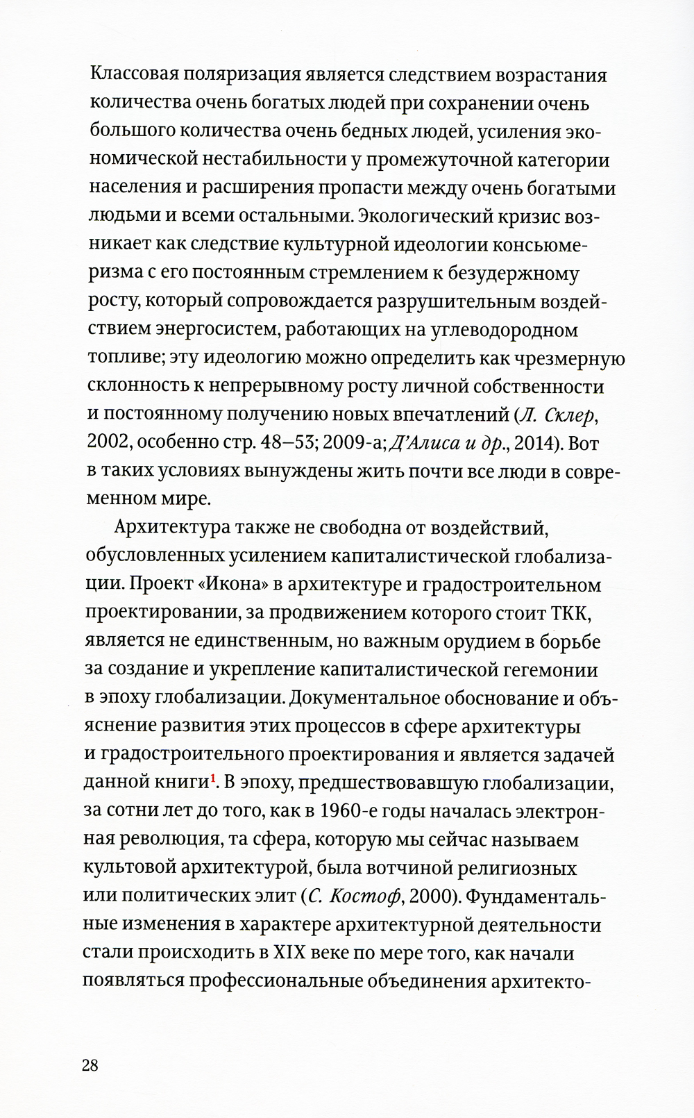 Книга известного британского социолога Лесли Склера представляет собой всеобъемлющий социологический анализ нового типа культовой архитектуры, которая стала широко распространяться по всему миру начиная с последней четверти XX века. Это мастерский обзор творчества ведущих архитекторов нашего времени и выдающихся архитектурных «икон» в контексте развития капиталистической глобализации, которая поддерживает и поощряет создание все более масштабных и амбициозных проектов. С позиций социолога, хорошо знакомого с пружинами власти частного капитала и коммерческими требованиями, которые тот предъявляет, автор прослеживает триумфальный путь глобального проекта «Икона», порождающего и поощряющего классовую поляризацию и гиперпотребление в современном обществе. Читатель может не во всем согласиться с его жесткой критикой, но в любом случае поиск альтернативной эстетики архитектурного проектирования и градостроительства представляет несомненный интерес.| Издательство | Изд. Студии Артемия Лебедева |