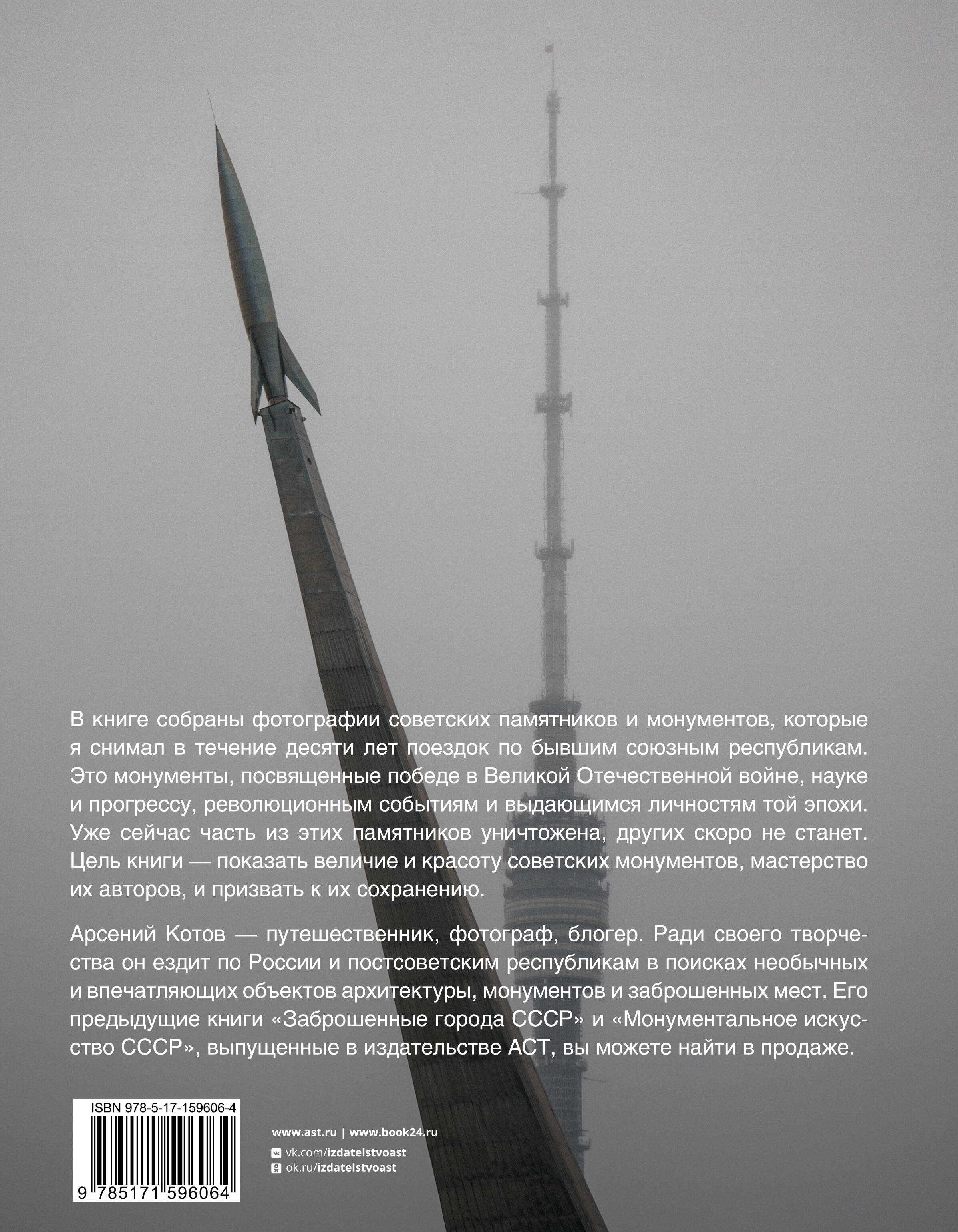 Беречь память Если вы интересуетесь культурным наследием советской эпохи и памятниками монументального искусства, обратите внимание на новую книгу фотографа-документалиста Арсения Котова «Советские монументы». В книге автор собрал снимки знаковых памятников и монументов, которые снимал в течение десяти лет в разных уголках бывших союзных республик. «Аврора», «Огонь Вечной Славы», «Мужество», «Защитникам Советского Заполярья в годы Великой Отечественной войны» - это монументы, посвященные победе в Великой Отечественной войне, а также науке и прогрессу, революционным событиям и выдающимся представителям культуры и искусства той эпохи. Эти памятники культуры безвозвратно уходят в прошлое. Призывая к сохранению монументов, автор хочет показать их красоту и мастерство авторов.| Издательство | Издательство "АСТ" |