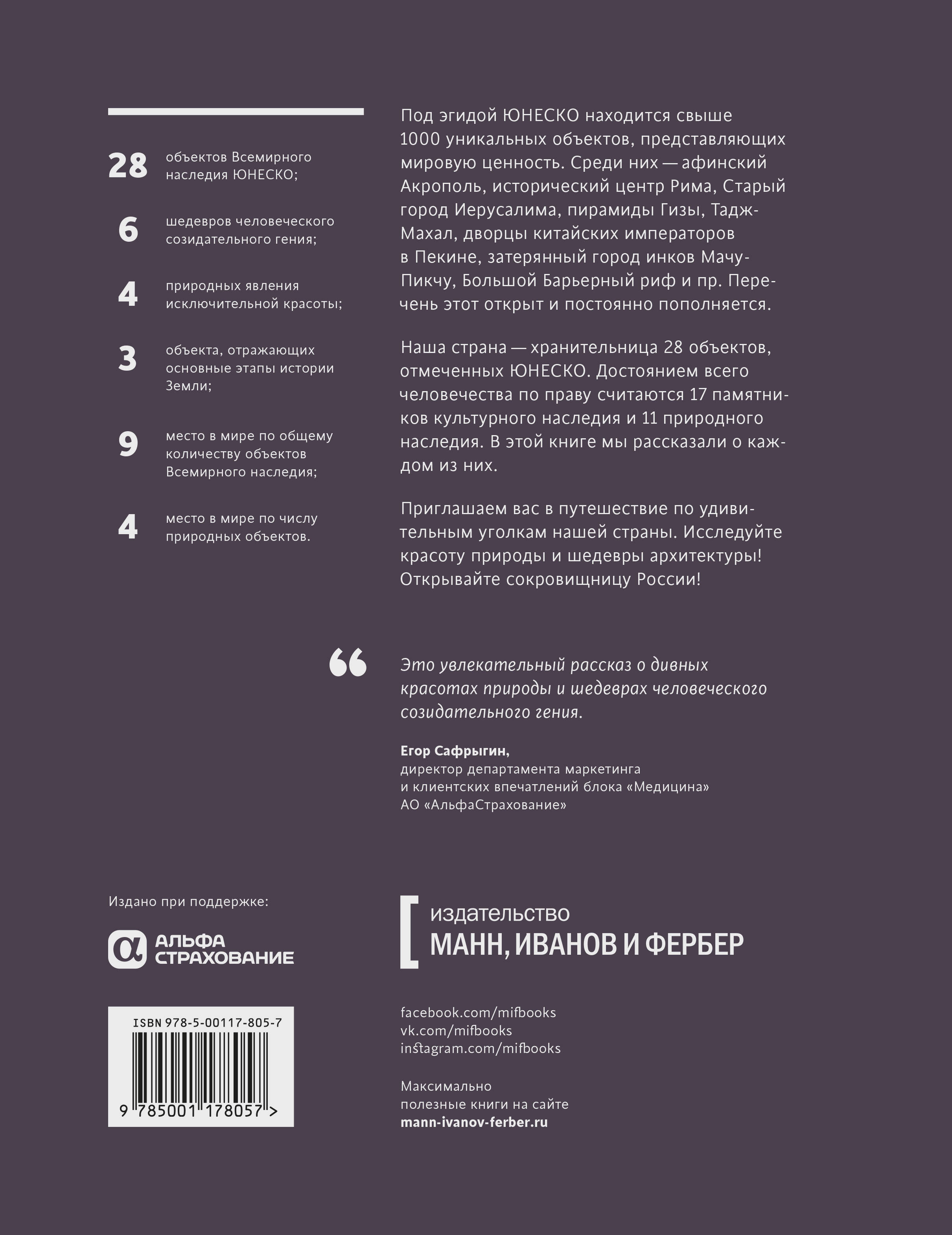 Россия - хранительница 28 объектов, отмеченных ЮНЕСКО. 17 памятников культурного наследия и 11 природного наследия по праву считаются достоянием всего человечества. В этой книге мы рассказали о каждом из них.| Издательство | МАНН, ИВАНОВ И ФЕРБЕР ООО |