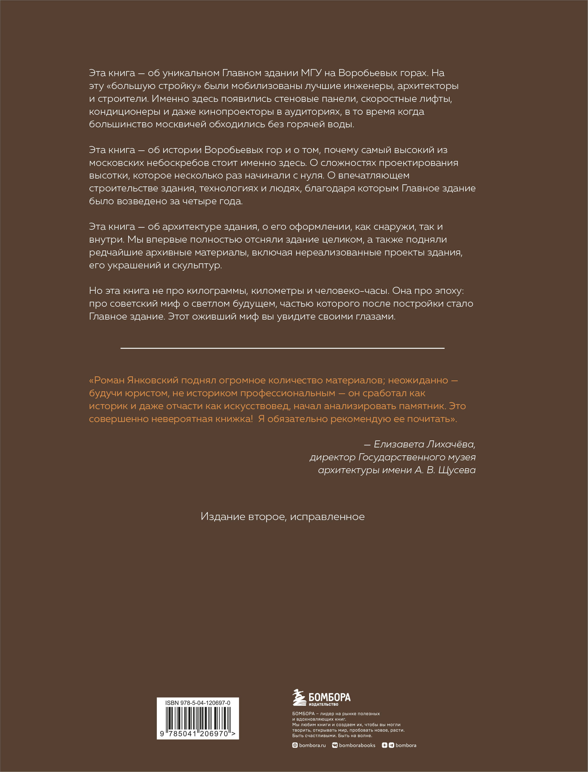 Это невероятно красивое издание, сделанное с огромной любовью к одному из самых прекрасных и величественных зданий столицы! Перед вами первая современная книга о высотном здании Московского университета, его истории, архитектуре и внутреннем устройстве. Автор Роман Янковский рассказывает о непростом проектировании высотки, на котором сменилось несколько архитектурных групп; о впечатляющем темпе строительства здания и его технологических аспектах. В этой книге вы не встретите килограммы, километры и человеко-часы, равно и обилие искусствоведческих терминов: история рассказана здесь понятным «человеческим» языком и полна увлекательных наблюдений и фактов. Главное здание Московского государственного университета по праву считается уникальным, и вот почему: - при строительстве применялись все передовые технологии, были мобилизованы лучшие советские инженеры, архитекторы и строители; - именно здесь появились стеновые панели, скоростные лифты, кондиционеры и даже кинопроекторы в аудиториях, в то время, когда большинство москвичей еще обходились без горячей воды. Специально для книги здание было полностью отснято с использованием современных технологий и оборудования. Также внутри вы найдете уникальные архивные кадры, схемы, иллюстрации и свидетельства жителей города, которые ранее не были опубликованы.