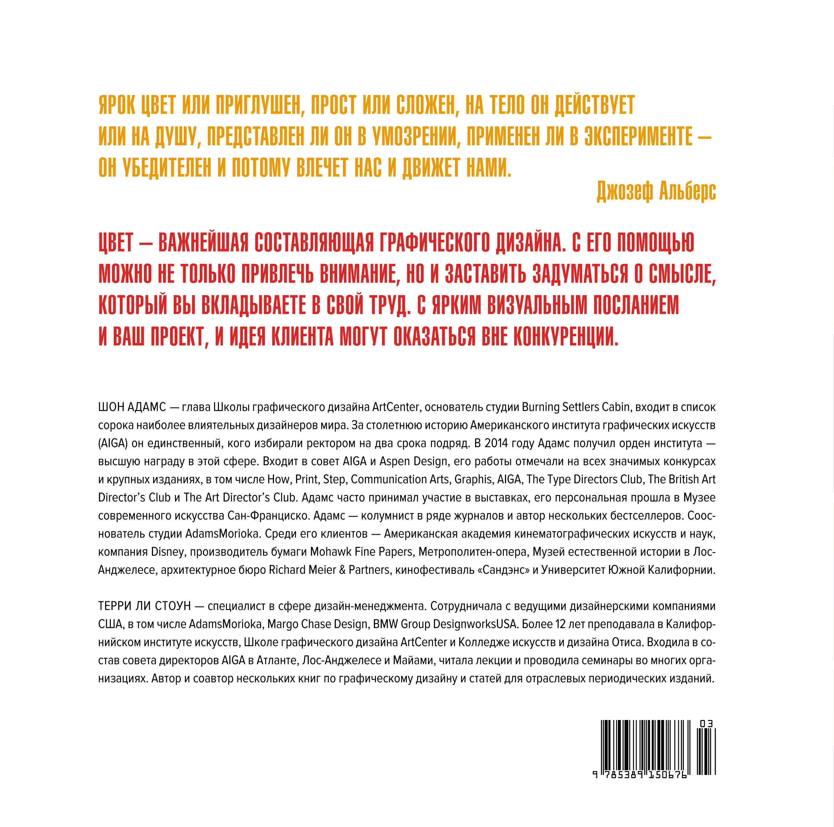 Шон Адамс - глава Школы графического дизайна ArtCenter, основатель студии Burning Settlers Cabin, входит в список сорока наиболее влиятельных дизайнеров мира. В переработанной и дополненной версии его книги, выдержавшей несколько переизданий на Западе, просто и доступно объяснены основы теории цвета, раскрыто культурное значение цветов, ключевые правила работы с цветовой палитрой, представлены знаковые цветовые системы в истории искусства и дизайна, особенности цветовосприятия и взаимодействия различных оттенков. Вы научитесь грамотно говорить с клиентами о цвете и успешно презентовать свои проекты, а также увидите примеры блестящих и вдохновляющих цветовых решений ведущих мировых дизайнеров. Эта и другая важная информация теоретического и практического характера позволит вам добиться максимально эффективного использования цвета в своих работах.| Издательство | Азбука-Аттикус Издат.группа ООО |