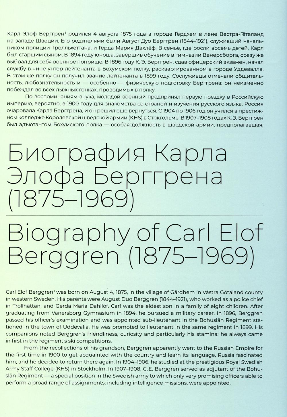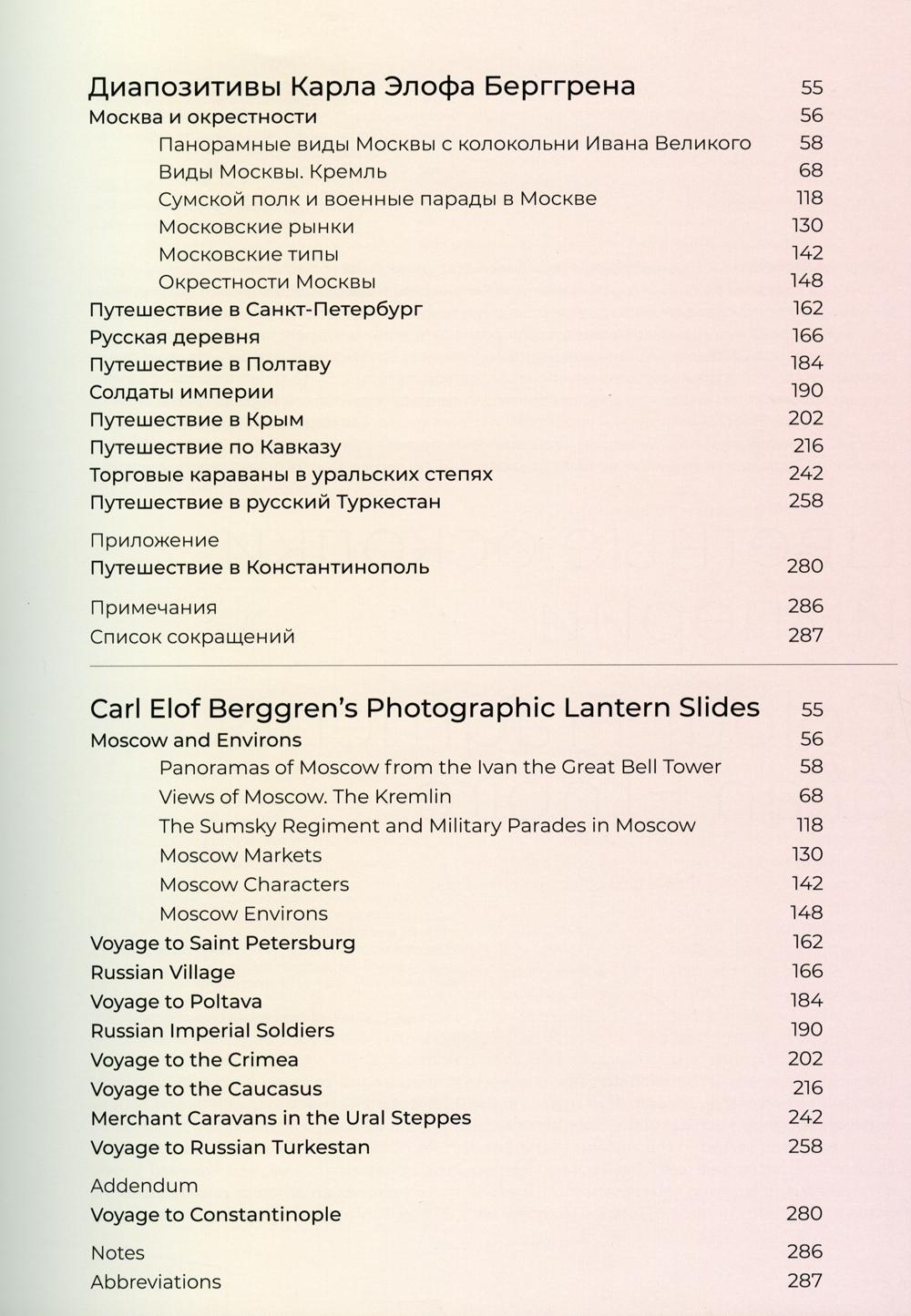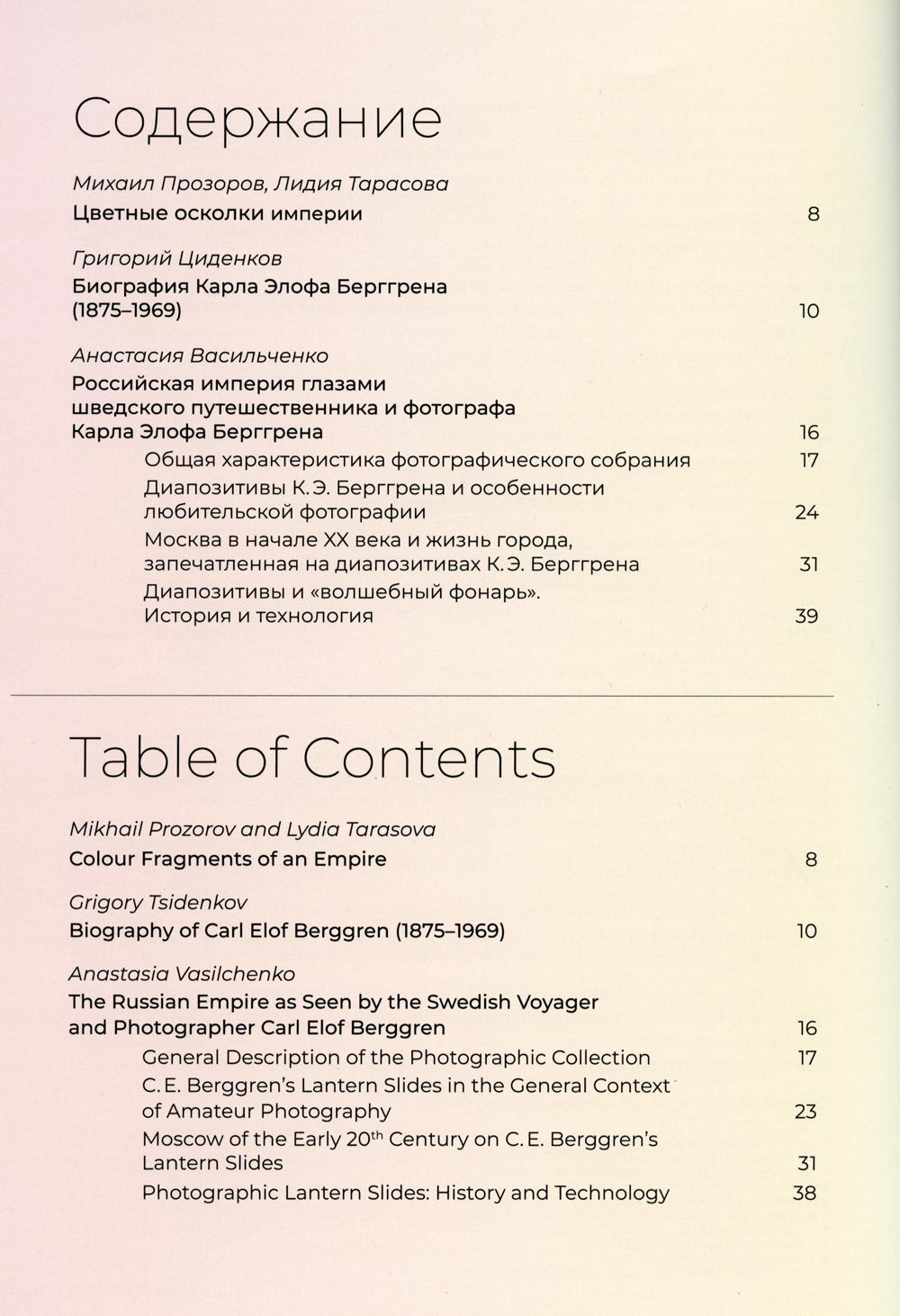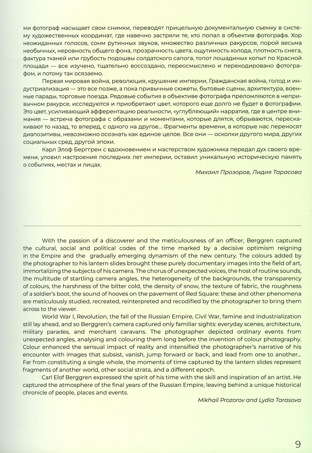 Представленная в книге коллекция цветных диапозитивов была создана кадровым шведским военным, офицером Генерального штаба и страстным путешественником Карлом Элофом Берггрёном (1875-1969), чья жизнь и карьера были тесно связаны с Россией. В начале XIX века К.Э. Берггрен осуществил целый ряд необычных путешествий по Российской империи, фиксируя на хрупкой поверхности стекла как знаковые, так и малоизвестные уголки империи, их обитателей, колоритный быт. На снимках вместе с фотографом мы наблюдаем летопись нашей страны начала XX века. Благодаря вручную добавленному цвету диапозитивы перестают быть просто документальной съемкой. Они выстраивают глубокую эмоциональную связь с осколками того мира и самим автором, который нам оставил свой яркий взгляд на последние годы великой страны.