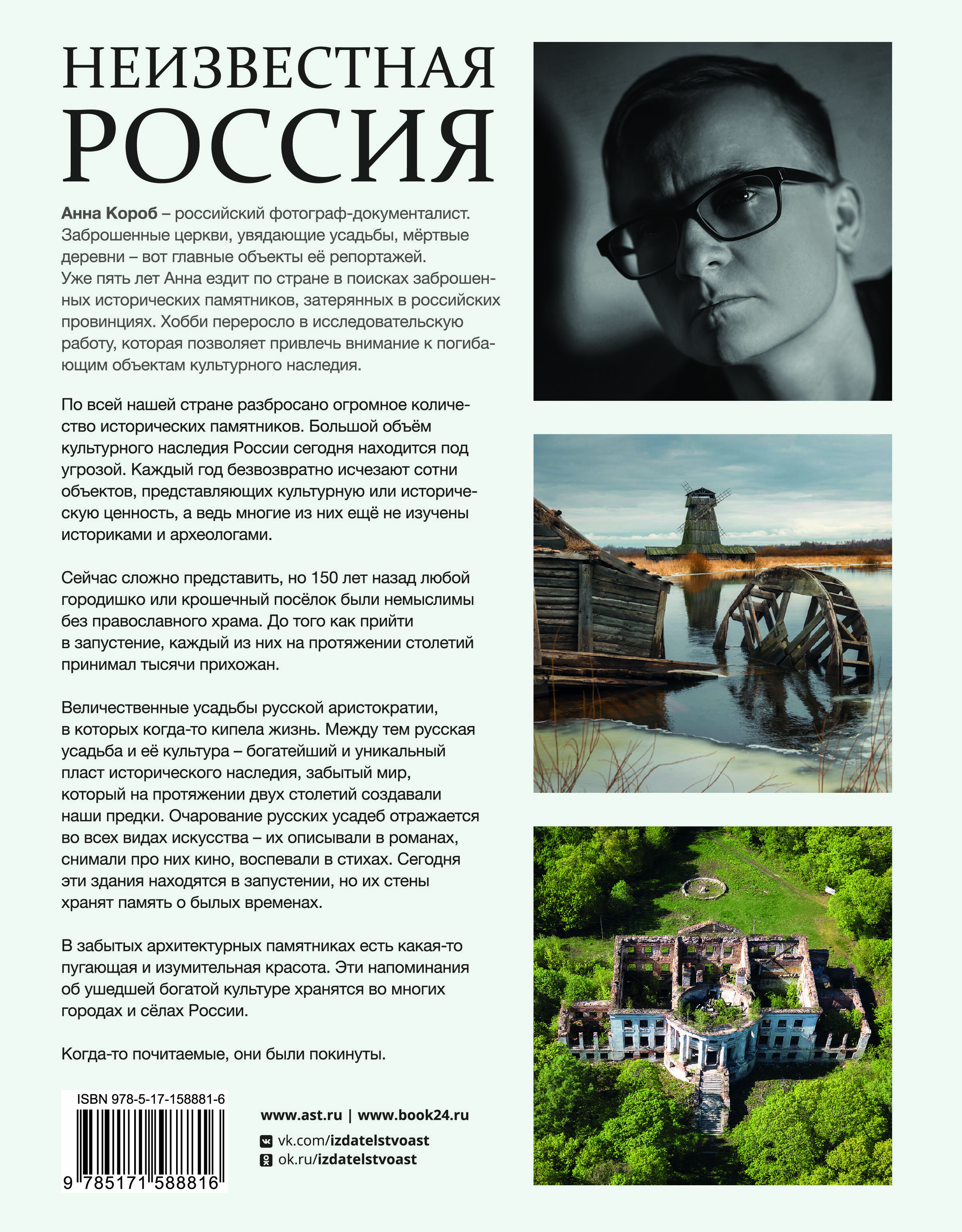 Анна Короб - российский фотограф-документалист. Заброшенные церкви, увядающие усадьбы, мёртвые деревни - вот главные объекты её репортажей. Уже пять лет Анна ездит по стране в поисках заброшенных исторических памятников, затерянных в российских провинциях. Хобби переросло в исследовательскую работу, которая позволяет привлечь внимание к погибающим объектам культурного наследия. По всей нашей стране разбросано огромное количество исторических памятников. Большой объём культурного наследия России сегодня находится под угрозой. Каждый год безвозвратно исчезают сотни объектов, представляющих культурную или историческую ценность, а ведь многие из них ещё не изучены историками и археологами. Сейчас сложно представить, но 150 лет назад любой городишко или крошечный посёлок были немыслимы без православного храма. До того как прийти в запустение, каждый из них на протяжении столетий принимал тысячи прихожан. Величественные усадьбы русской аристократии, в которых когда-то кипела жизнь. Между тем русская усадьба и её культура - богатейший и уникальный пласт исторического наследия, забытый мир, который на протяжении двух столетий создавали наши предки. Очарование русских усадеб отражается во всех видах искусства - их описывали в романах, снимали про них кино, воспевали в стихах. Сегодня эти здания находятся в запустении, но их стены хранят память о былых временах. В забытых архитектурных памятниках есть какая-то пугающая и изумительная красота. Эти напоминания об ушедшей богатой культуре хранятся во многих городах и сёлах России. Когда-то почитаемые, они были покинуты.| Издательство | ИЗДАТЕЛЬСТВО "АСТ" |