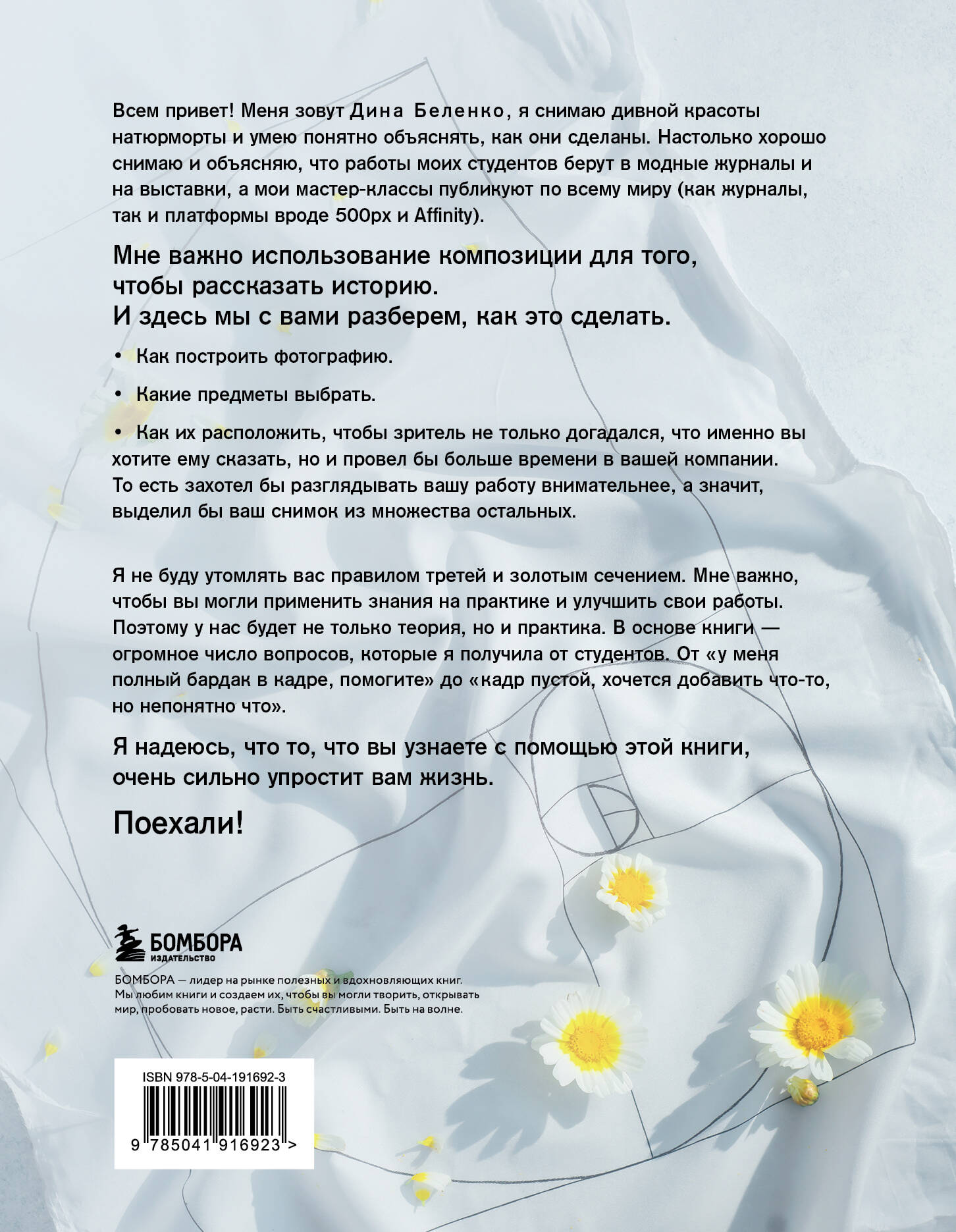 Разговоры о композиции обычно начинаются с золотого сечения и продолжаются академизмами из категории «все об этом слышали, а как пользоваться - неясно», но ведь намного полезней говорить о конкретных работающих приемах. Дина Беленко - амбассадор одного из крупнейших фотосайтов 500px. С 2011 года она специализируется на концептуальном натюрморте и помогает другим генерировать идеи для необычных сюжетов на снимках. Автор книги «Карманный генератор идей» представляет свою новую книгу о том, как правильно построить композицию, используя действенные приемы, свои прекрасные работы как пример и личный опыт. Лучшее обучение - это интерактивное обучение! В книге вас ждут упражнения, домашние задания и множество фотопримеров. У вас будет лучшая мотивация попробовать на деле те принципы, о которых будут говорить. Почему книга устроена именно таким образом? Потому что в ее основе - огромное число вопросов, которые Дина получила от студентов. От «у меня полный бардак в кадре, помогите» до «кадр пустой, хочется добавить что-то, но непонятно что». Если перед вами стояла задача сделать композицию для фотографии или рисунка и вы задавались вопросами: • Что такое баланс? • Как использовать простые формы? • Почему все рассыпается и, главное, как сделать красиво? - то здесь вы найдете на них ответы!| Издательство | ООО "Издательство "Эксмо" |