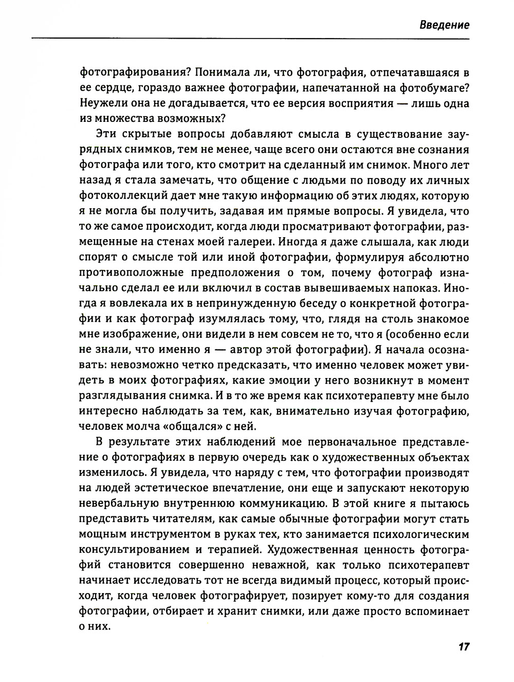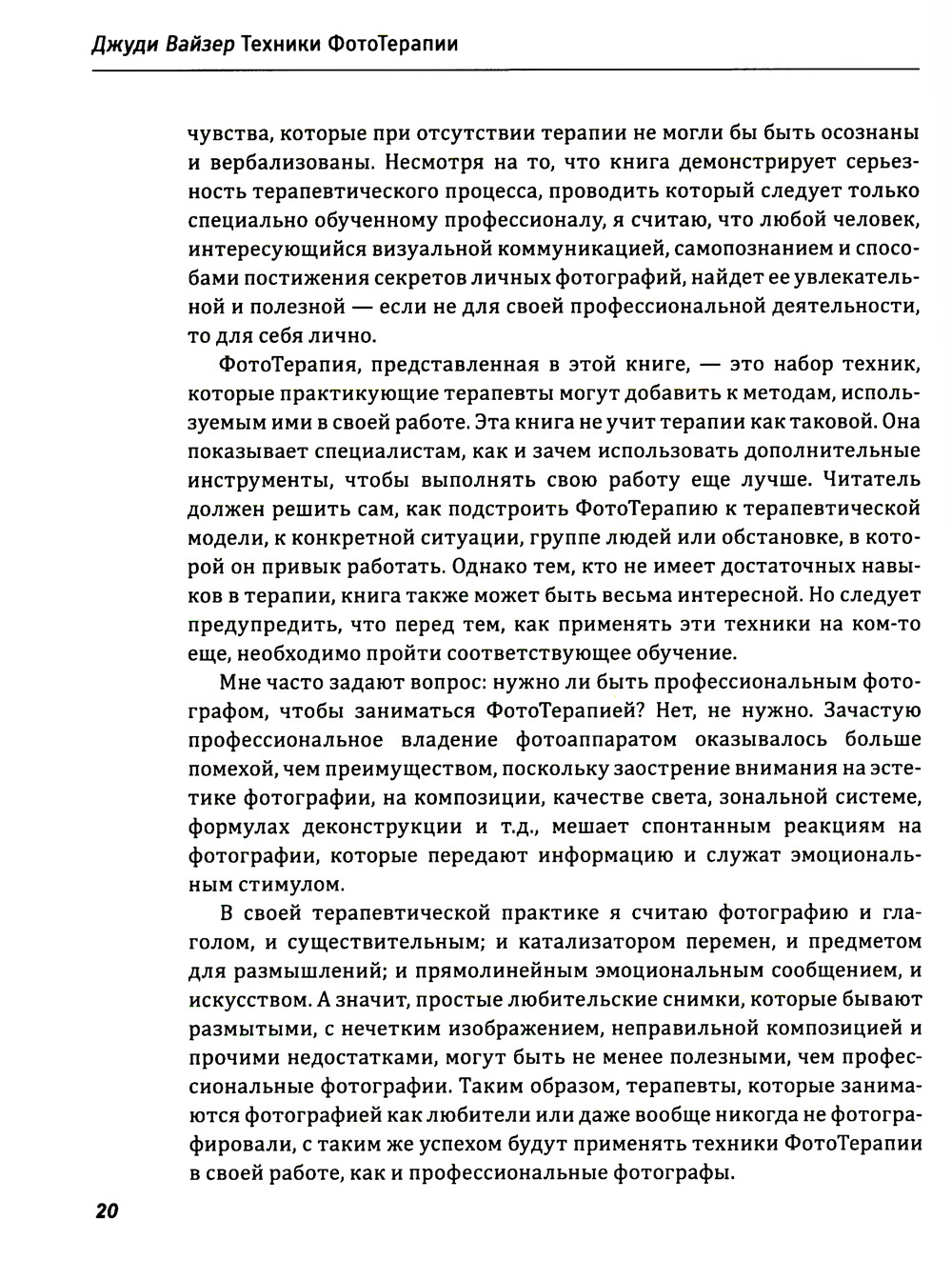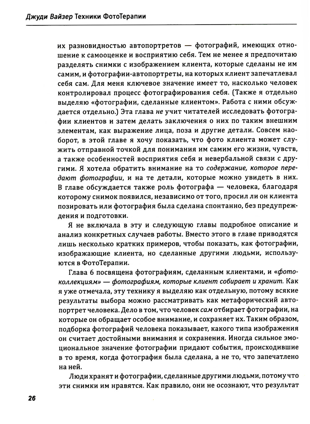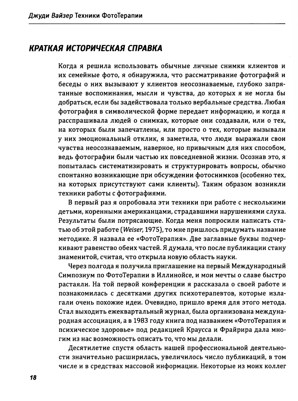 В книге Дж. Вайзер, специалиста мирового уровня в области ФотоТерапии, изложены теоретические положения ФотоТерапии, описаны техники и способы их применения на практике. Представлены приемы работы с использованием разных типов фотографий: от автопортретов и семейных снимков до любых фотоизображений, вызывающих у людей эмоциональный отклик. Это настоящий кладезь процедур и упражнений, которые можно использовать в работе не только с фотографиями, но и с любыми метафорическими изображениями (поэтому книга будет особенно интересна поклонникам метафорических карт). На примере реальных случаев автор показывает, как техники ФотоТерапии могут быть интегрированы в терапевтический процесс, и тем самым вооружает специалистов, независимо от их теоретической принадлежности, эффективным инструментом работы. Книга будет интересна как профессионалам, так и неспециалистам, которые интересуются психологией и ФотоТерапией.