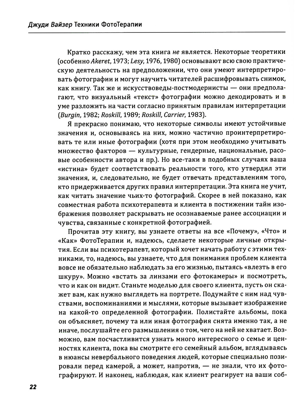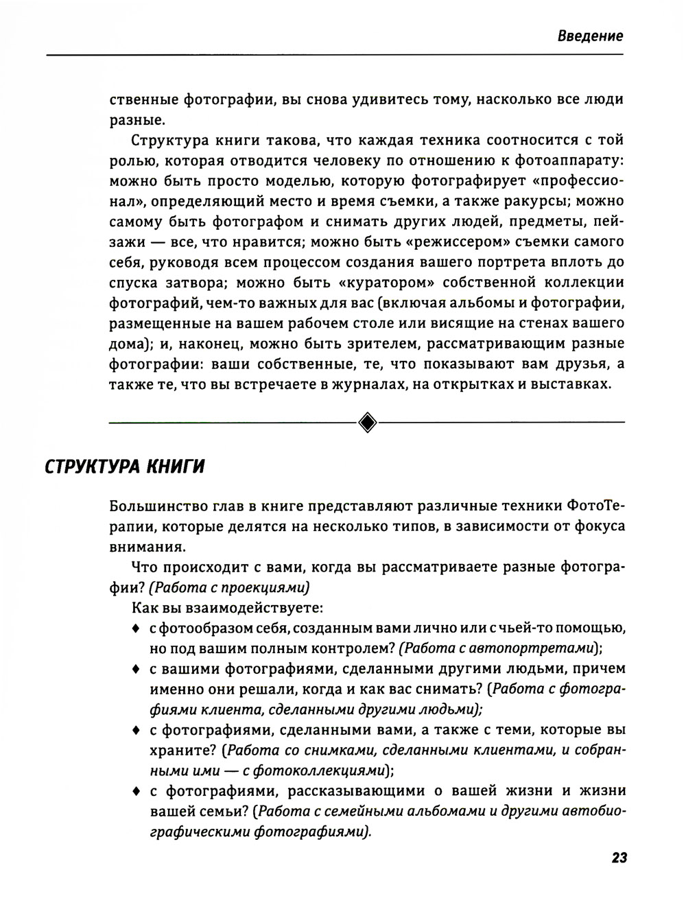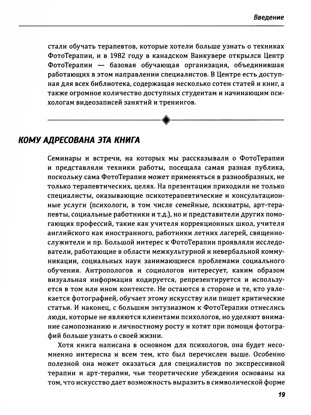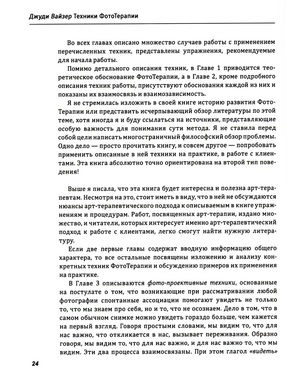В книге Дж. Вайзер, специалиста мирового уровня в области ФотоТерапии, изложены теоретические положения ФотоТерапии, описаны техники и способы их применения на практике. Представлены приемы работы с использованием разных типов фотографий: от автопортретов и семейных снимков до любых фотоизображений, вызывающих у людей эмоциональный отклик. Это настоящий кладезь процедур и упражнений, которые можно использовать в работе не только с фотографиями, но и с любыми метафорическими изображениями (поэтому книга будет особенно интересна поклонникам метафорических карт). На примере реальных случаев автор показывает, как техники ФотоТерапии могут быть интегрированы в терапевтический процесс, и тем самым вооружает специалистов, независимо от их теоретической принадлежности, эффективным инструментом работы. Книга будет интересна как профессионалам, так и неспециалистам, которые интересуются психологией и ФотоТерапией.