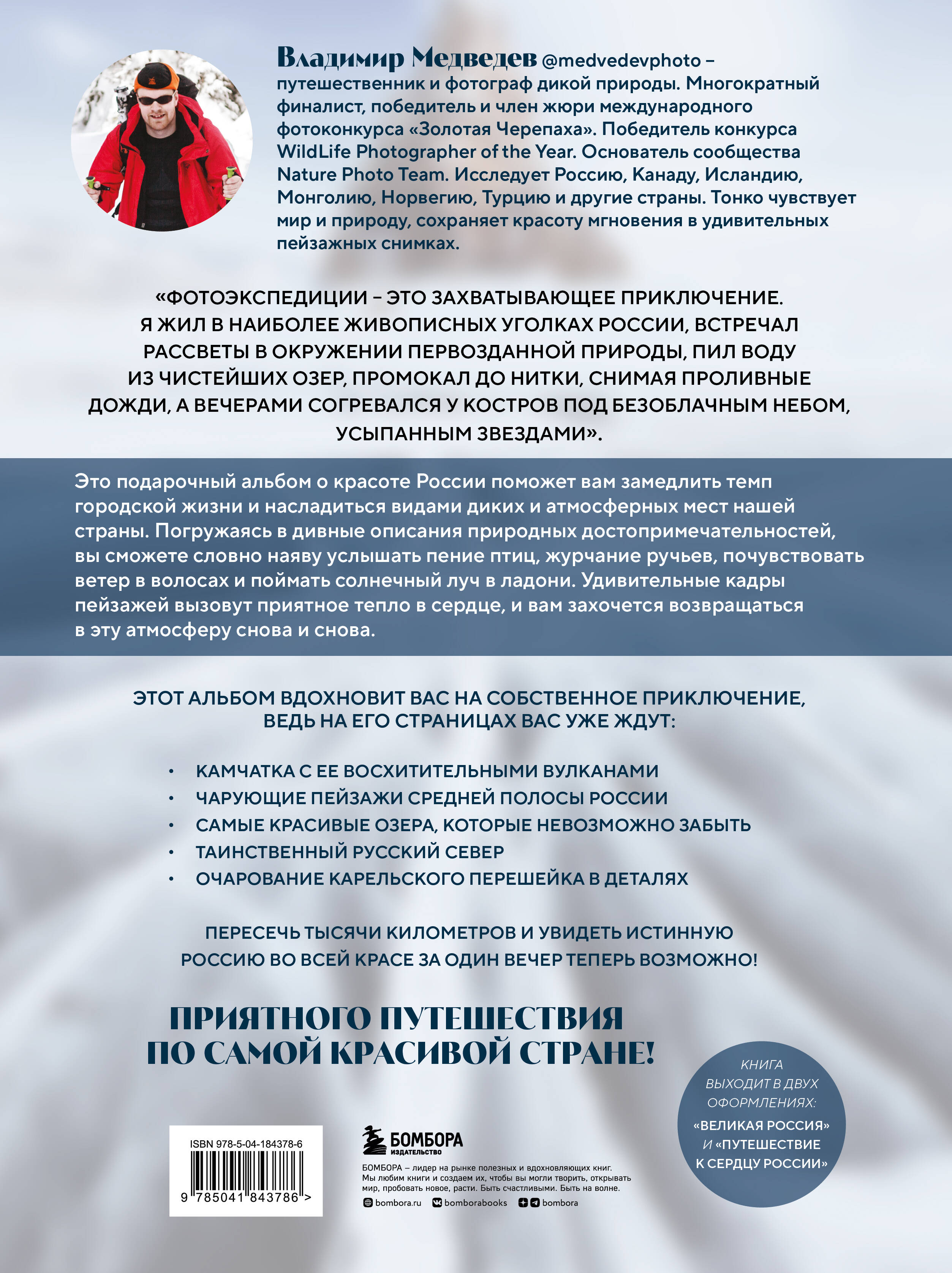 Коллекционное издание для настоящих ценителей фотографии! Фотоальбом, призванный вдохновить на невероятные путешествия по России. Известный талантливый фотограф Владимир Медведев много лет по крупицам собирал сюжеты снимков, которыми вы сможете насладиться прямо сейчас. На страницах этого подарочного альбома вас ждут: • Камчатка с ее восхитительными вулканами. • Чарующие пейзажи средней полосы России. • Самые красивые озера, которые невозможно забыть. • Таинственный Русский Север. • Очарование Карельского Перешейка в деталях. Любоваться пейзажами можно бесконечно, но еще более ценно, что вы узнаете и увидите то, что открывается лишь самым искушенным путешественникам. Вы станете больше, чем сторонним наблюдателем и читателем, вместе с впечатлениями и заметками Владимира Медведева вы полностью погрузитесь в атмосферу каждой фотографии и каждого уголка нашей страны. Пересечь тысячи километров и увидеть истинную Россию во всей красе за один вечер теперь возможно! Альбом выходит в двух оформлениях: - «Великая Россия. Альбом дикой природы от Белого моря до Камчатки». - «Путешествие к сердцу России. Альбом дикой природы от Белого моря до Камчатки».| Издательство | ООО "Издательство "Эксмо" |