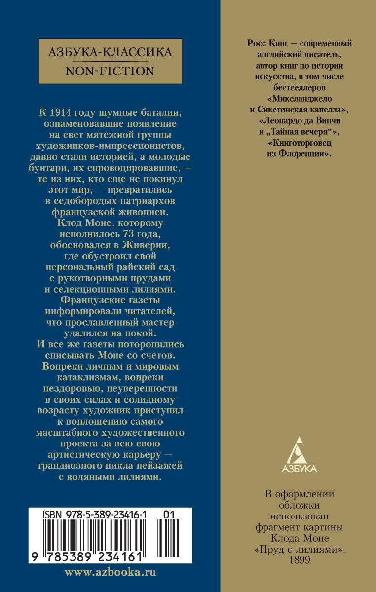 К 1914 году шумные баталии, ознаменовавшие появление на свет мятежной группы художников-импрессионистов, давно стали историей, а молодые бунтари, их спровоцировавшие, - те из них, кто еще не покинул этот мир, - превратились в седобородых патриархов французской живописи. Клод Моне, которому исполнилось 73 года, обосновался в Живерни, где обустроил свой персональный райский сад с рукотворными прудами и селекционными лилиями. Французские газеты информировали читателей, что прославленный мастер удалился на покой. И все же газеты поторопились списывать Моне со счетов. Вопреки личным и мировым катаклизмам, вопреки нездоровью, неуверенности в своих силах и солидному возрасту художник приступил к воплощению самого масштабного художественного проекта за всю свою артистическую карьеру - грандиозного цикла пейзажей с водяными лилиями.| Издательство | Азбука-Аттикус Издат.группа ООО |