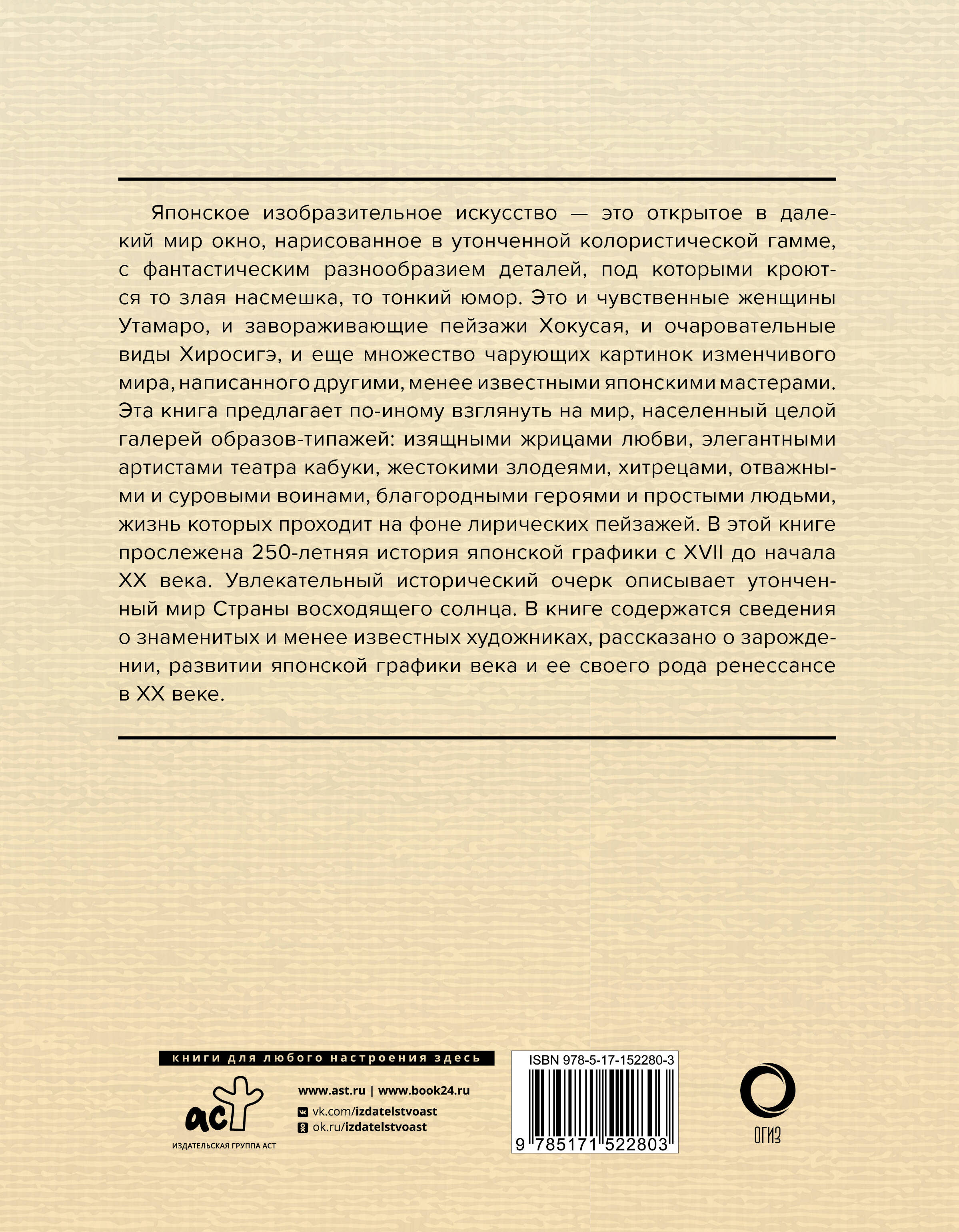 Начиная с XVIII века, в японском изобразительном искусстве появляется гравюра на дереве (ксилография). Сюжеты, которые вдохновляли художников, творивших в этом направлении, получили название "укиё-э́" - образы изменчивого мира. В укиё-э японское искусство достигло удивительного технического совершенства, выразительности и изящности. Это открытое в далекий мир окно, нарисованное в утонченной колористической гамме, с фантастическим разнообразием деталей, под которыми кроются то злая насмешка, то тонкий юмор. Это и чувственные женщины Утамаро, и завораживающие пейзажи Хокусая и очаровательные виды Хиросигэ и еще множество чарующих картинок изменчивого мира, написанного другими, менее известными японскими мастерами. Эта книга предлагает по-иному взглянуть на мир, населенный целой галерей образов-типажей: изящными жрицами любви, элегантными артистами театра Кабуки, жестокими злодеями, хитрецами, отважными и суровыми воинами, благородными героями и простыми людьми, жизнь которых проходит на фоне лирических пейзажей. В этой книге прослежена 250-летняя история японской графики, с XVII и до начала XX века. Увлекательный исторический очерк описывает утонченный мир Страны восходящего солнца. В книге содержатся сведения о знаменитых и менее известных художниках, рассказано о зарождении, развитии и своего рода Ренессансе японской графики XX века.| Издательство | ИЗДАТЕЛЬСТВО "АСТ" |
