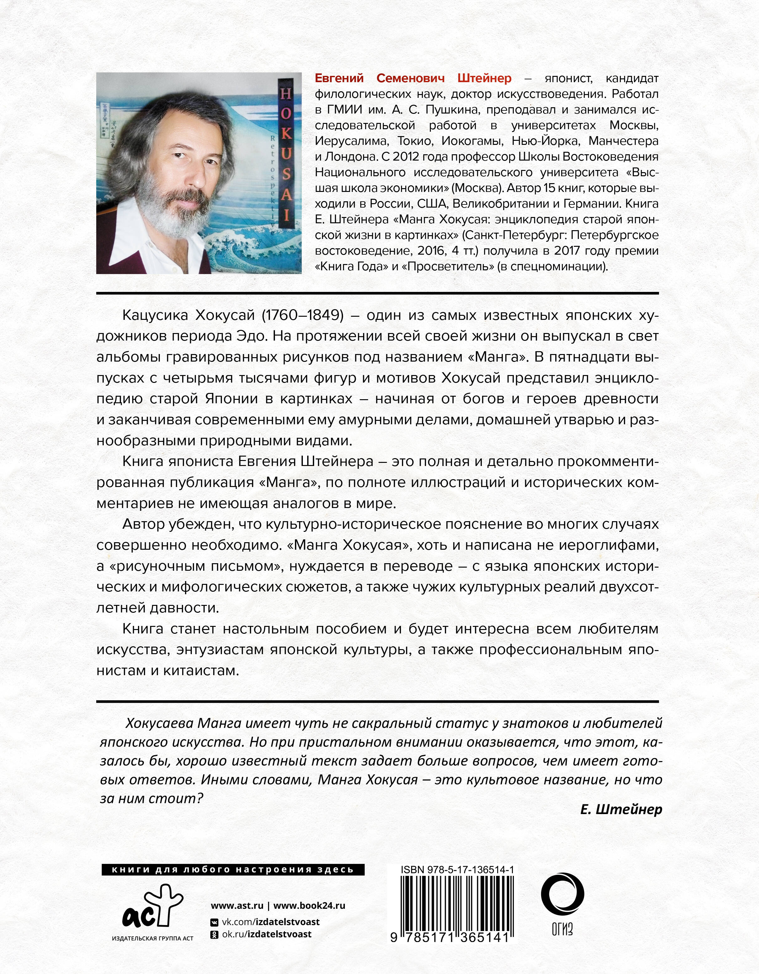 Манга Хокусая: энциклопедия японской жизни в картинках. Полная публикация, исследование и комментарий япониста Евгения Штейнера, по полноте иллюстраций и исторических комментариев не имеющая аналогов в мире. Книга станет настольным пособием и будет интересна всем любителям искусства, энтузиастам японской культуры, а также профессиональным японистам и китаистам. Книга напечатана на матовой мелованной бумаге, цветные форзацы, обложка с тиснением фольгой под пленку.| Издательство | АСТ |