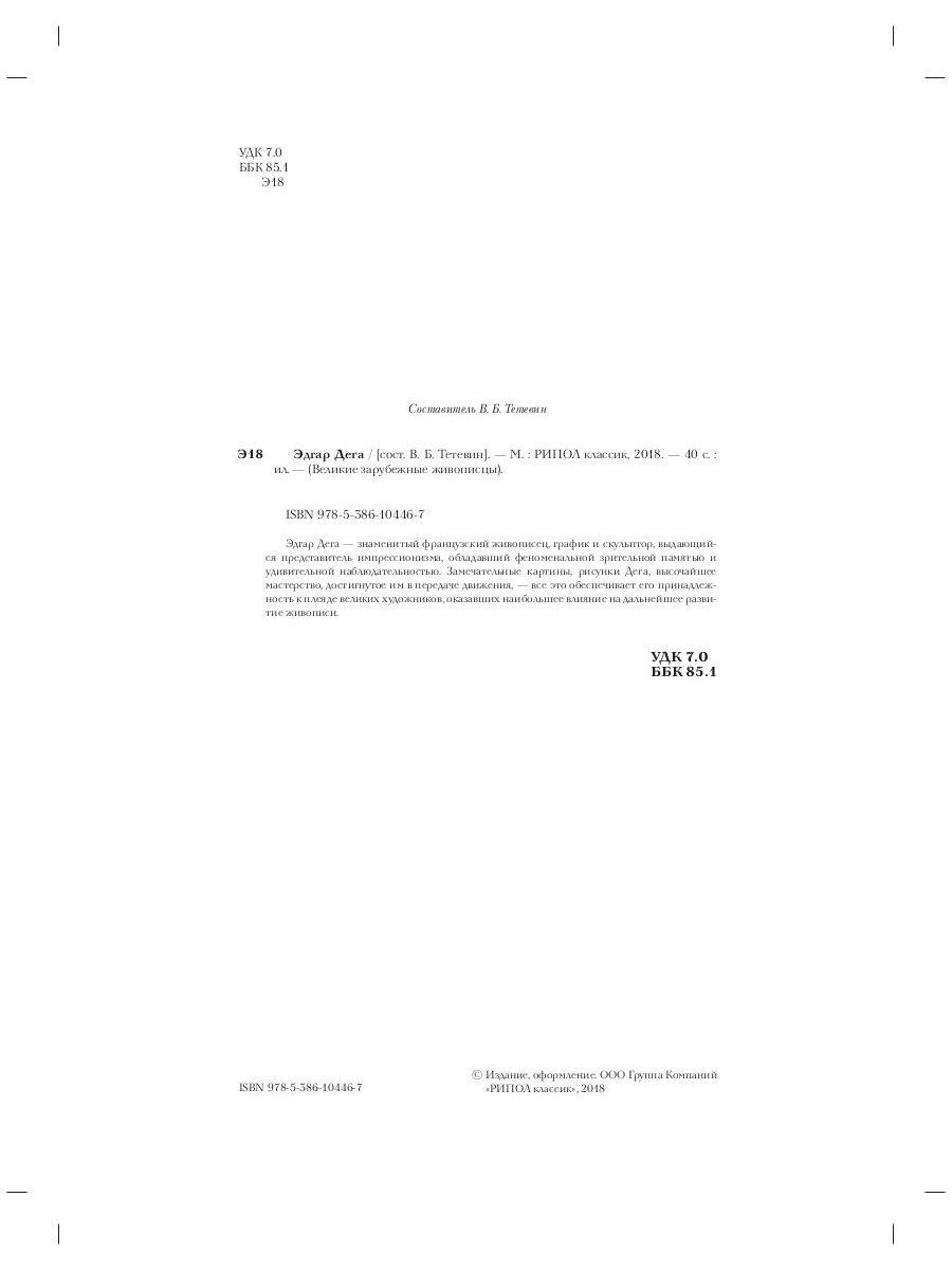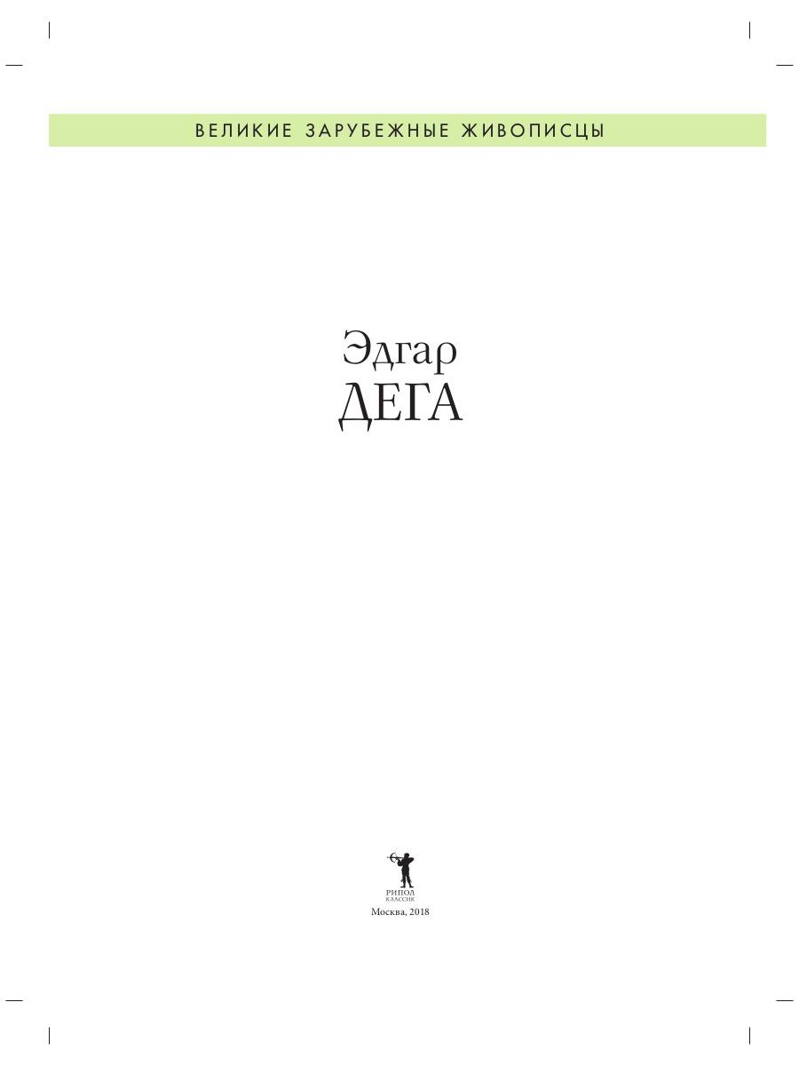 Эдгар Дега - знаменитый французский живописец, график и скульптор, выдающийся представитель импрессионизма, обладавший феноменальной зрительной памятью и удивительной наблюдательностью. Замечательные картины, рисунки Дега, высочайшее мастерство, достигнутое им в передаче движения, - все это обеспечивает его принадлежность к плеяде великих художников, оказавших наибольшее влияние на дальнейшее развитие живописи.| Издательство | Рипол Классик |
