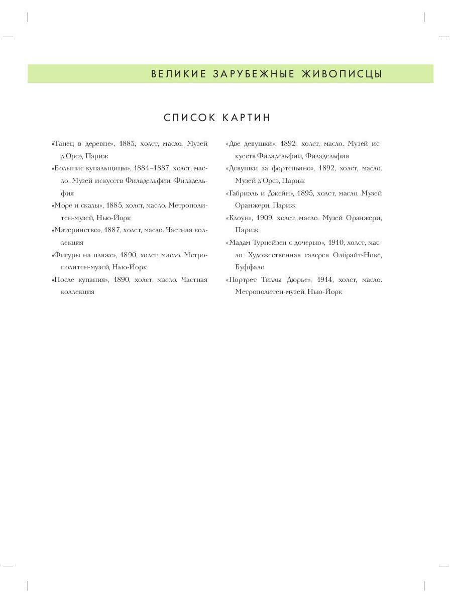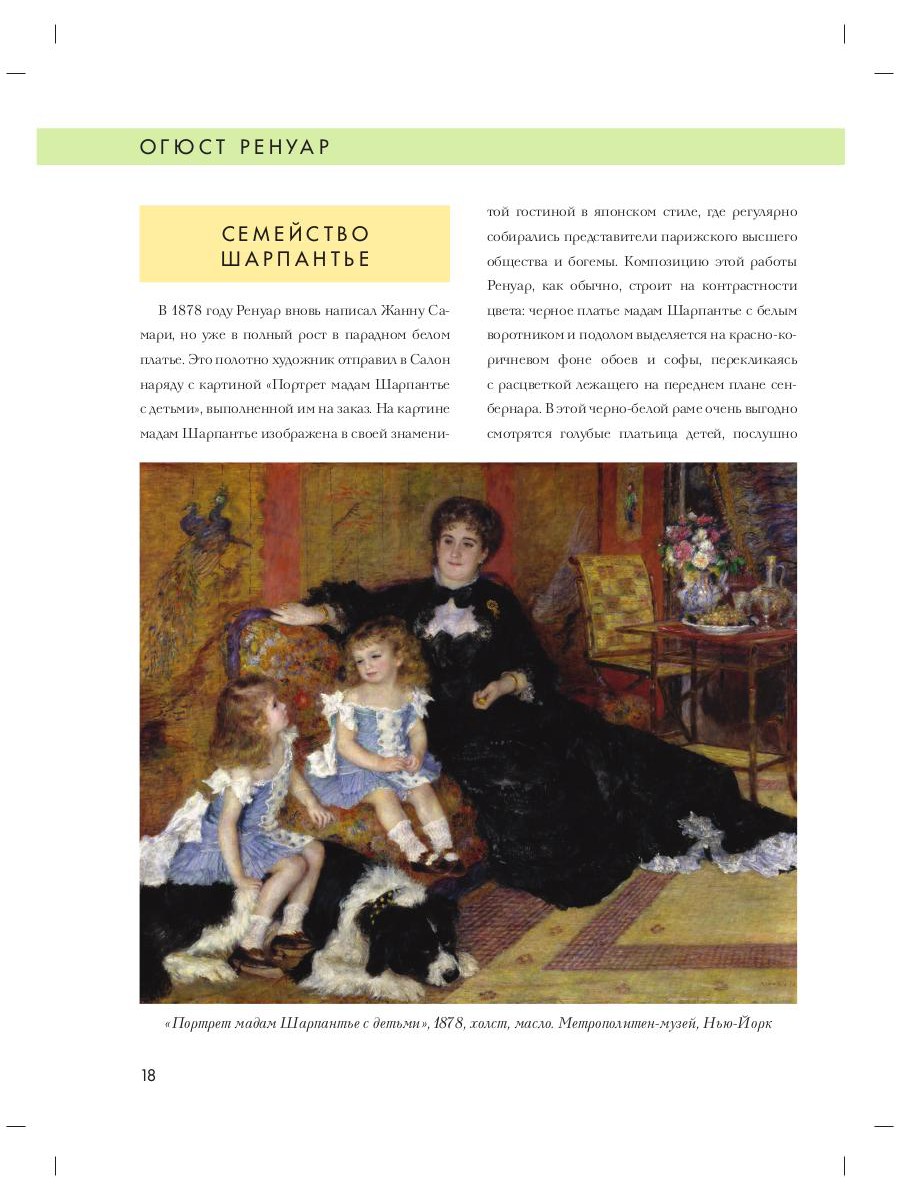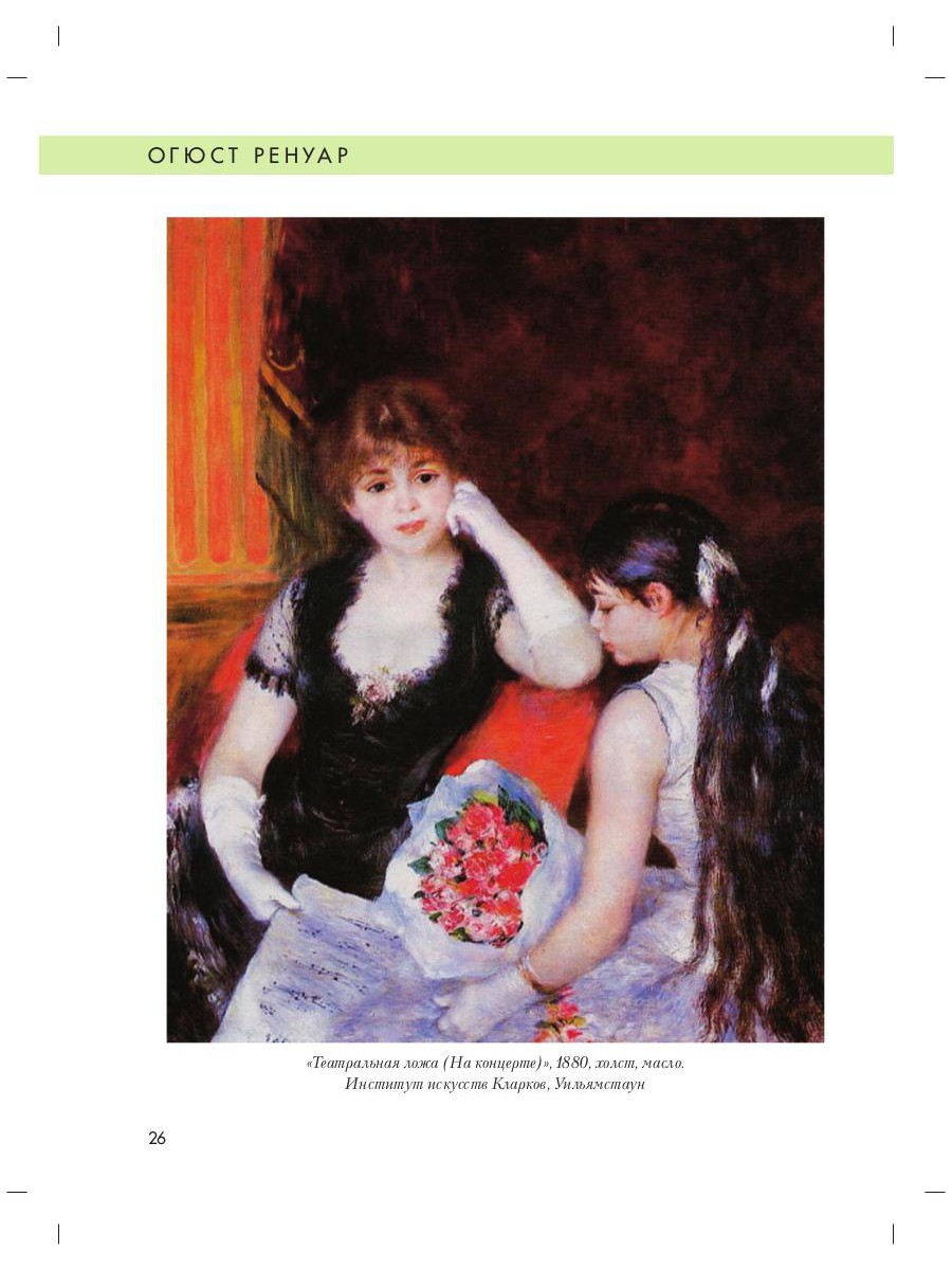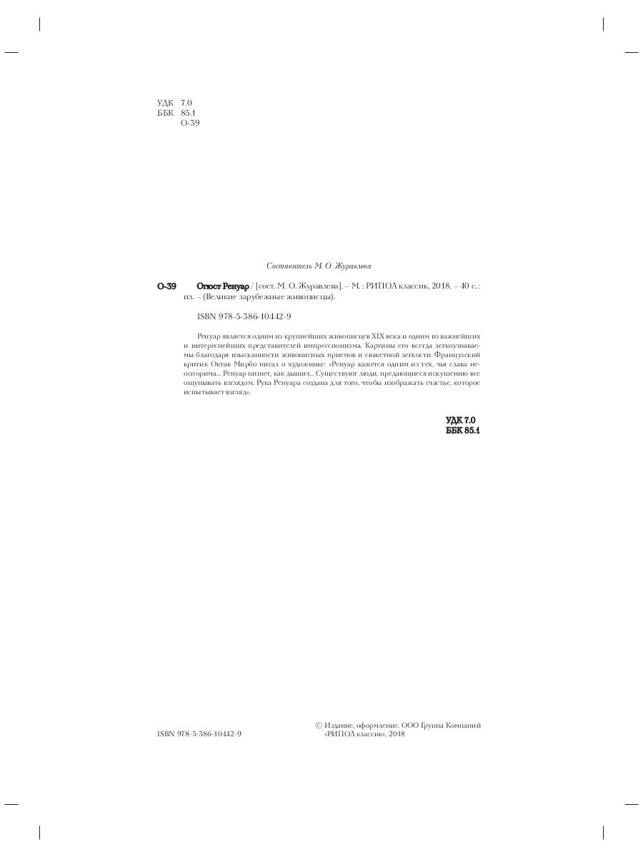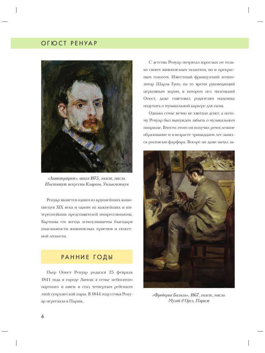Ренуар является одним из крупнейших живописцев XIX века и одним из важнейших и интереснейших представителей импрессионизма. Картины его всегда легкоузнаваемы благодаря изысканности живописных приемов и сюжетной легкости. Французский критик Октав Мирбо писал о художнике: «Ренуар кажется одним из тех, чья слава неоспорима... Ренуар пишет, как дышит... Существуют люди, предающиеся искушению все ощупывать взглядом. Рука Ренуара создана для того, чтобы изображать счастье, которое испытывает взгляд».| Издательство | Рипол Классик |