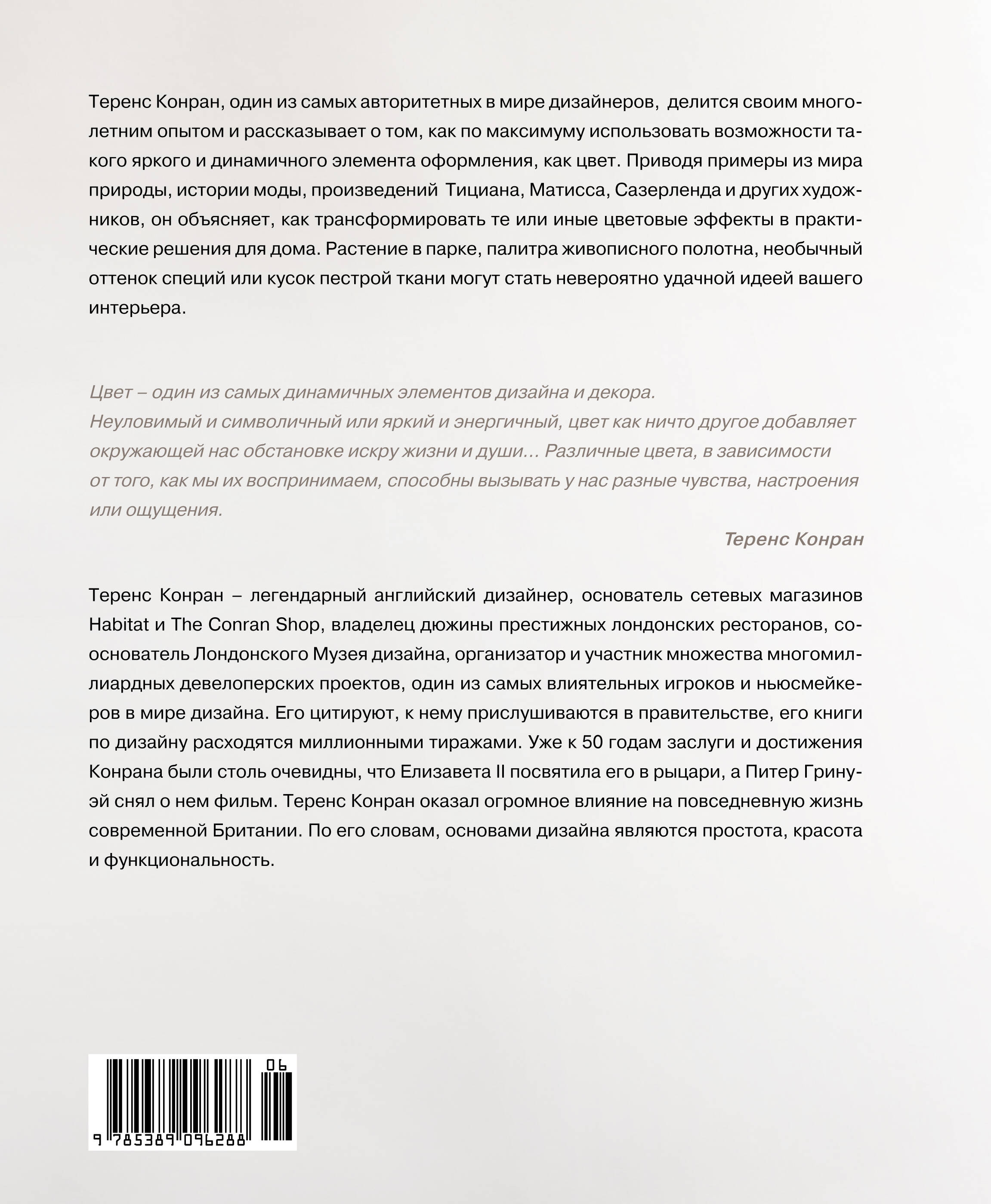 Теренс Конран, один из ведущих дизайнеров мира, признанный мастер цветовых эффектов, рассказывает в этой книге увлекательные истории о простых и сложных цветах и их особенностях, дает бесценные советы об их применении на примере лучших современных интерьеров со всего мира - образцов блестящего сочетания продуманного дизайна и неповторимой индивидуальности. Великолепные фотографии, украшающие это издание, наглядно демонстрируют, что успешное использование цвета - это не только правильно выбранная краска для стен и подходящее напольное покрытие. Порой все решает один тщательно выверенный акцент или удачная фокусная точка…| Издательство | Азбука-Аттикус Издат.группа ООО |