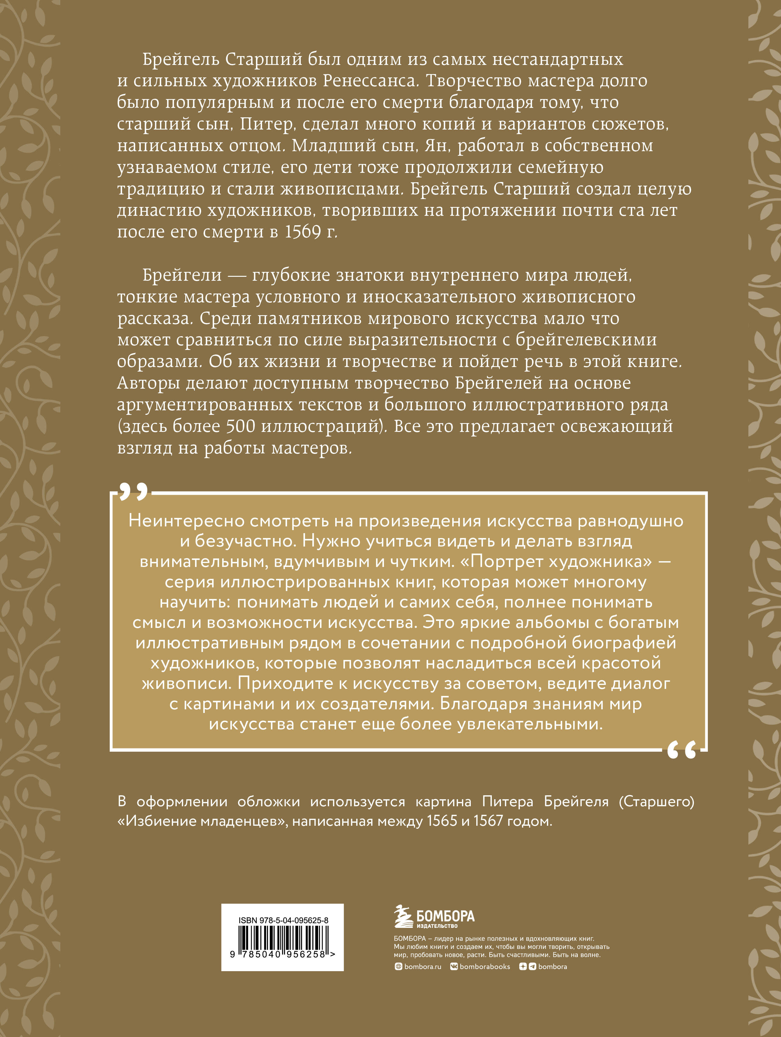 Мы поражаемся технике Брейгелей. Их кисть творила чудеса. Даже очень мелкие предметы на картинах выписаны так искусно, что их можно рассмотреть в деталях. Это очень богато иллюстрированное издание отправляет зрителя в истинное путешествие открытий через картины и шаг за шагом раскрывает многослойный, часто морализирующий смысл многих деталей. Авторы делают доступным творчество Брейгелей на основе обширных и содержательно аргументированных текстов. Все это предлагает освежающий взгляд на работы мастеров. Приходите к искусству за советом, ведите диалог с картинами и их создателями. Благодаря серии «Портрет художника» мир искусства станет еще более увлекательным.| Издательство | Эксмо |