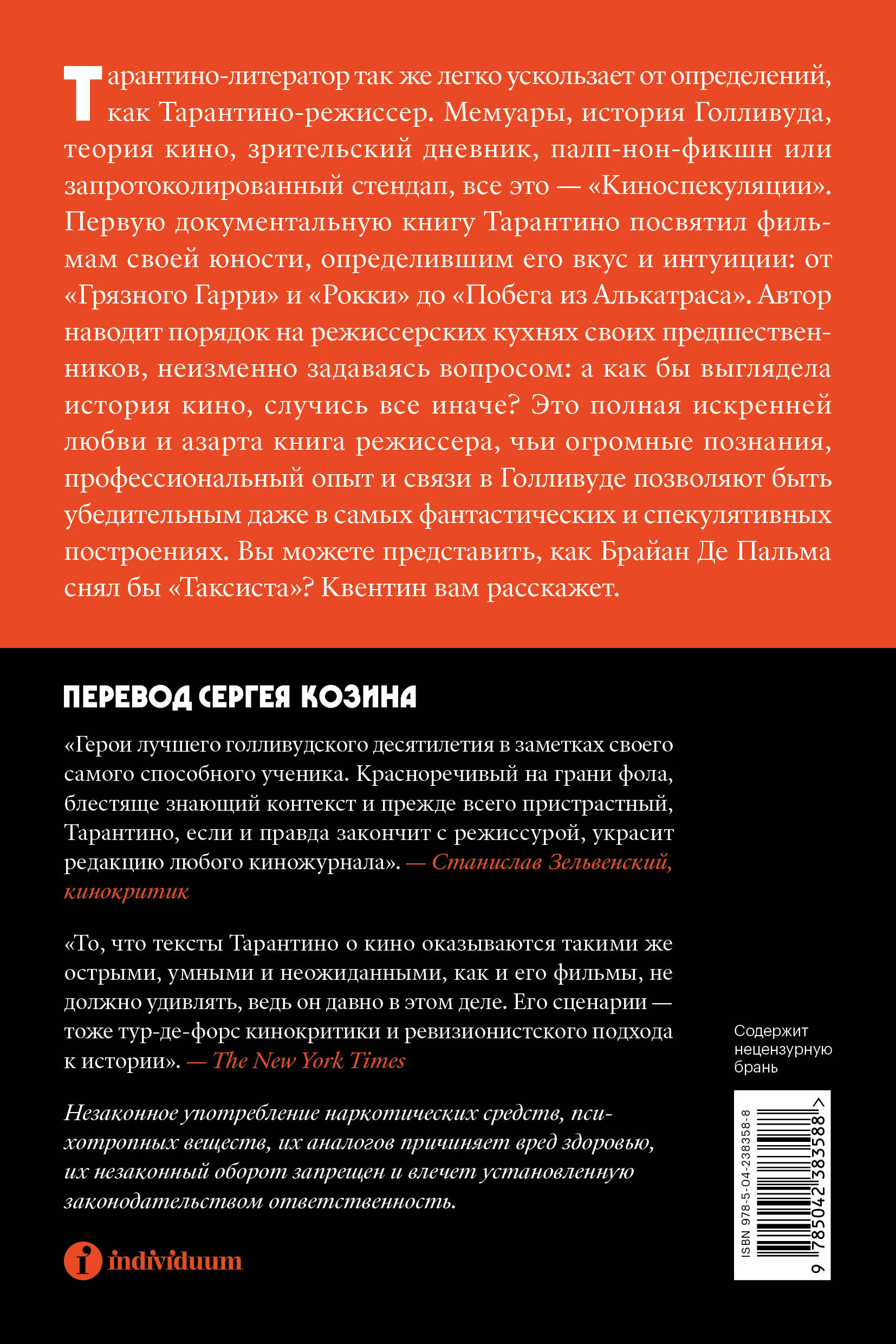 НЕЗАКОННОЕ ПОТРЕБЛЕНИЕ НАРКОТИЧЕСКИХ СРЕДСТВ, ПСИХОТРОПНЫХ ВЕЩЕСТВ, ИХ АНАЛОГОВ ПРИЧИНЯЕТ ВРЕД ЗДОРОВЬЮ, ИХ НЕЗАКОННЫЙ ОБОРОТ ЗАПРЕЩЕН И ВЛЕЧЕТ УСТАНОВЛЕННУЮ ЗАКОНОДАТЕЛЬСТВОМ ОТВЕТСТВЕННОСТЬ. Тарантино-литератор так же легко ускользает от определений, как Тарантино-режиссер. Мемуары, история Голливуда, теория кино, зрительский дневник, палп-нон-фикшен или запротоколированный стендап, все это - «Киноспекуляции». Первую документальную книгу Тарантино посвятил фильмам своей юности, определившим его вкус и интуиции: от «Грязного Гарри» и «Рокки» до «Побега из Алькатраса». Автор наводит порядок на режиссерских кухнях своих предшественников, неизменно задаваясь вопросом: а как бы выглядела история кино, случись все иначе? Это полная искренней любви и азарта книга режиссера, чьи огромные познания, профессиональный опыт и связи в Голливуде позволяют быть убедительным даже в самых фантастических и спекулятивных построениях. Вы можете представить, как Брайан Де Пальма снял бы «Таксиста»? Квентин вам расскажет.| Издательство | ООО "Издательство "Эксмо" |