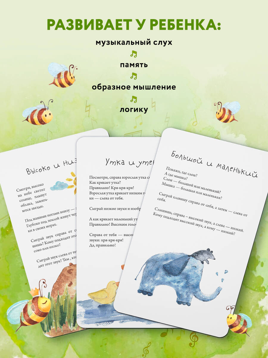 Уникальные развивающие карточки, которые помогут развить слух у вашего малыша. Игры разделены по категориям: цвет, математика, природа, время, животные, сравнения, интервалы, аккорды. Это сделано скорее для удобства. Играть можно в любом порядке и никак не привязываться к категориям и последовательности. Каждая игра направлена на изучение какого-либо музыкального свойства звука, регистра, тембра, а также развивает музыкальный слух, память, образное мышление, логику и, конечно, поможет малышу впервые прикоснуться к фортепиано и даже импровизировать! Игры-карточки построены так, чтобы с помощью образов и включения образной памяти, а также различных видов восприятия - зрительного, слухового, тактильного, - происходило не только знакомство с музыкой и клавиатурой, но и активное развитие ребенка. На каждой карточке описана одна игра и показано на клавиатуре, какие задействованы клавиши. Внутри коробки вы также найдёте подробную инструкцию по работе с карточками. Игры предназначены для детей с 0 до 3 лет.| Издательство | ООО "Издательство "Эксмо" |