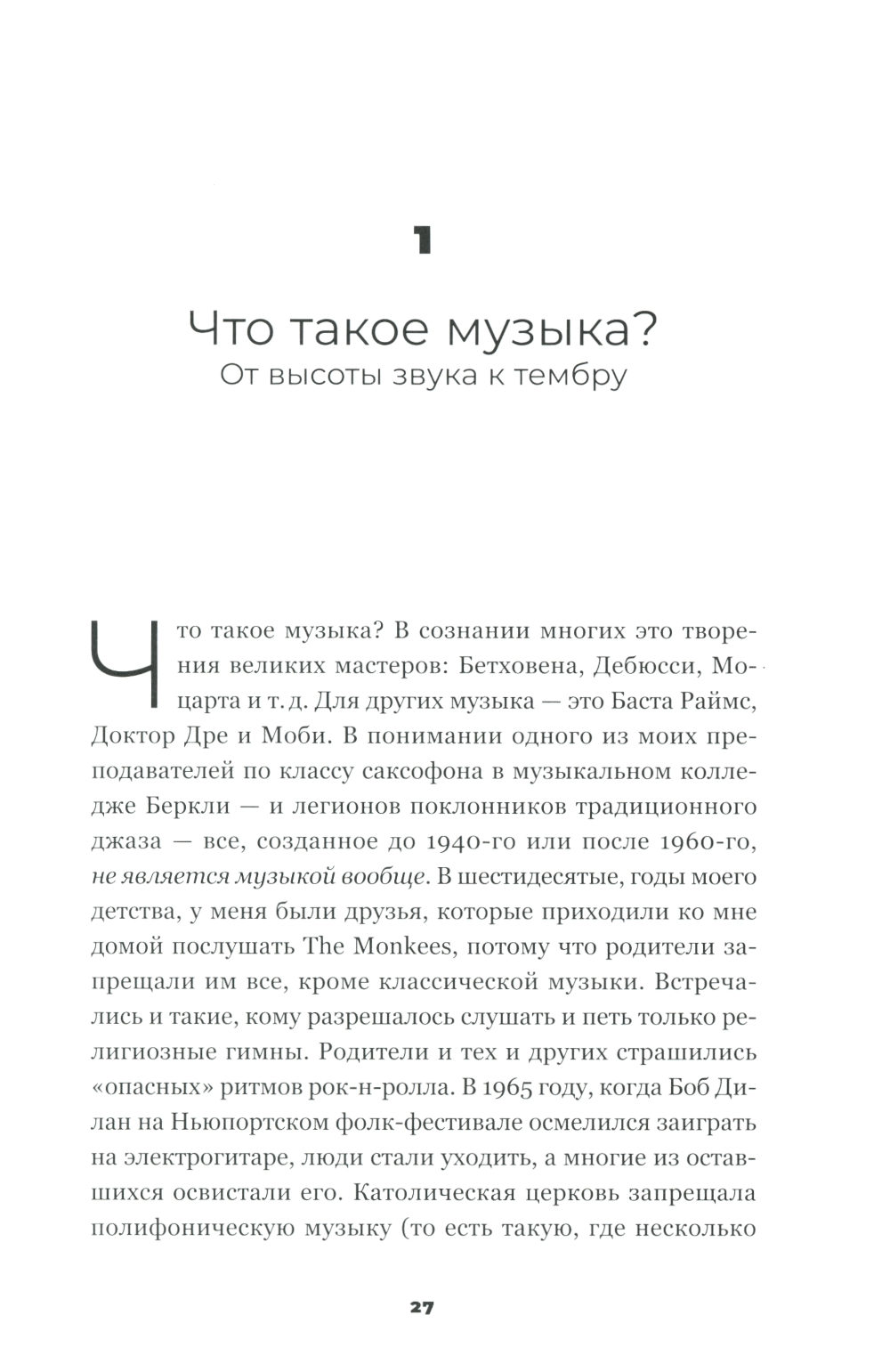Автор исследует связь между музыкой - ее исполнением, сочинением, тем, как мы ее слушаем, тем, что нам в ней нравится, - и человеческим мозгом. Вступая в диалог с выдающимися мыслителями, которые утверждают, что музыка не более чем эволюционная случайность, Левитин заявляет, что она фундаментальное свойство нашего вида. На протяжении большей части человеческой истории во всем мире сочинять и исполнять музыку было столь же естественно, как дышать и ходить, и в этом участвовали все.| Издательство | Альпина нон-фикшн |