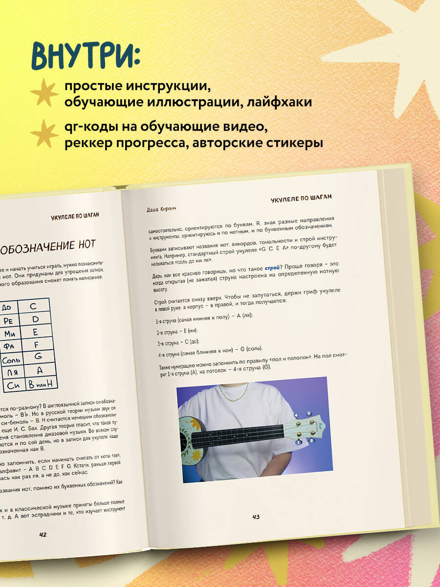 Выберите свою укулеле и научитесь играть аккомпанемент к любимым песням или сложные музыкальные композиции с помощью веселого и понятного самоучителя! Привет! Меня зовут Даша, мне 23 года. Живу в Питере, коллекционирую свинку Пеппу и играю на укулеле. Я дипломированная преподавательница музыки, видеоблогерка и укулеле-инфлюенсерка. На моем канале более 200 тысяч подписчиков. Большинство учебников по укулеле написаны сухим, устаревшим языком, мне же захотелось создать красочную и интерактивную книгу с аудиопримерами, видео и обратной связью! И теперь она перед вами. У этого самоучителя нет возрастного ограничения. Главное, чтобы ты умел читать и разглядывать картинки. Также необязательно иметь за плечами музыкальное образование. Всю информацию, которую я рассказываю в книге, поймет каждый. Здесь не будет сложной музыкальной теории, я постараюсь объяснить сложные вещи простым языком. Чтобы твое обучение происходило качественно, делай пометки прямо в книге, а лучше заведи блокнот в удобном для тебя формате и записывай туда новые вещи, такие как: схемы аккордов и аккомпанемента, различные техники. На протяжении всей книги я буду вести с тобой диалог, рассказывать лайфхаки, советы, секреты. У тебя будет ощущение, что я прямо сейчас нахожусь рядом. Ну и не забывай, что можешь присылать мне на проверку свои успехи - видео можно скинуть в любую мою соцсеть, я всё посмотрю! Чтобы обучение проходило с большей пользой, к упражнениям я записала специальные ролики на YouTube, перейти на которые ты можешь по QR-кодам в книге, а также внутри ты найдешь трекер для отслеживания прогресса в игре и словарь терминов. В качестве приятного бонуса вместе с каждой книгой ты получишь набор авторских стикеров, которыми сможешь украсить свой инструмент. Занимайся хотя бы по десять минут в день, развивай технику, получай удовольствие и помни, что укулеле - это не просто инструмент, а стиль жизни!| Издательство | ООО "Издательство "Эксмо" |
