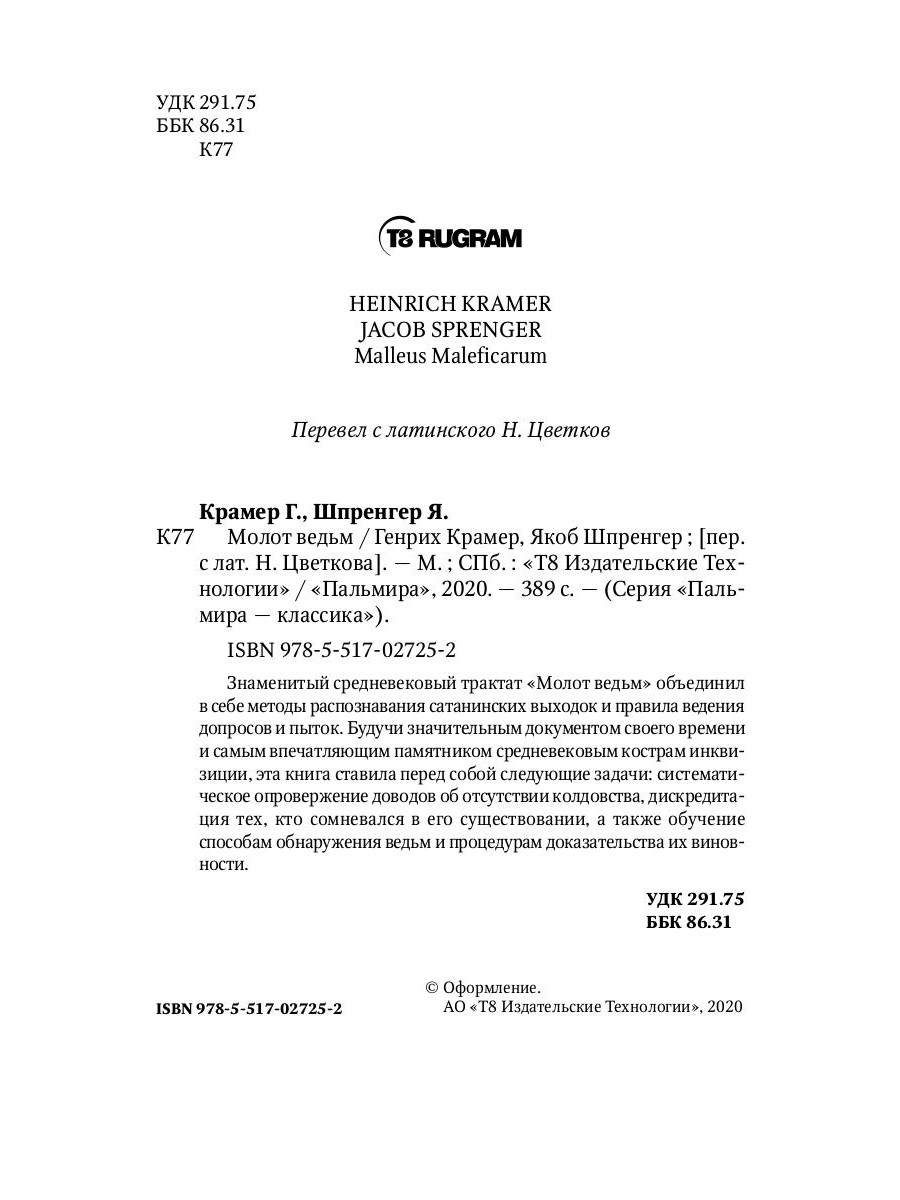 Знаменитый средневековый трактат «Молот ведьм» объединил в себе методы распознавания сатанинских выходок и правила ведения допросов и пыток. Будучи значительным документом своего времени и самым впечатляющим памятником средневековым кострам инквизиции, эта книга ставила перед собой следующие задачи: систематическое опровержение доводов об отсутствии колдовства, дискредитация тех, кто сомневался в его существовании, а также обучение способам обнаружения ведьм и процедурам доказательства их виновности.