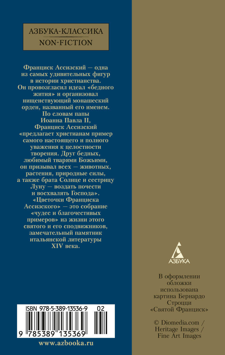 Франциск Ассизский - одна из самых удивительных фигур в истории христианства. Он провозгласил идеал "бедного жития" и организовал нищенствующий монашеский орден, названный его именем. По словам Папы Иоанна Павла II, Франциск Ассизский "предлагает христианам пример самого настоящего и полного уважения к целостности творения. Друг бедных, любимый тварями Божьими, он призывал всех - животных, растения, природные силы, а также брата Солнце и сестрицу Луну - воздать почести и восхвалять Господа". "Цветочки Франциска Ассизского" - это собрание "чудес и благочестивых примеров" из жизни этого святого и его сподвижников, замечательный памятник итальянской литературы XIV века.| Издательство | Азбука-Аттикус Издат.группа ООО |