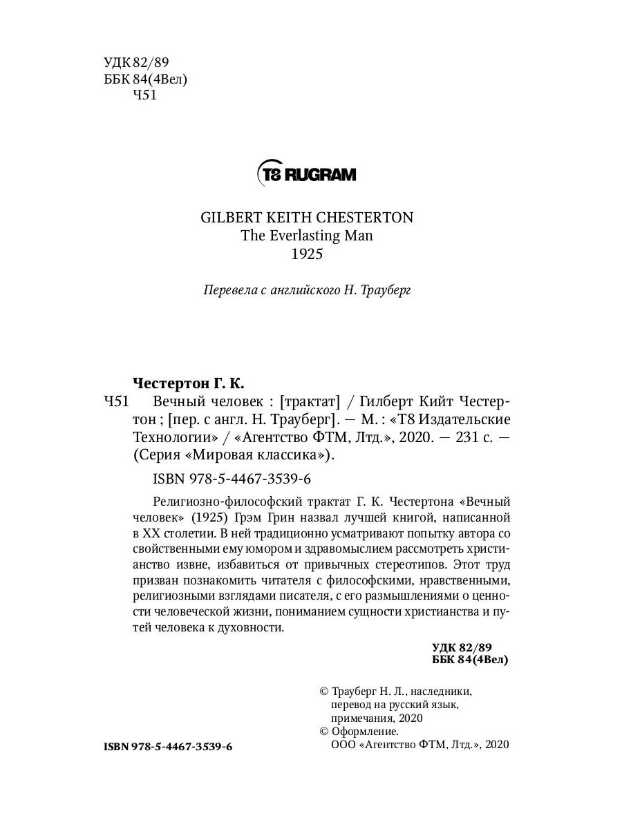 Религиозно-философский трактат Г. К. Честертона «Вечный человек» (1925) Грэм Грин назвал лучшей книгой, написанной в XX столетии. В ней традиционно усматривают попытку автора со свойственными ему юмором и здравомыслием рассмотреть христианство извне, избавиться от привычных стереотипов. Этот труд призван познакомить читателя с философскими, нравственными, религиозными взглядами писателя, с его размышлениями о ценности человеческой жизни, пониманием сущности христианства и путей человека к духовности.| Издательство | Т8 RUGRAM |