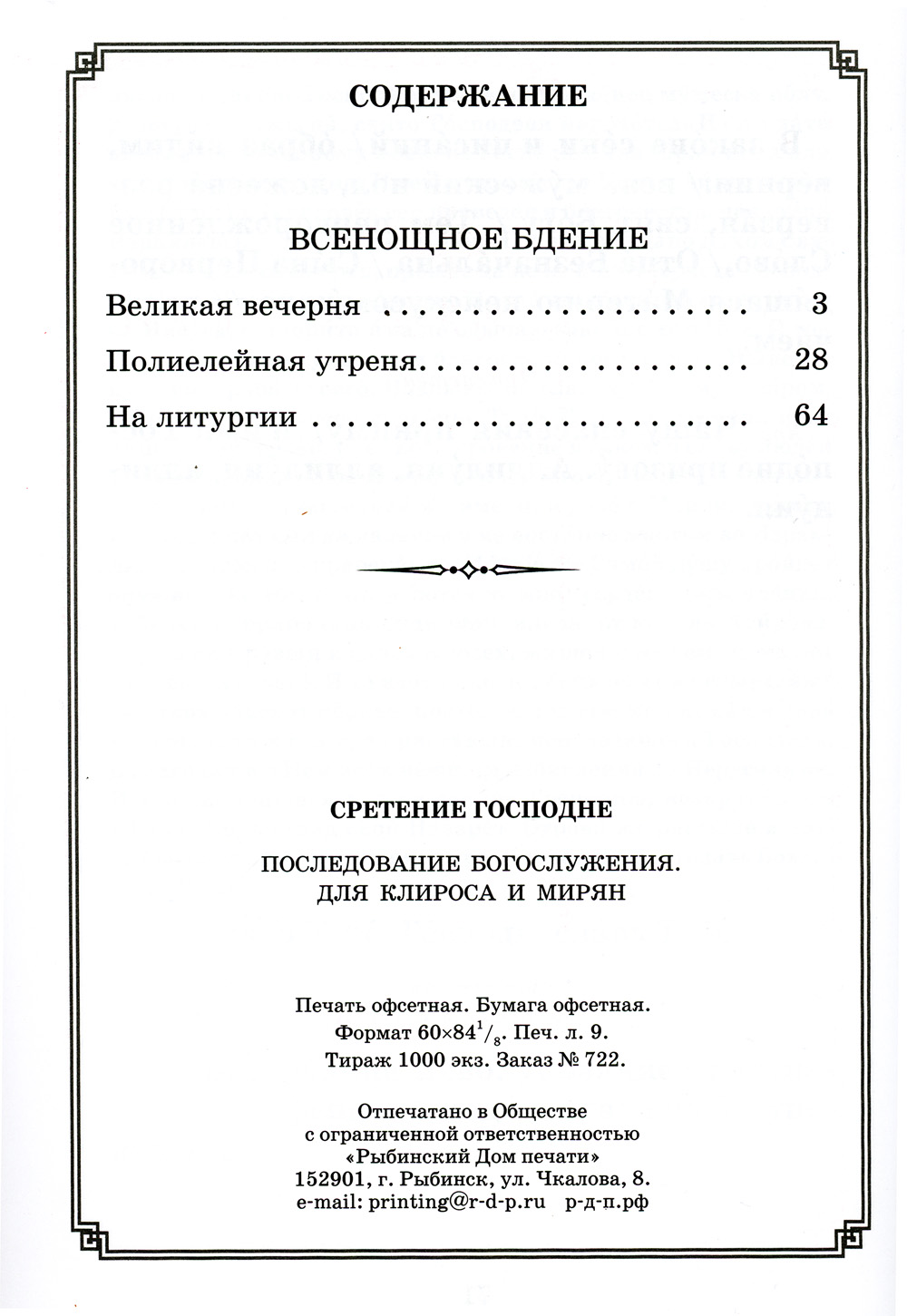 В книге содержится последование Всенощного бдения праздника Сретения, а также изменяемые песнопения праздничной Литургии. Двухцветная печать, традиционная для богослужебных изданий, облегчает визуальное восприятие. Неизменяемые нотные песнопения и текст чтеца набраны средним шрифтом, а изменяемые песнопения - укрупненным, с ударениями и разметкой для пения. Текст службы сопровождают указания, которые помогут регенту на богослужении, а также примечания, отображающие приходские традиции.| Издательство | Синопсисъ |