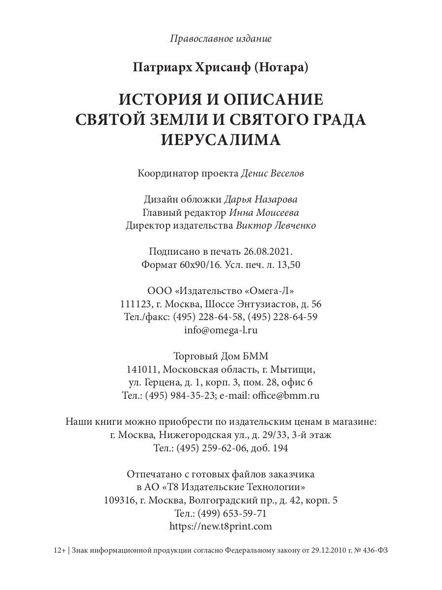 Патриарх Хрисанф (Нотара) - Патриарх града Иерусалима и всей Палестины, греческий ученый и видный деятель греческого просвещения XVIII века. Его сочинение занимает почетное место в ряду православных сочинений о топографии Палестины. В нем он передал свои взгляды о стране и как ученый, и как путешественник, изучивший Иерусалим опытным путем. Воспроизведено в оригинальной авторской орфографии издания 1887 года (Вас. Остр. : Типография Императорской Академии Наук, 1887. - 188 с.).| Издательство | Омега-Л |