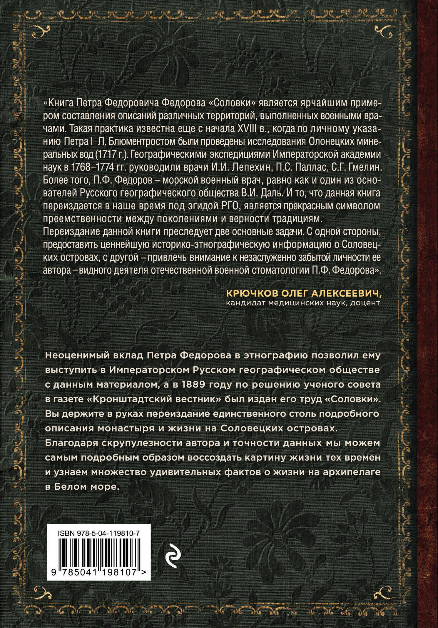 Великий Соловецкий монастырь. Чем он притягивает к себе людей со всей России, что заставляет их претерпевать невзгоды, пересекать ледяные воды Севера? Как много исторических тайн и святынь хранит в себе обитель? Наиболее полное описание жизни Соловецкого монастыря теперь доступно в одной книге. Из этой книги вы узнаете: · Особенности климата, флоры и фауны Соловецкого монастыря. · Истории наемных рабочих, военных, ссыльных и арестантов. · Чем жили и как питались в монастыре. И много других малоизвестных фактов об укладе жизни Соловецкого монастыря, входящего в список Всемирного наследия ЮНЕСКО.| Издательство | ООО "Издательство "Эксмо" |