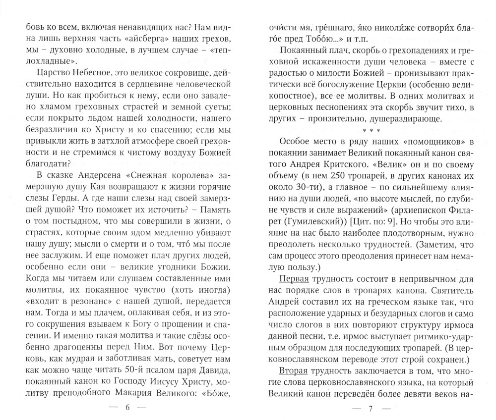 Книга содержит текст Великого покаянного канона святого Андрея Критского, читаемого целиком на пятой седмице Великого поста, переводы ирмосов и тропарей канона на русский язык, а также комментарии, в которых раскрывается значение малопонятных церковнославянских слов и словосочетаний и приводятся катехизические, вероучительные пояснения. В начале книги помещены краткие очерки о «блаженном плаче», о Великом каноне и его составителе. Издание предназначено, прежде всего, для тех, кто делает первые шаги в понимании церковных молитв, основ христианского вероучения и духовной жизни. Полезной книга будет и для тех, кто уже многие годы слушал или читал Великий канон, но неправильно (или не совсем правильно) понимает смысл некоторых встречающихся в нем слов и выражений.| Издательство | Скрижаль |